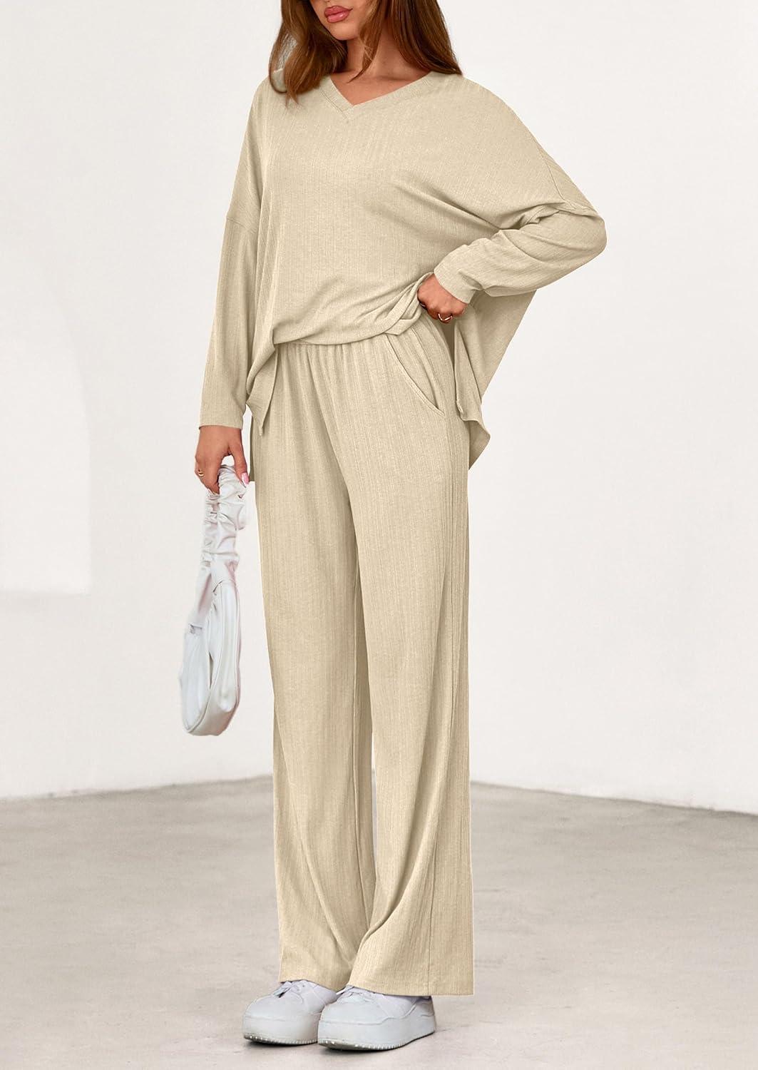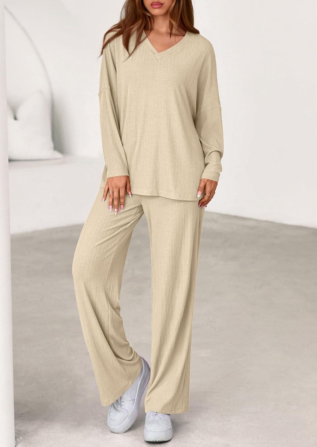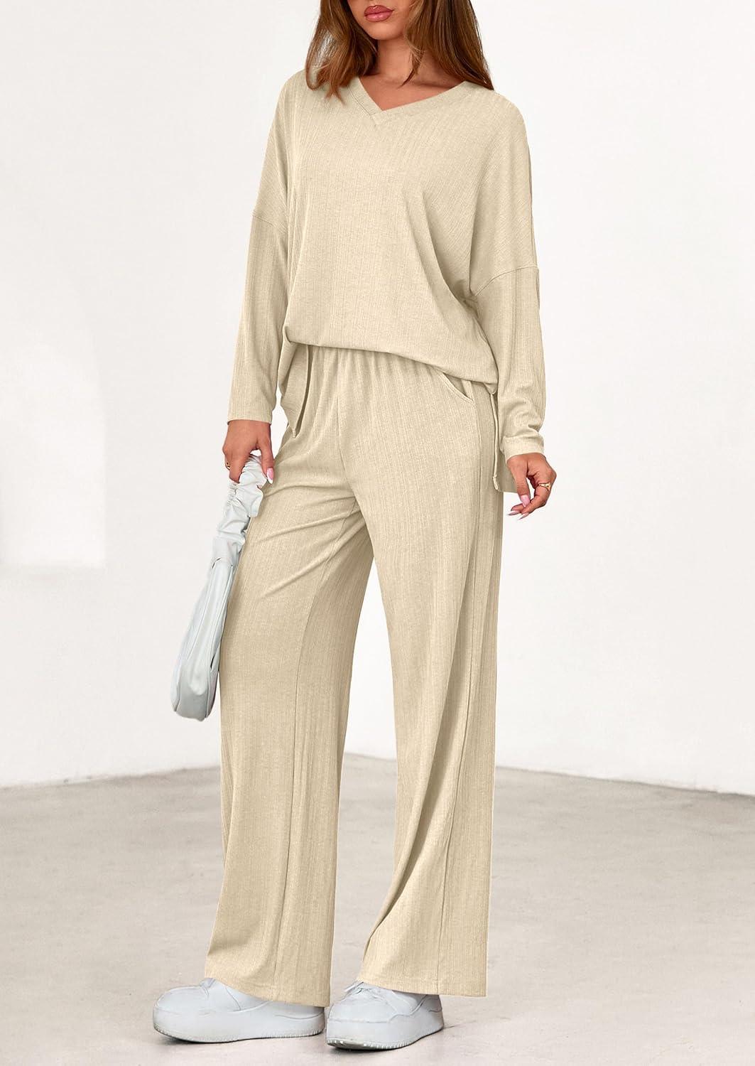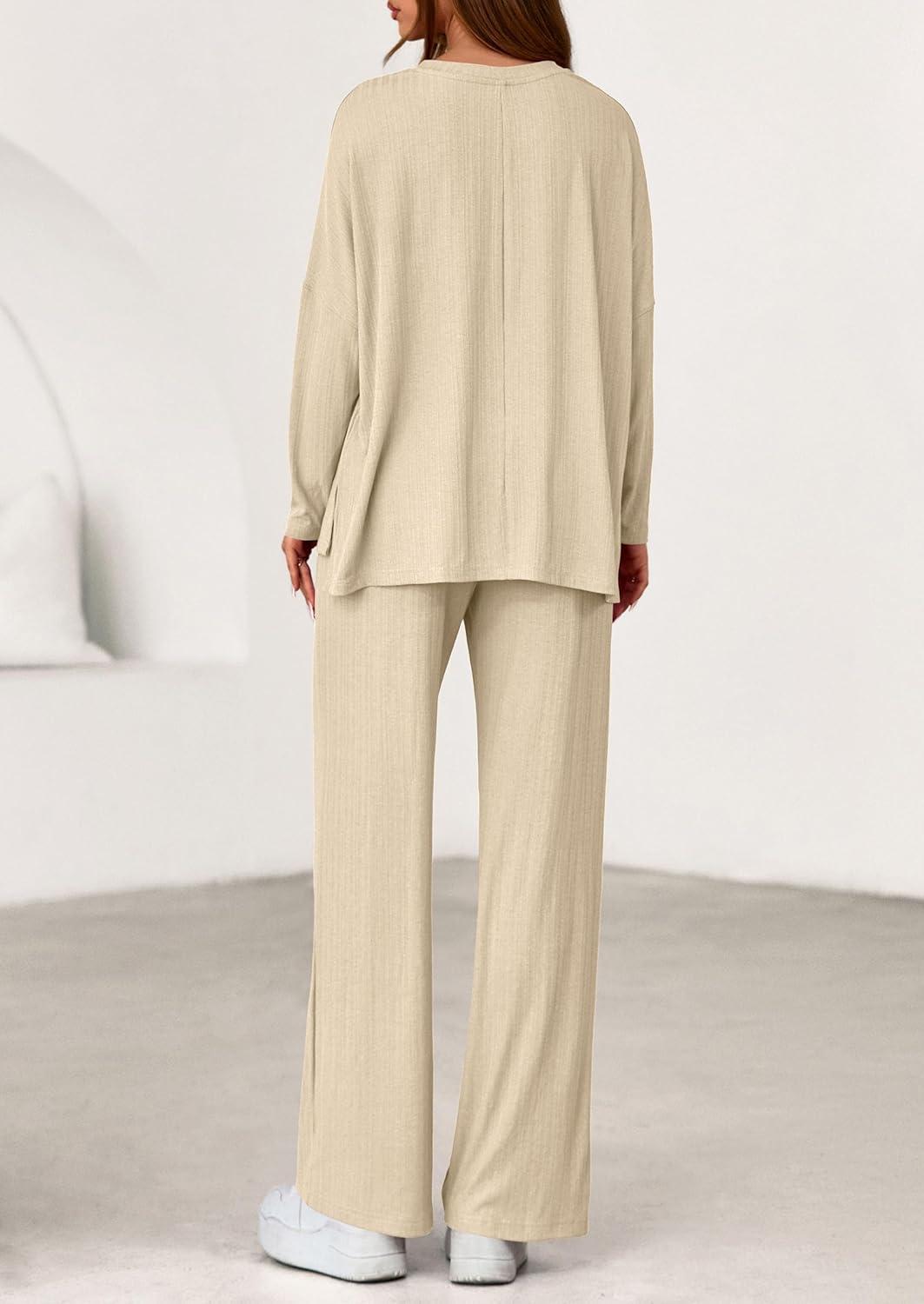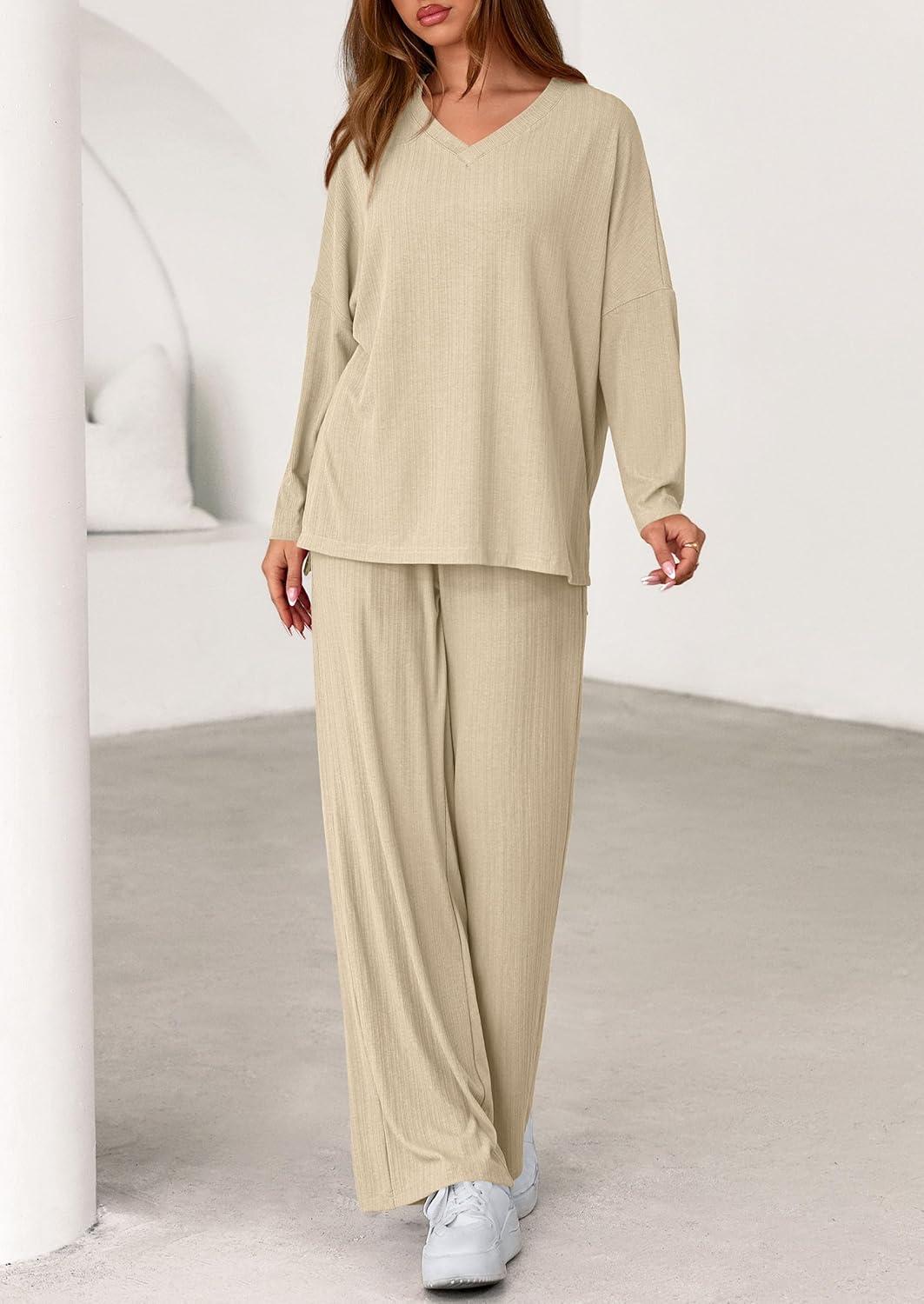 PRETTYGARDEN 2 Piece Lounge Sets for Women Fall Outfits 2025 Casual Loose Long Sleeve Tops Wide Leg Pants Matching Pajama Set(Beige)