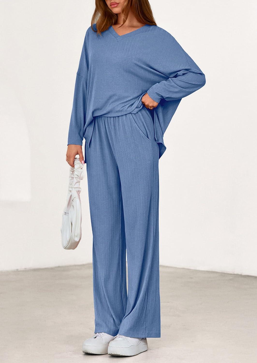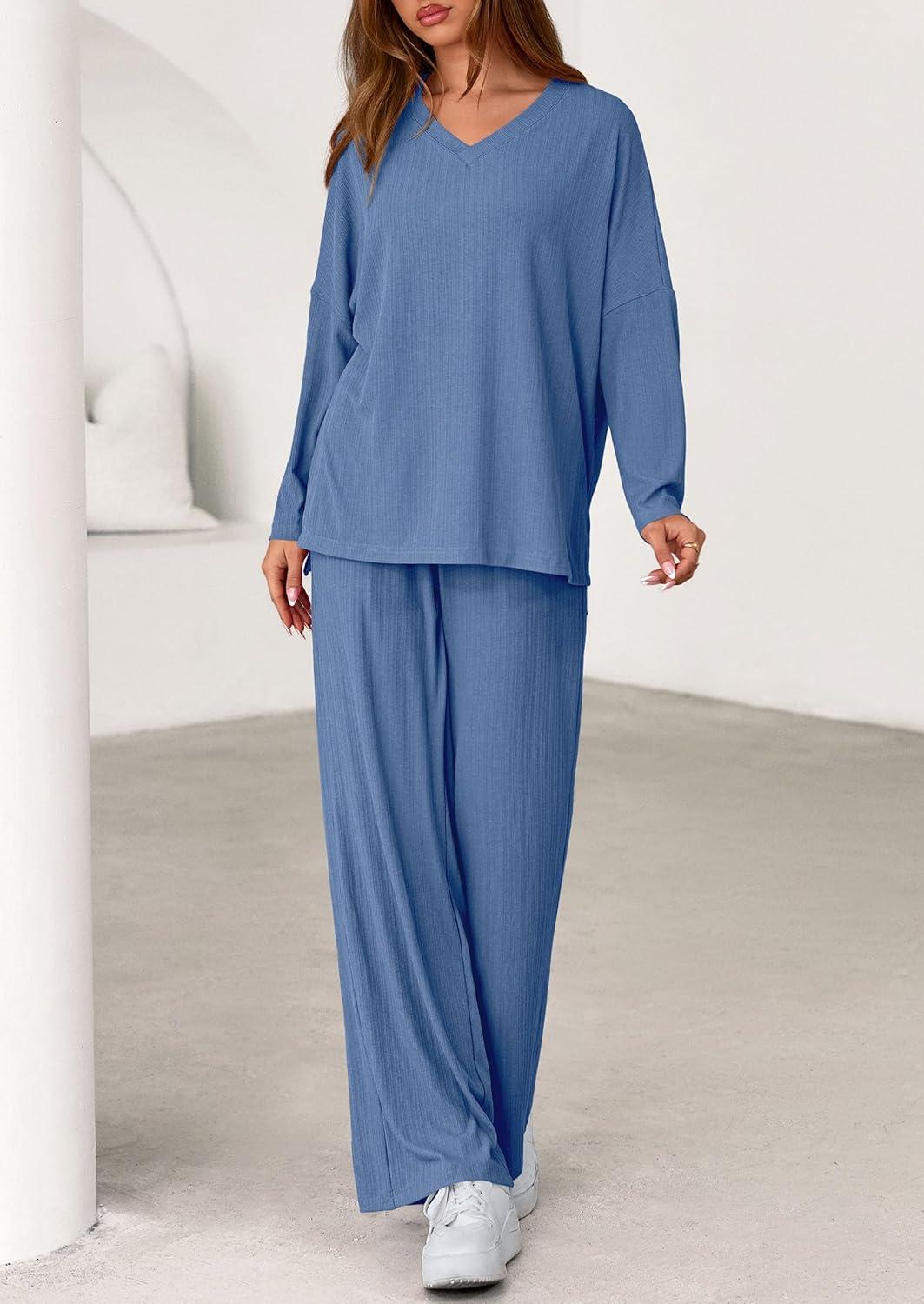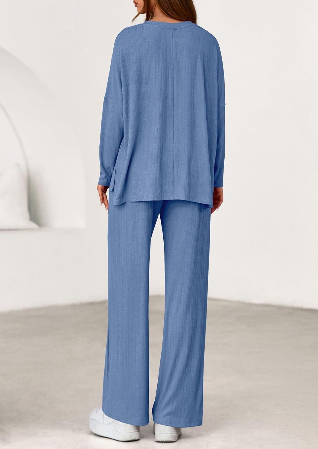 PRETTYGARDEN 2 Piece Lounge Sets for Women Fall Outfits 2025 Casual Loose Long Sleeve Tops Wide Leg Pants Matching Pajama Set(Grey Blue)