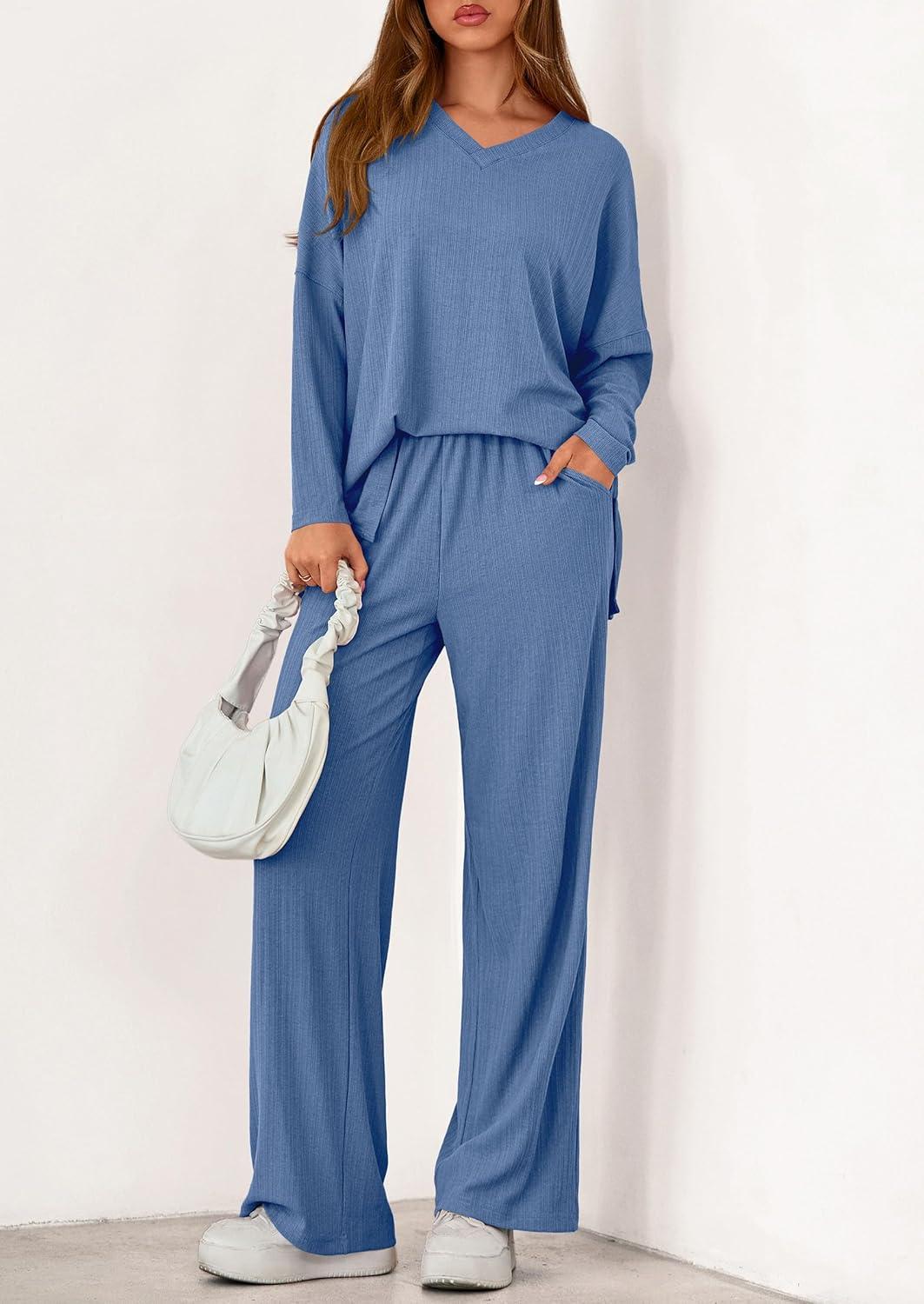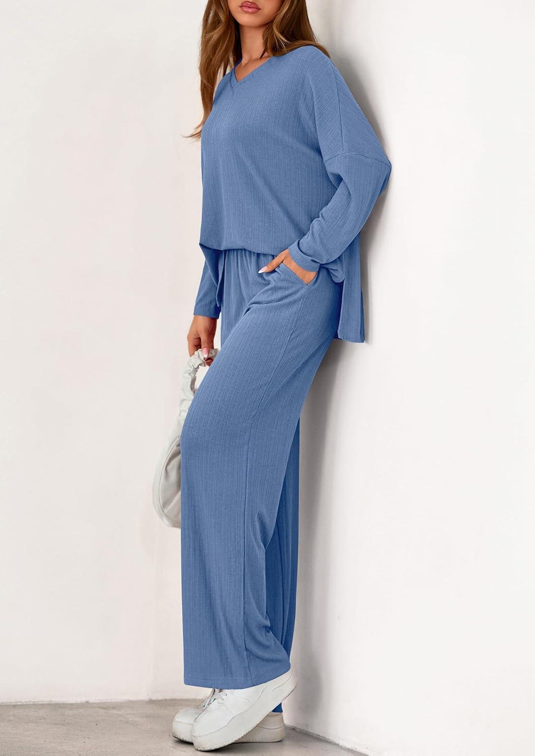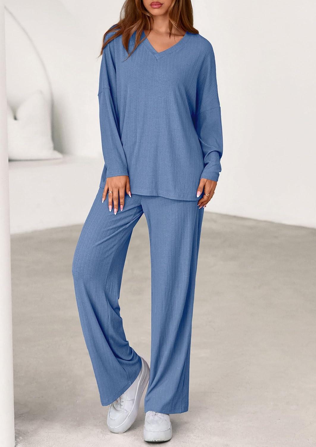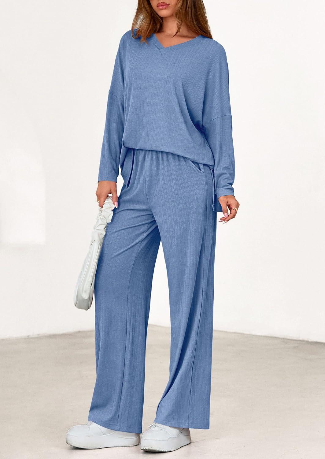 PRETTYGARDEN 2 Piece Lounge Sets for Women Fall Outfits 2025 Casual Loose Long Sleeve Tops Wide Leg Pants Matching Pajama Set(Grey Blue)