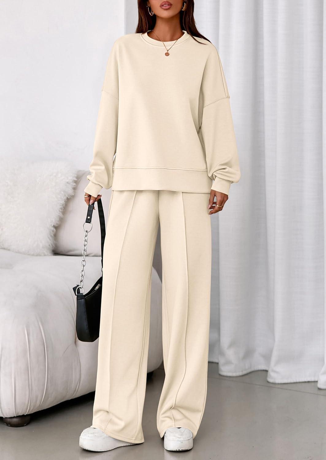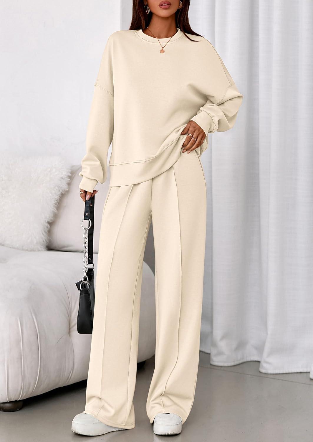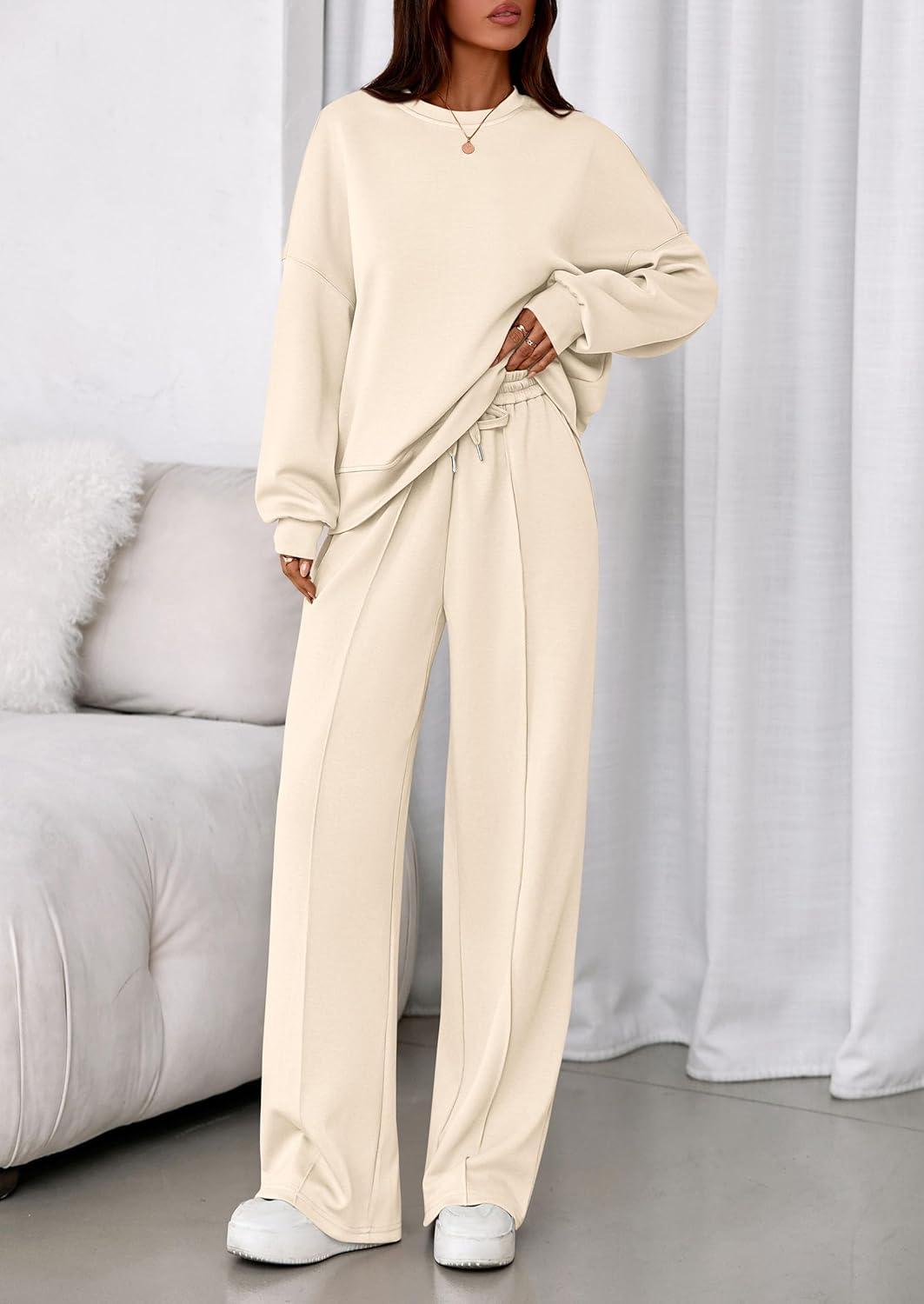 PRETTYGARDEN 2 Piece Sets For Women Fall Trendy Long Sleeve Sweatshirt Wide Leg Pants Loungewear Set Matching Sweatsuit(Beige)