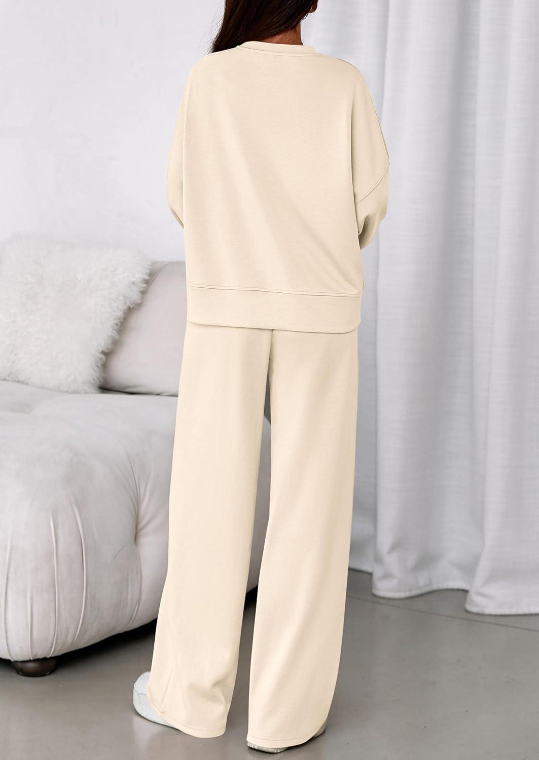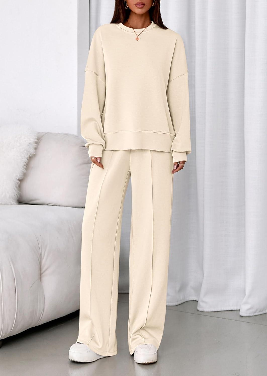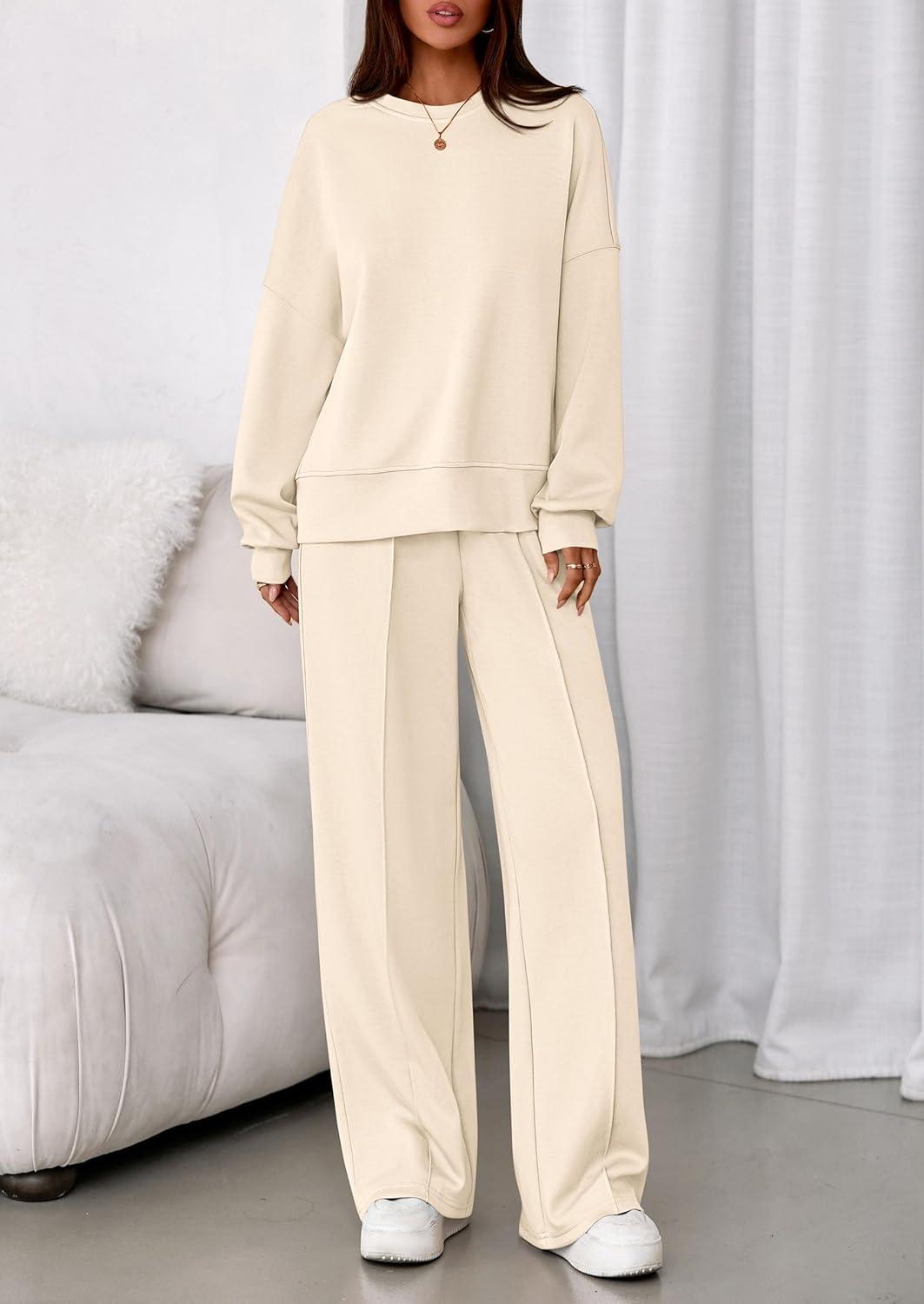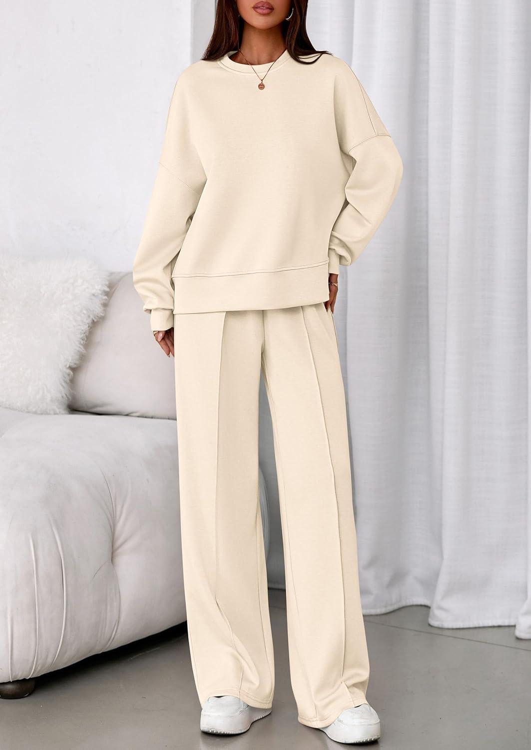 PRETTYGARDEN 2 Piece Sets For Women Fall Trendy Long Sleeve Sweatshirt Wide Leg Pants Loungewear Set Matching Sweatsuit(Beige)