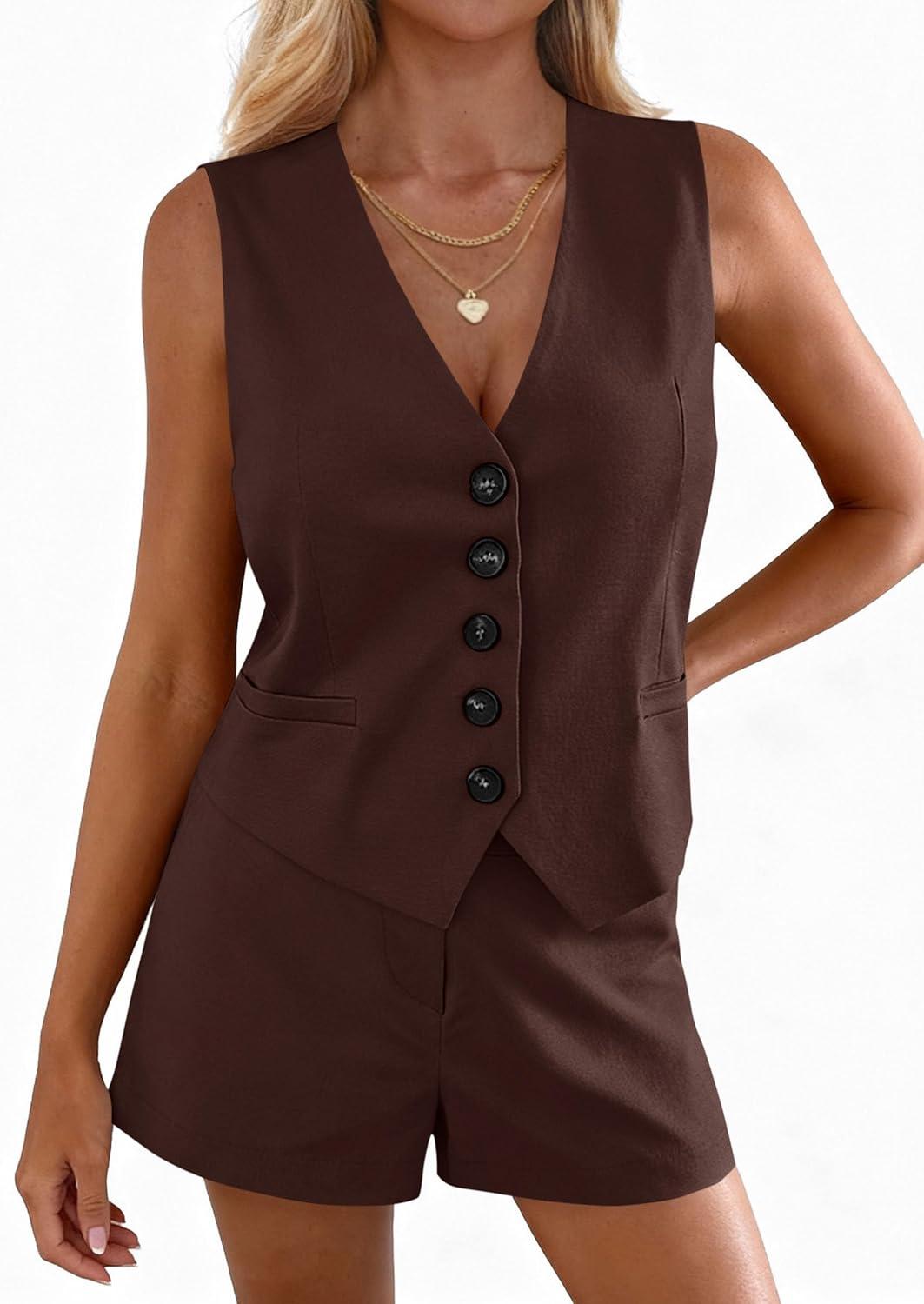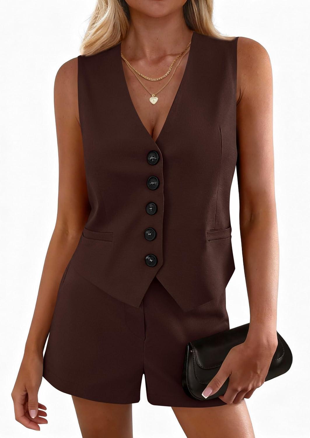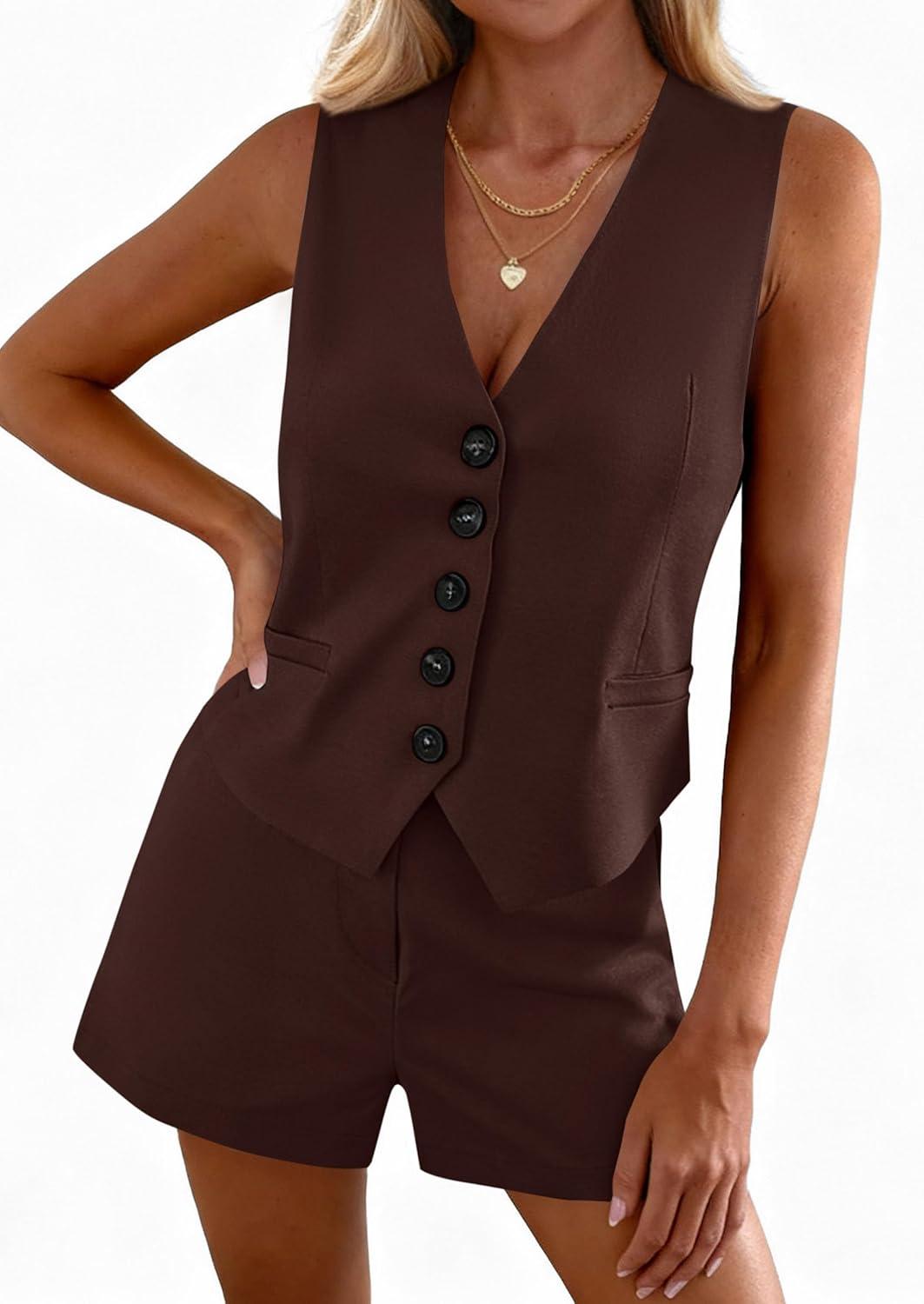 imagePRETTYGARDEN 2 Piece Sets for Women Spring Fashion 2026 Button Vest Tops High Waist Shorts Summer Business Casual OutfitsBrown