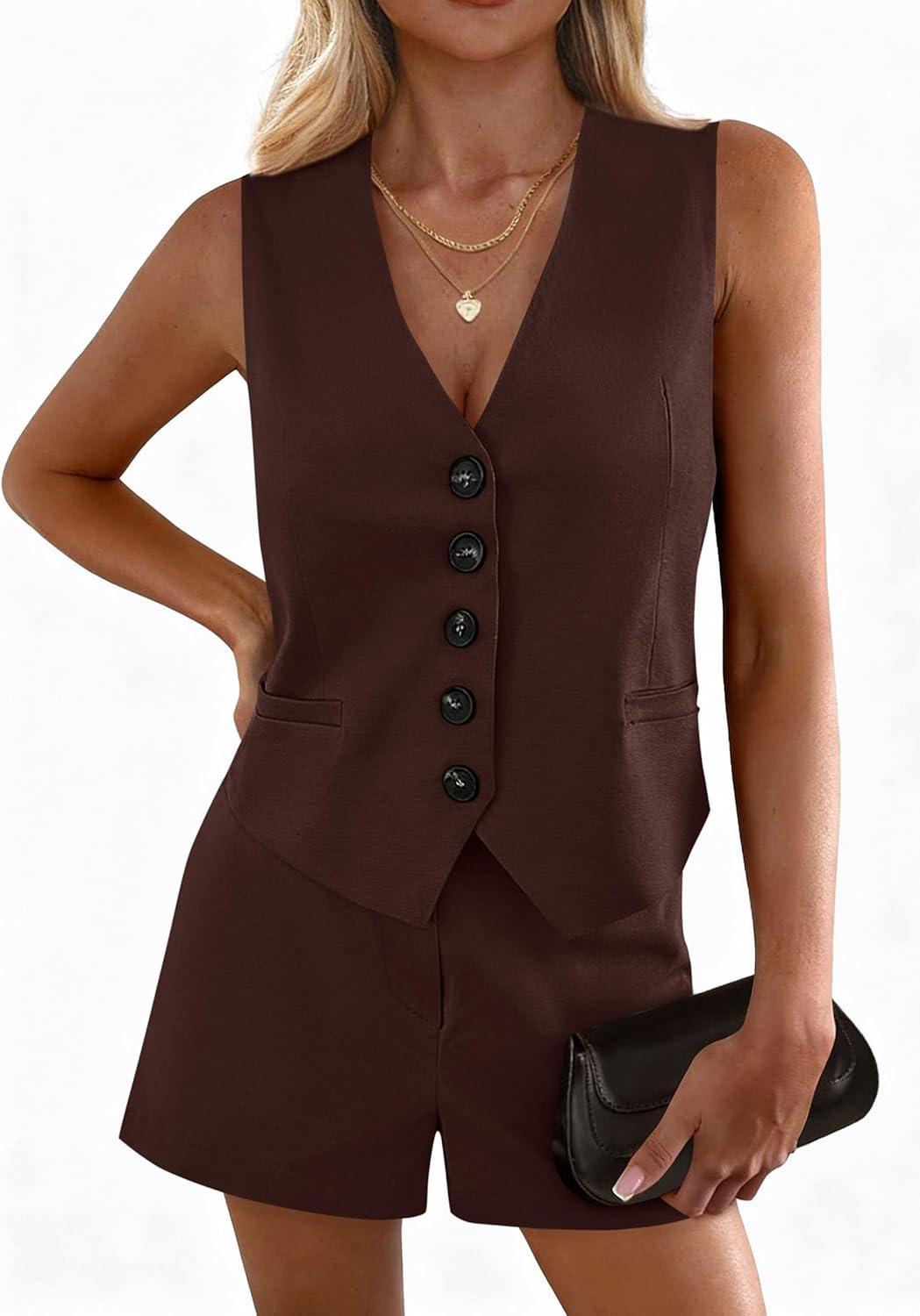 PRETTYGARDEN 2 Piece Sets for Women Spring Fashion 2026 Button Vest Tops High Waist Shorts Summer Business Casual Outfits(Brown)