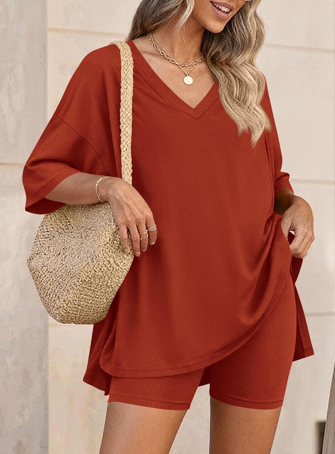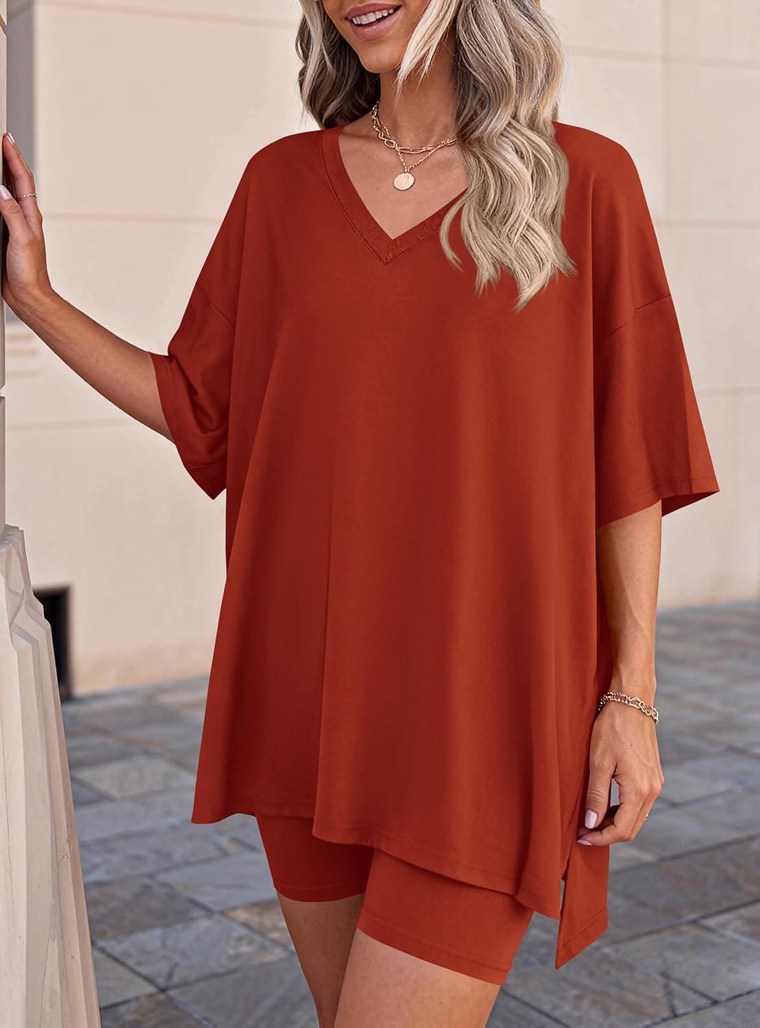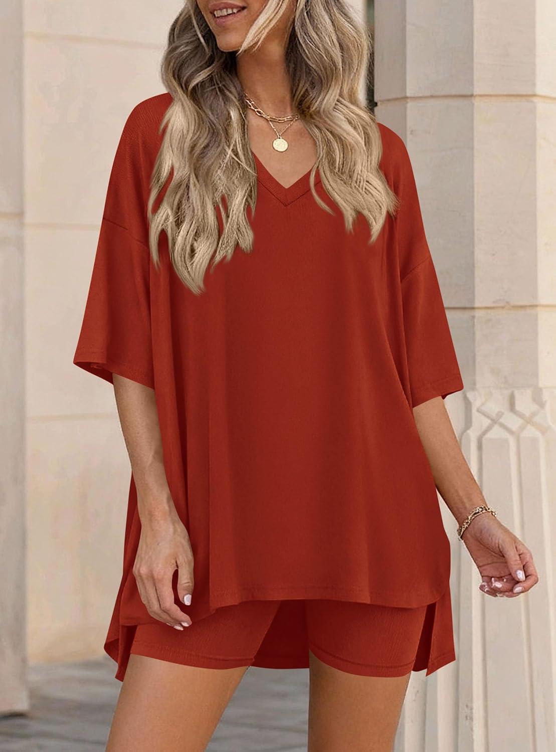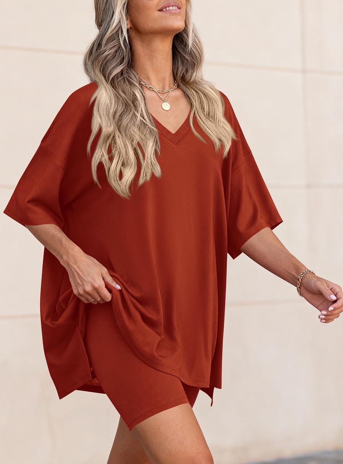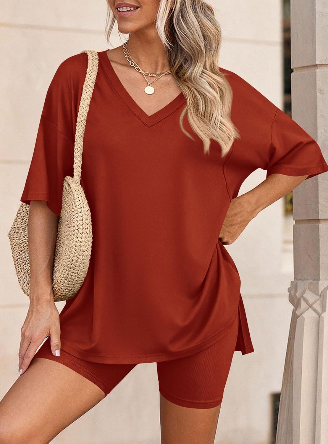 PRETTYGARDEN 2 Piece Sets for Women Summer 2026 Lounge Short Set Spring Matching Biker Shorts V Neck Oversized Shirt Clothing(Brick Red)