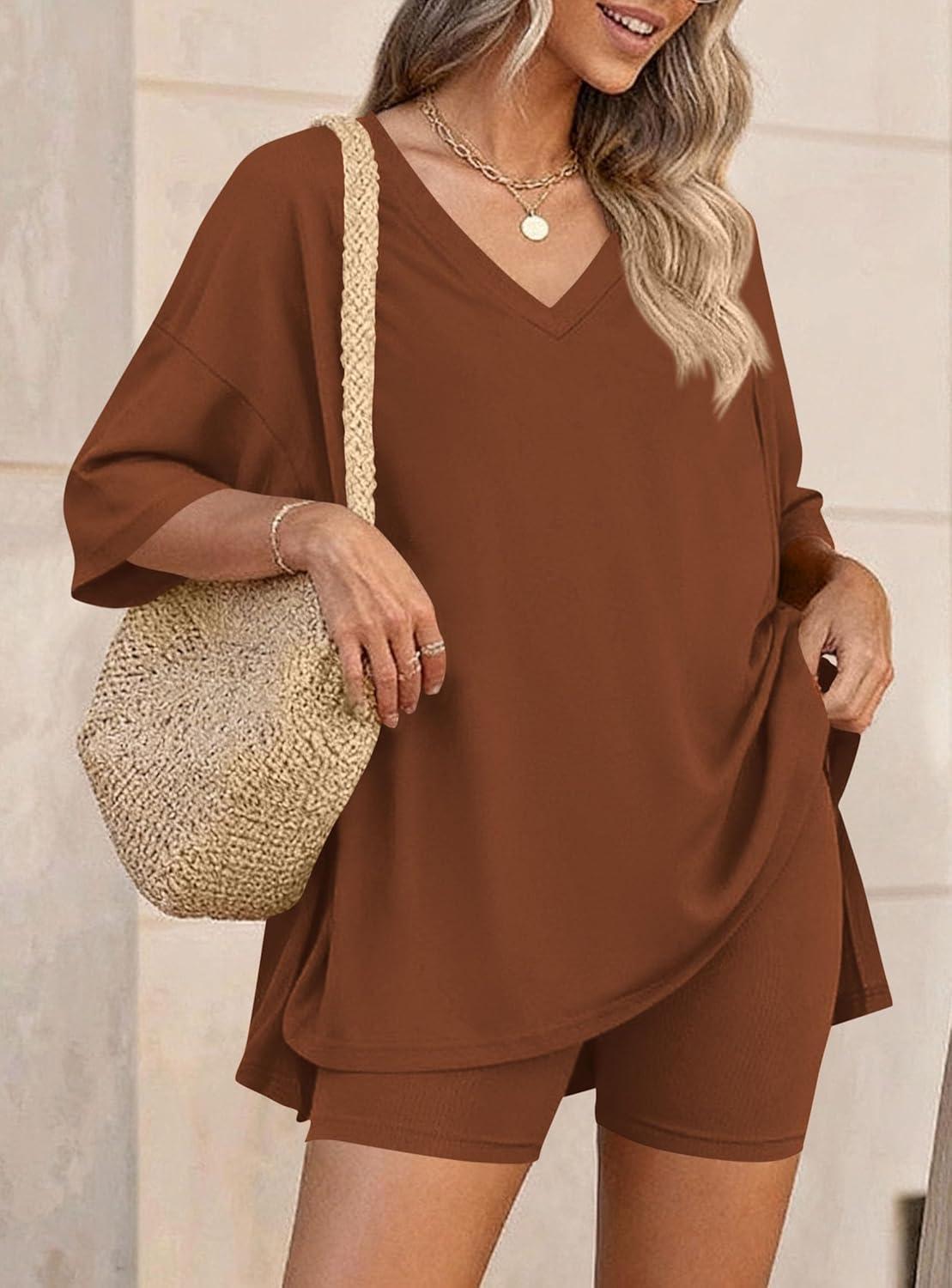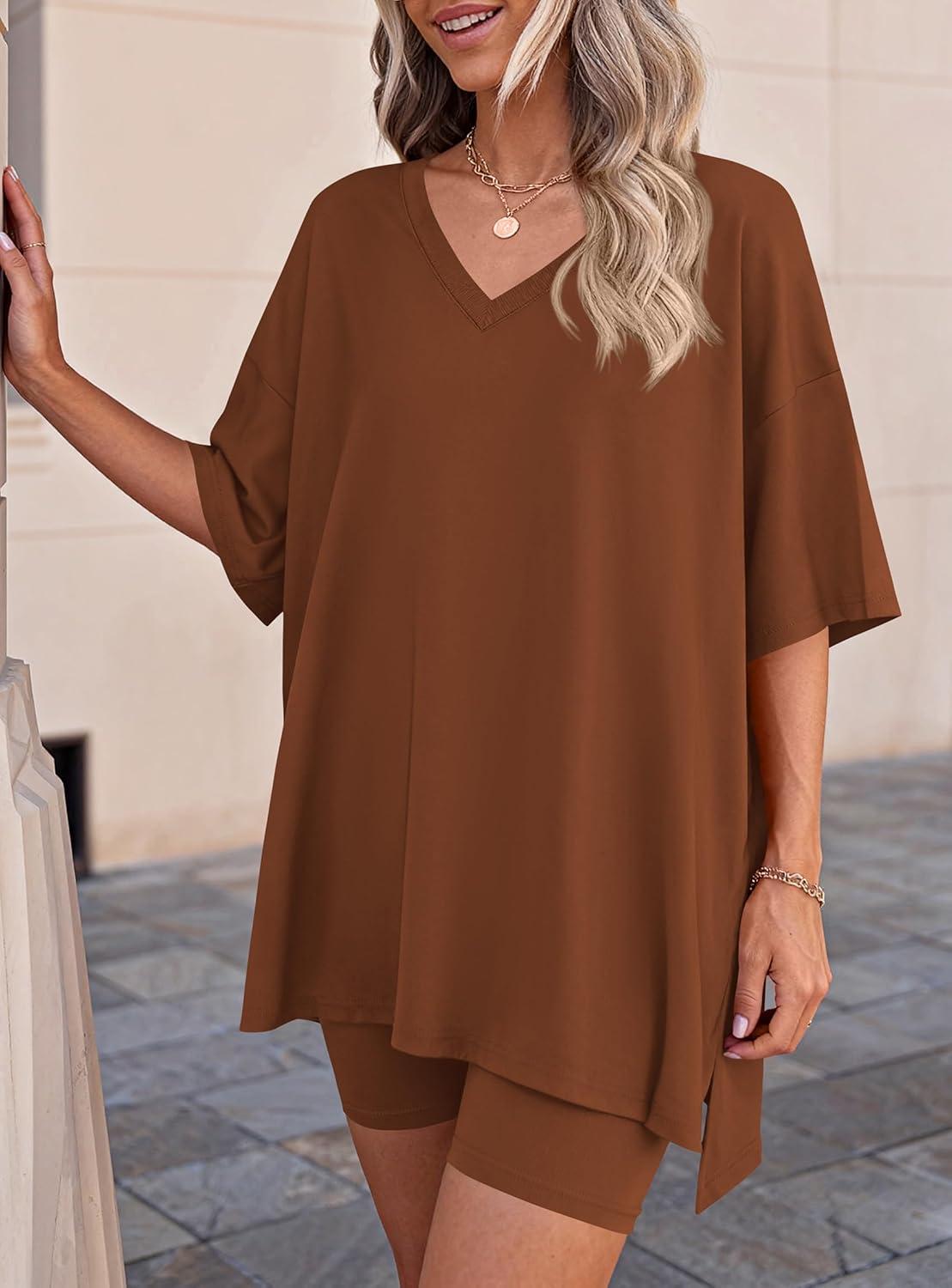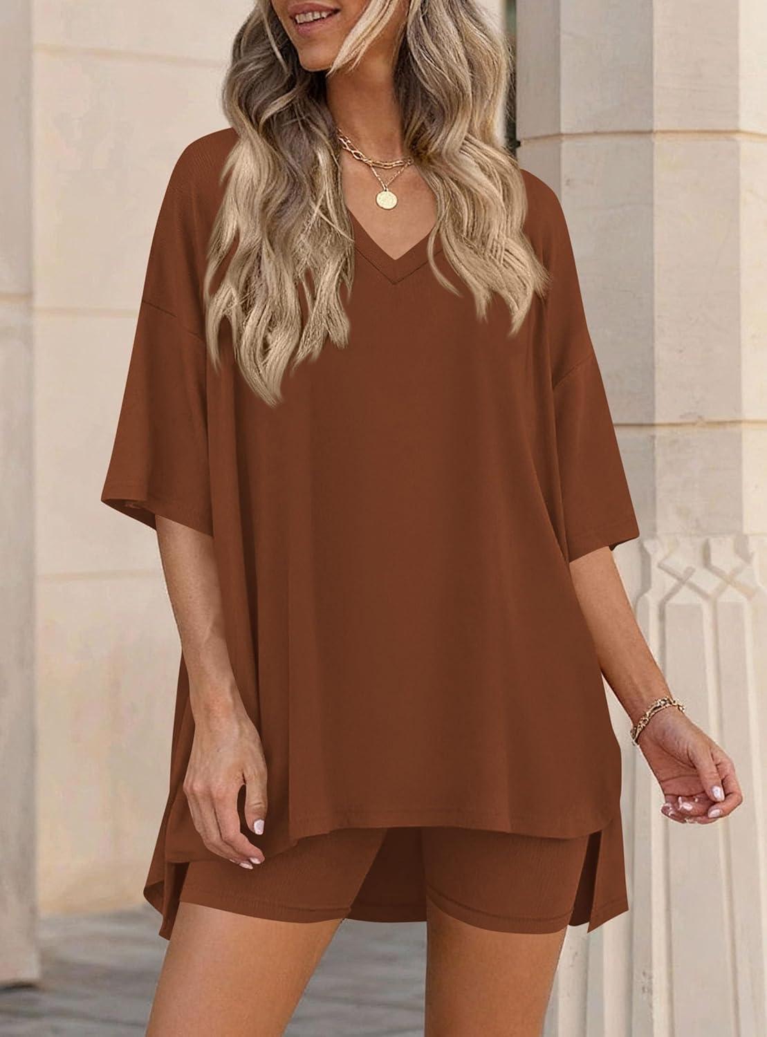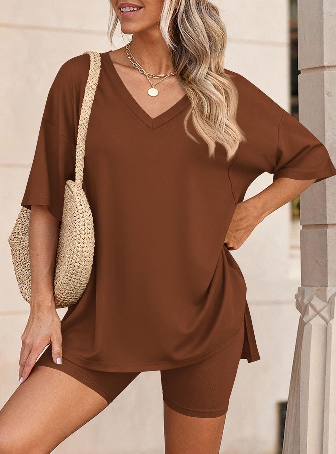 PRETTYGARDEN 2 Piece Sets for Women Summer 2026 Lounge Short Set Spring Matching Biker Shorts V Neck Oversized Shirt Clothing(Brown)