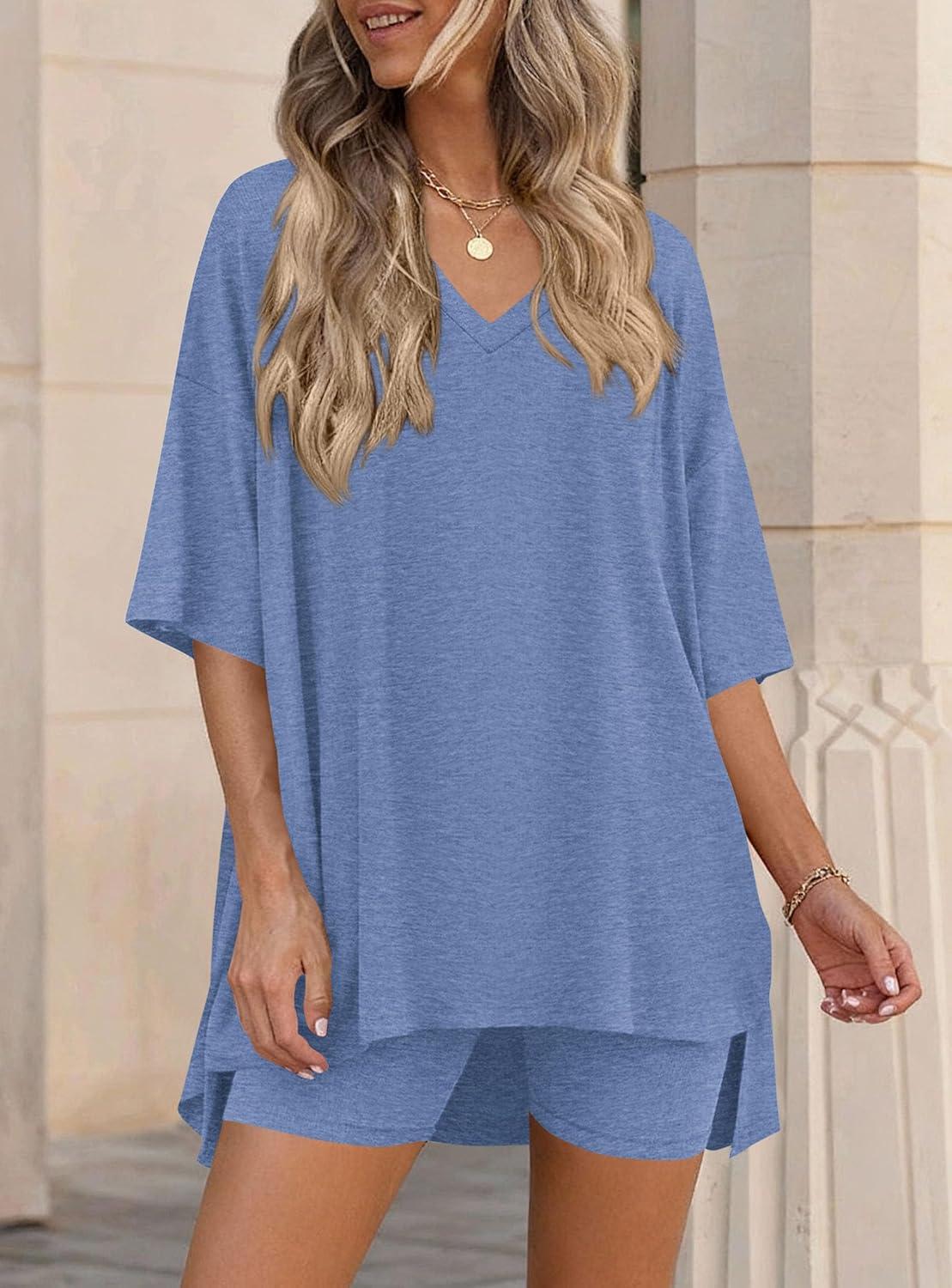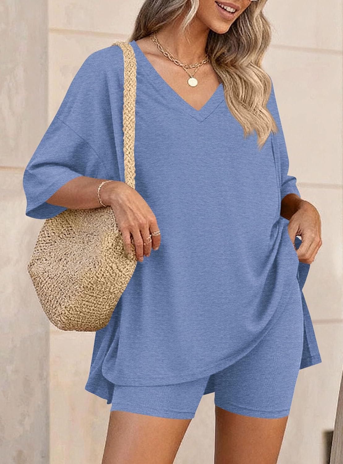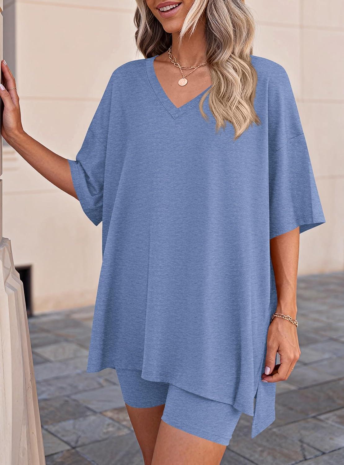 PRETTYGARDEN 2 Piece Sets for Women Summer 2026 Lounge Short Set Spring Matching Biker Shorts V Neck Oversized Shirt Clothing(Grey Blue)