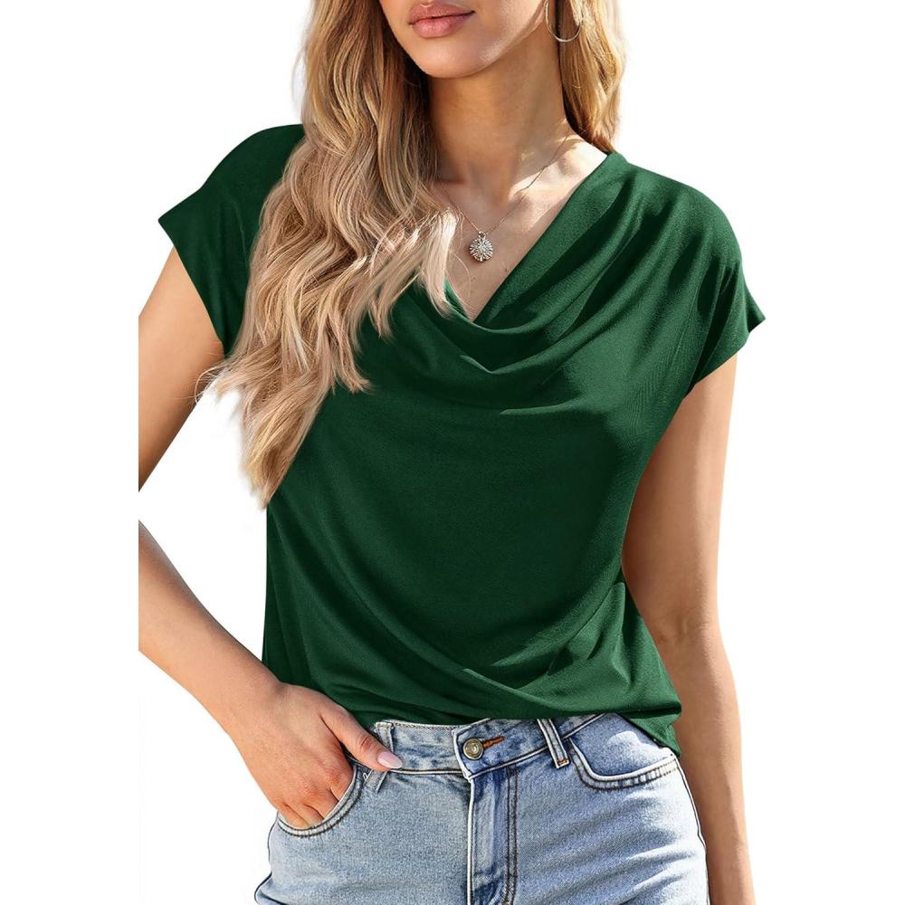 PRETTYGARDEN Blouses for Women Dressy Casual 2026 Summer Cowl Neck Short Sleeve Tops Spring Work Office Teacher Shirts(Green)