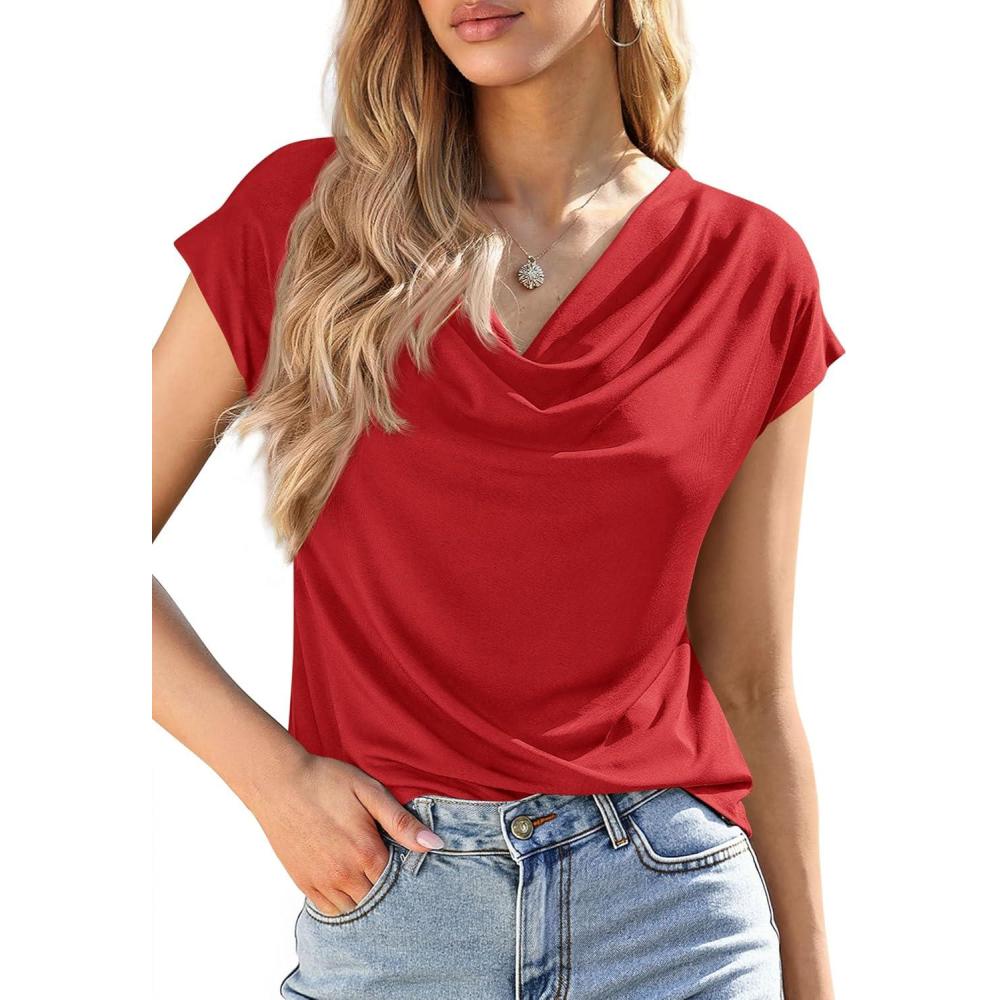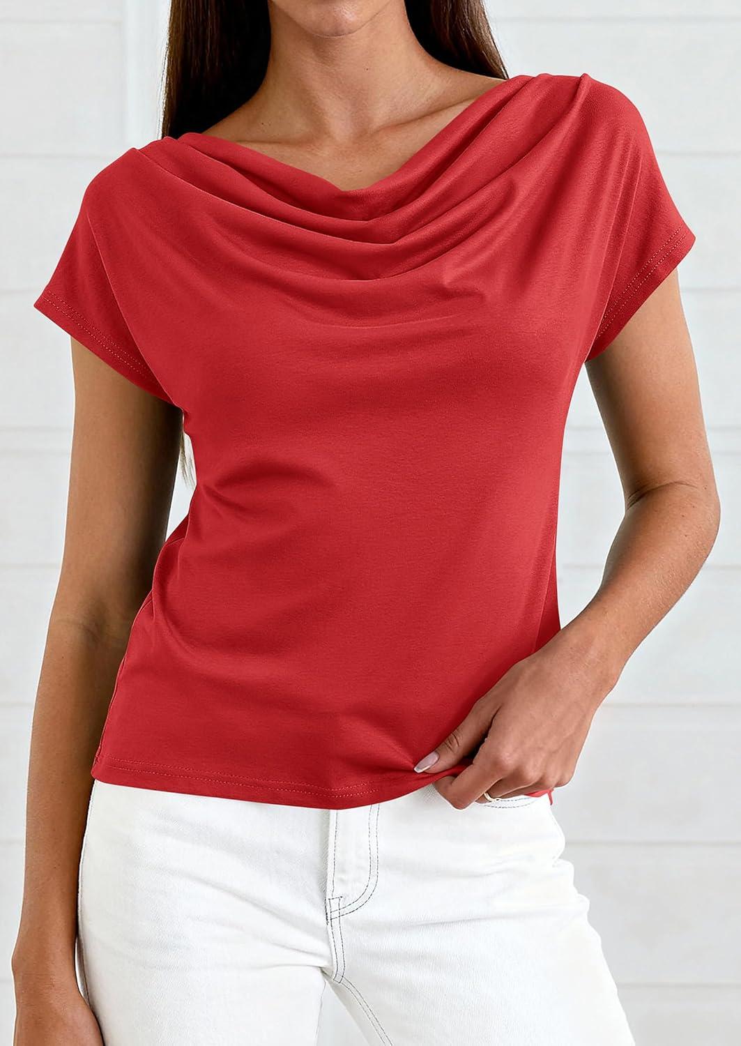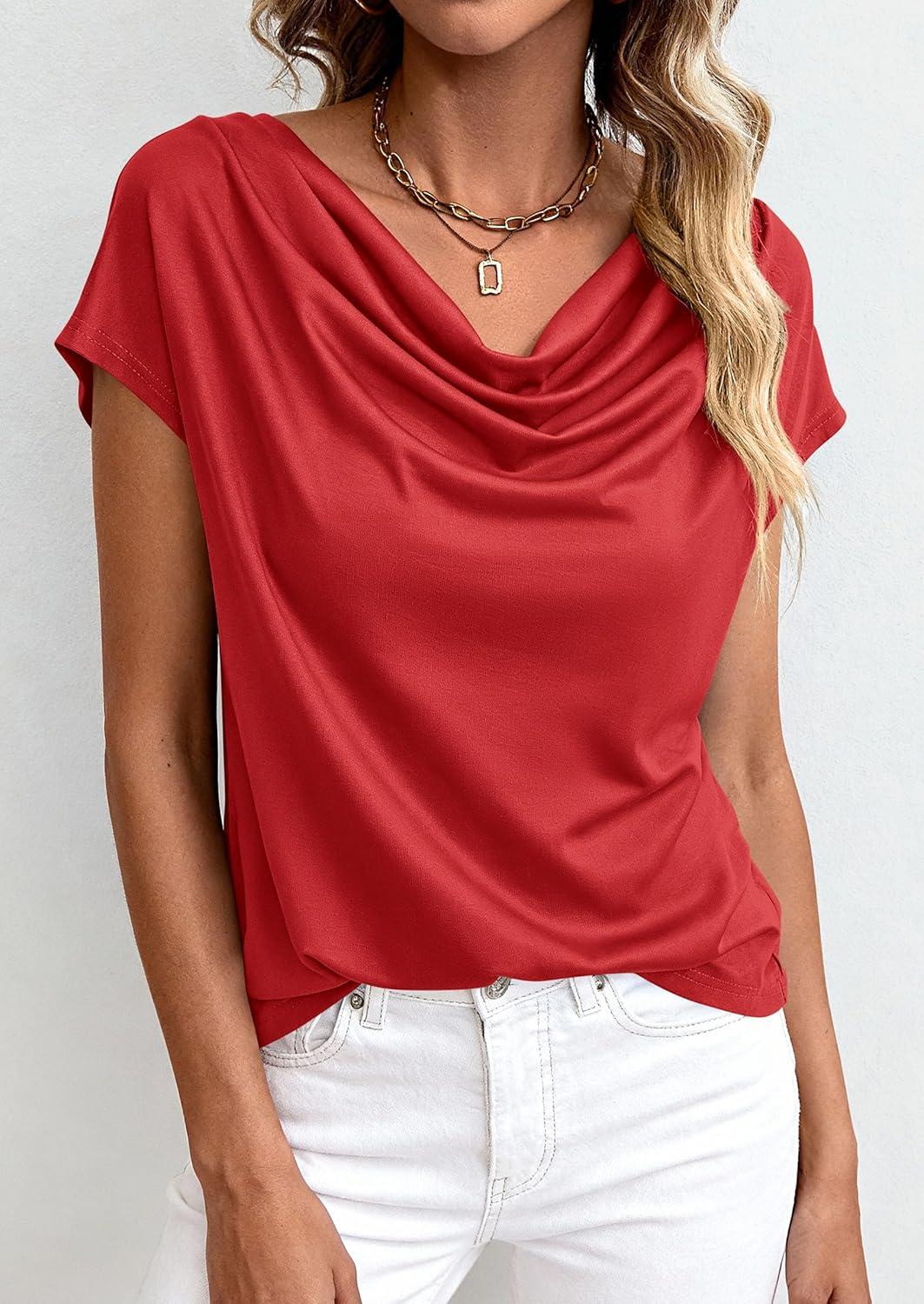 PRETTYGARDEN Blouses for Women Dressy Casual 2026 Summer Cowl Neck Short Sleeve Tops Spring Work Office Teacher Shirts(Red)