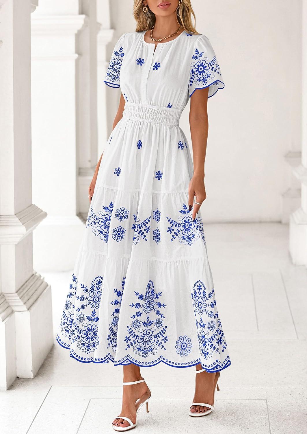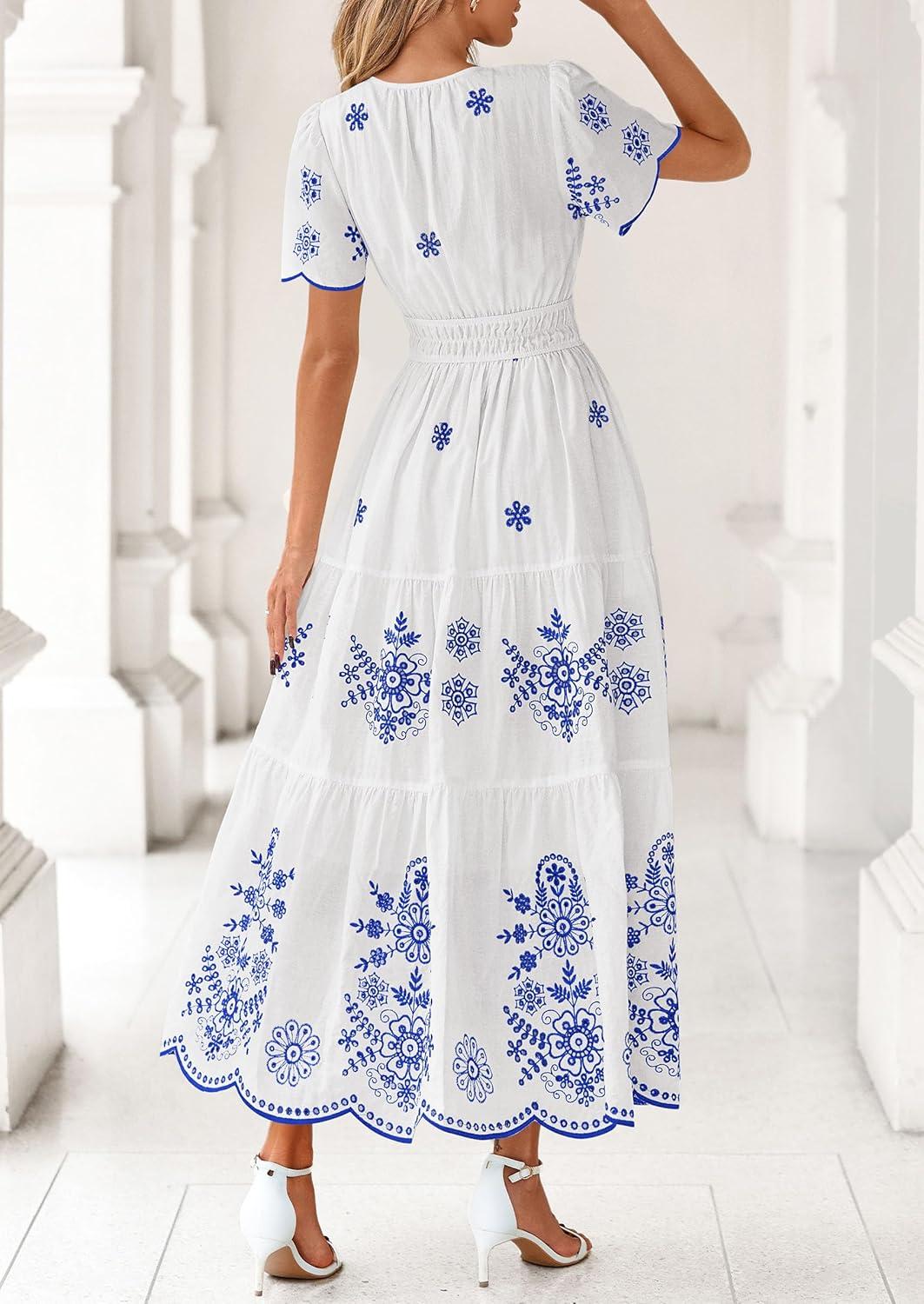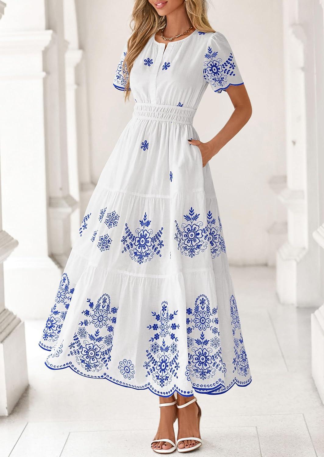 PRETTYGARDEN Boho Dresses for Women 2026 Summer Spring Casual Floral Short Sleeve V Neck Maxi Elastic Waist Dress Pockets(White Blue Flower)