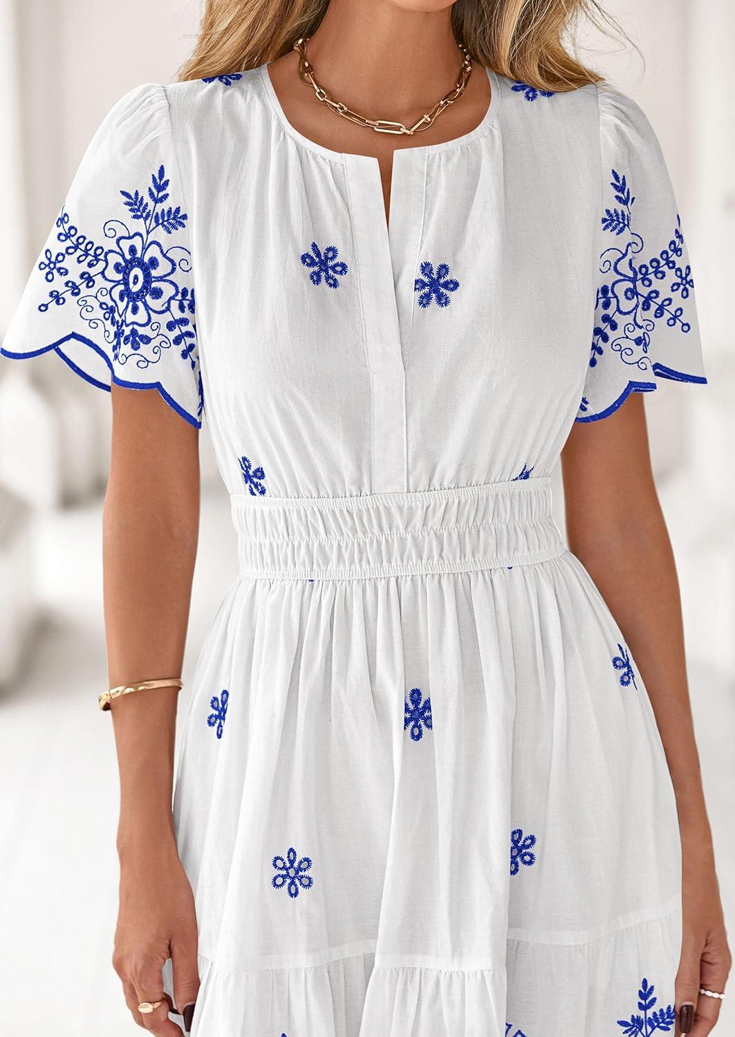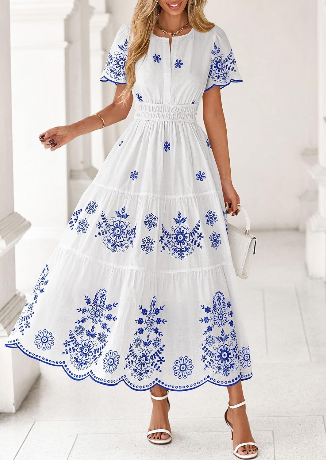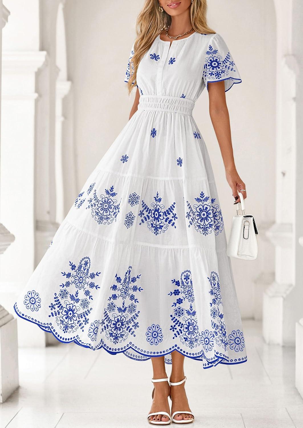 PRETTYGARDEN Boho Dresses for Women 2026 Summer Spring Casual Floral Short Sleeve V Neck Maxi Elastic Waist Dress Pockets(White Blue Flower)