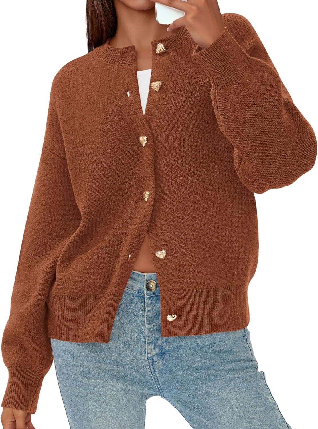 imagePRETTYGARDEN Cardigan for Women 2025 Fall Fashion Long Sleeve Trendy Button Down Work Office Sweaters Cute Winter JacketRed Brown