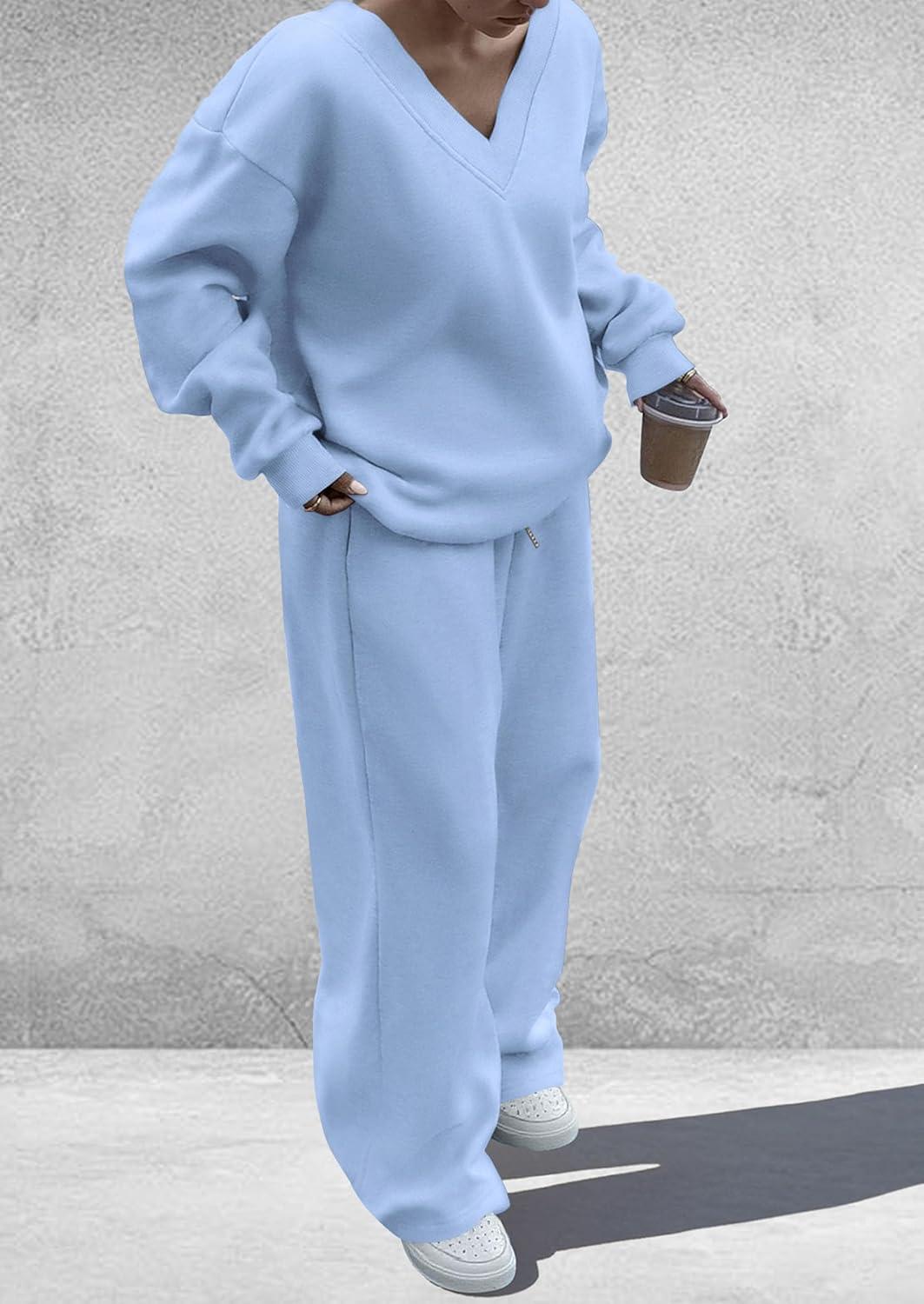 PRETTYGARDEN Casual Winter Two Piece Sets for Women 2025 V Neck Sweatshirt Loose Wide Leg Pants Tracksuit Knit Fall Outfits(Light Blue)