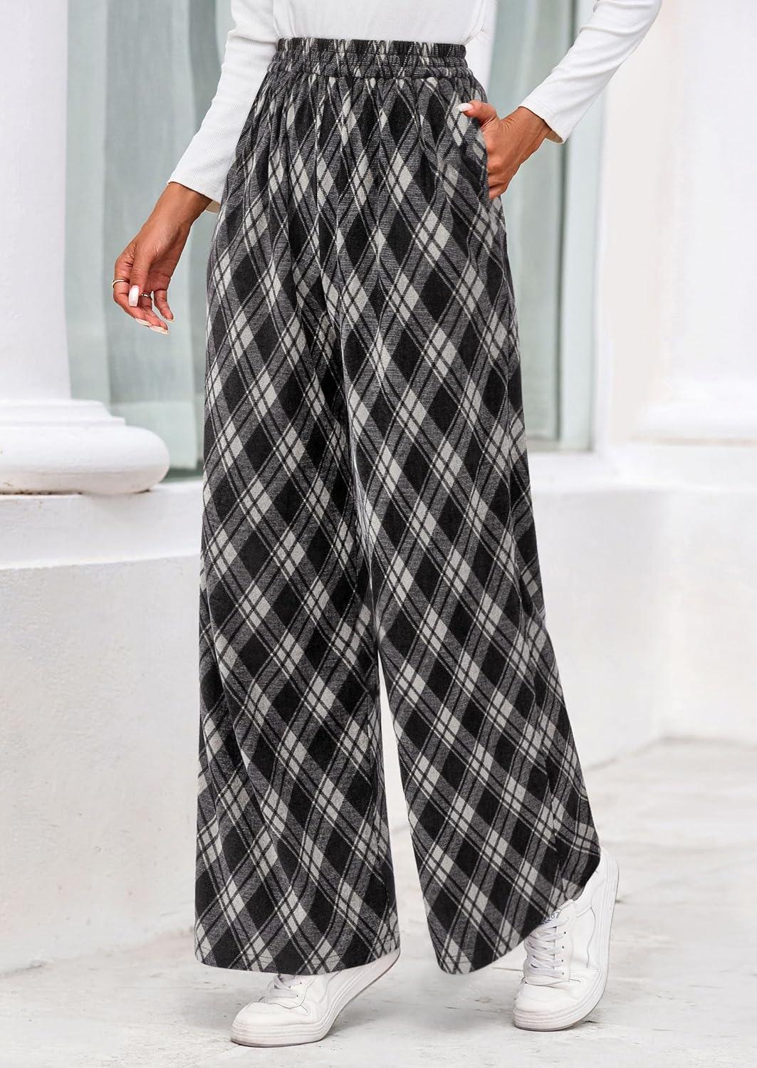 PRETTYGARDEN Casual Women’s Pants 2025 Elastic Waist Palazzo Long Pajama Wide Leg Trousers Knit Fall Outfits with Pockets(Big Plaid Black)