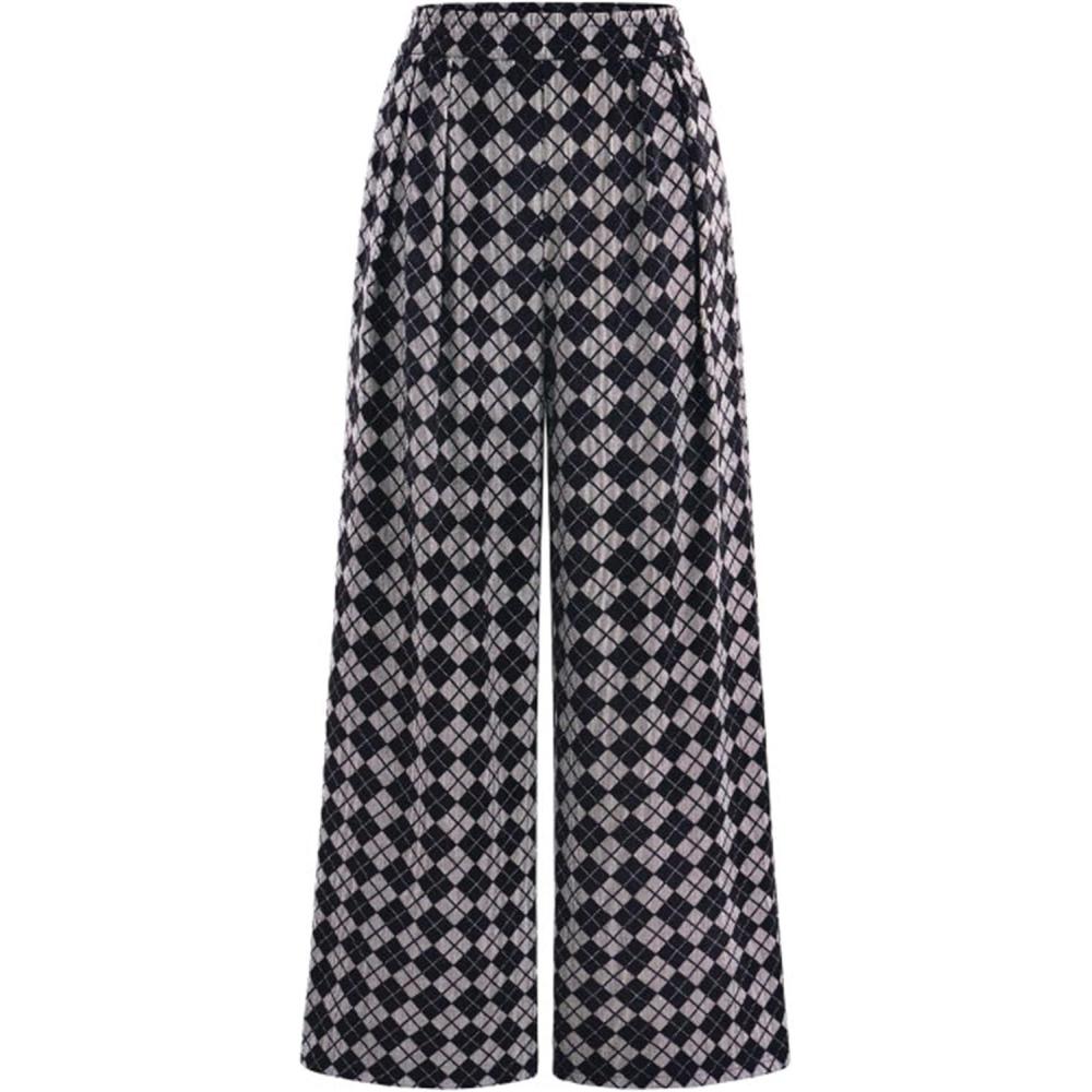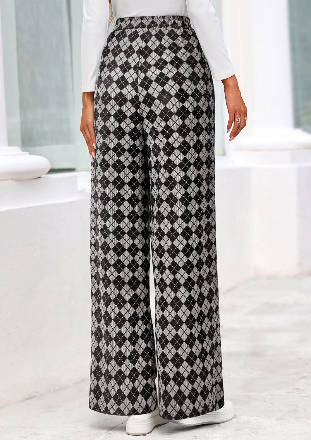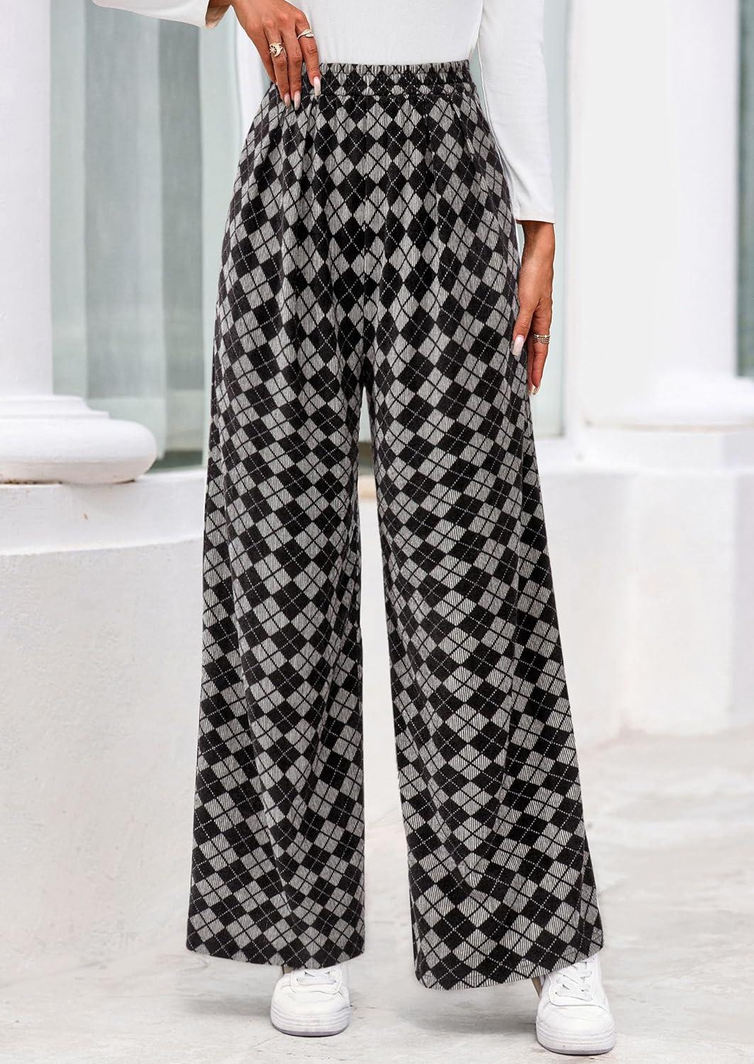 PRETTYGARDEN Casual Women’s Pants 2025 Elastic Waist Palazzo Long Pajama Wide Leg Trousers Knit Fall Outfits with Pockets(Small Plaid Black)