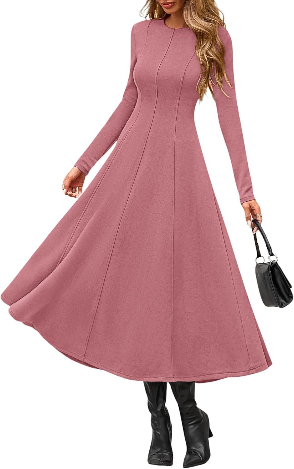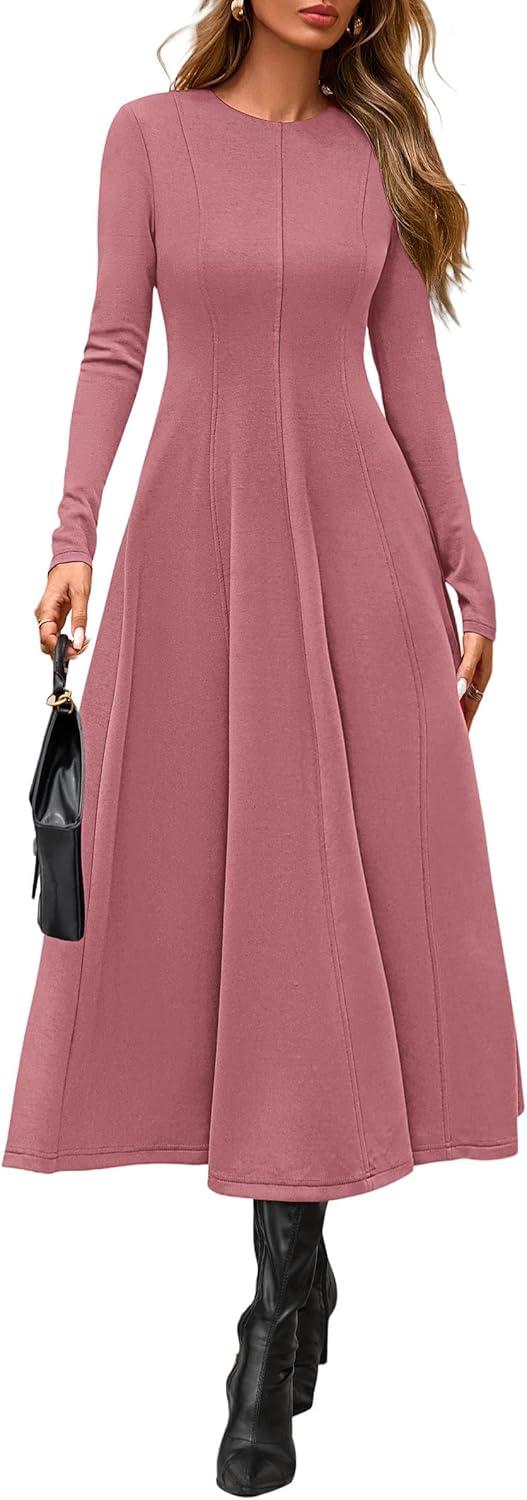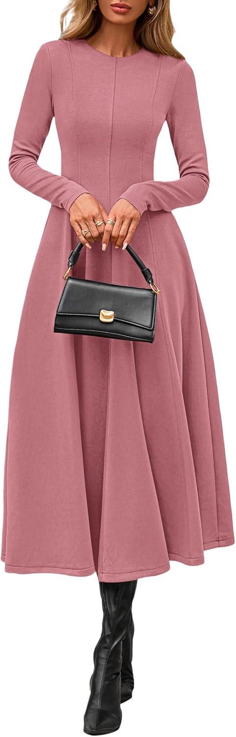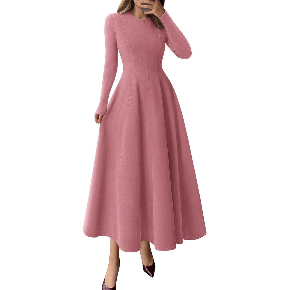 PRETTYGARDEN Cocktail Dresses for Women 2025 Elegant Classy Fall Long Sleeve Midi A Line Flowy Modest Winter Party Dress(Pink)