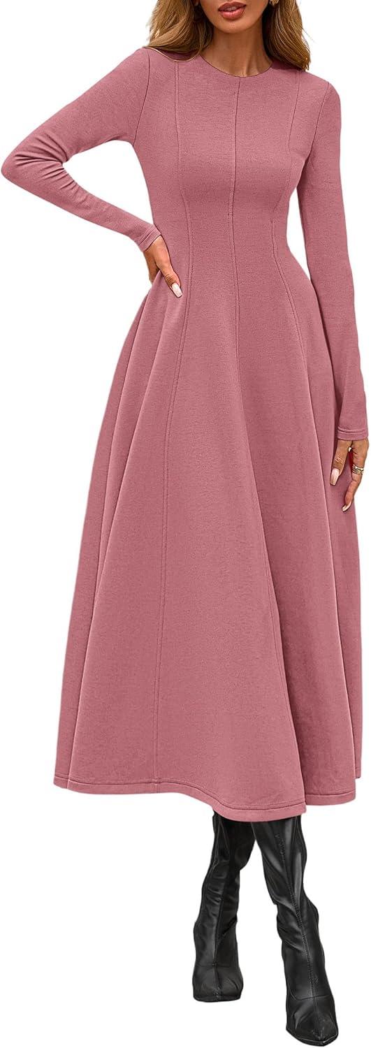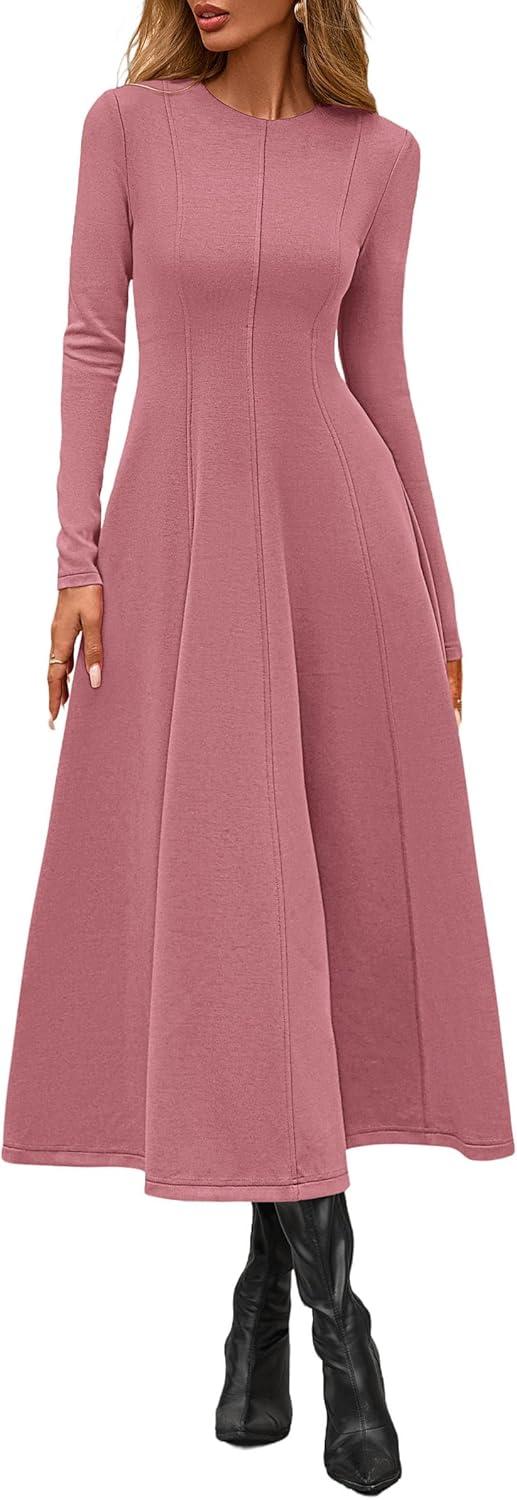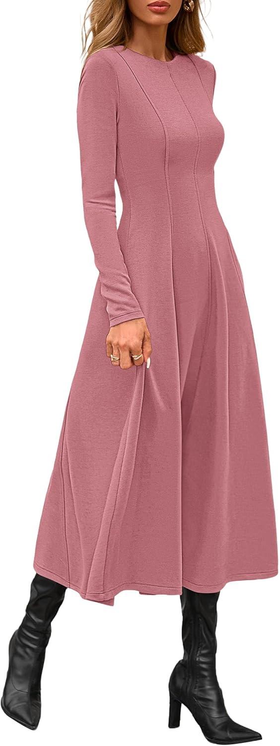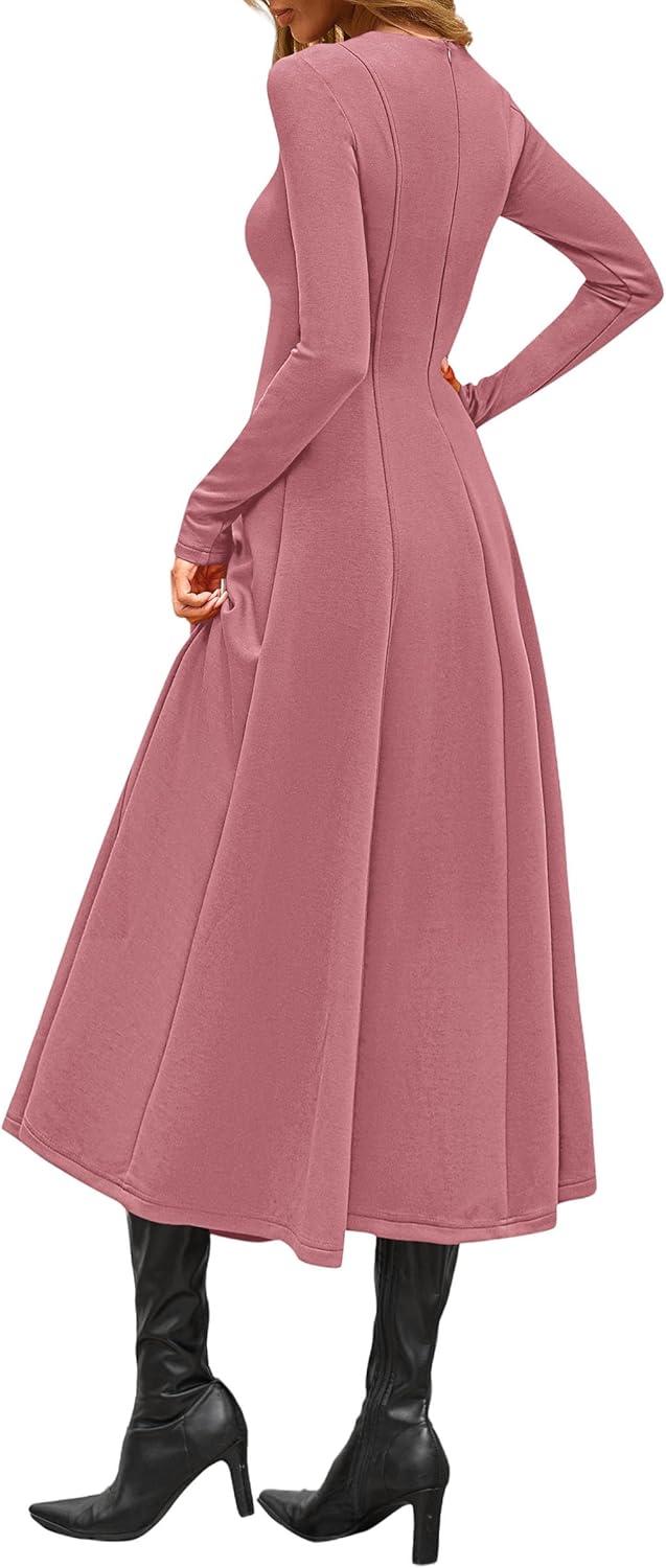 PRETTYGARDEN Cocktail Dresses for Women 2025 Elegant Classy Fall Long Sleeve Midi A Line Flowy Modest Winter Party Dress(Pink)