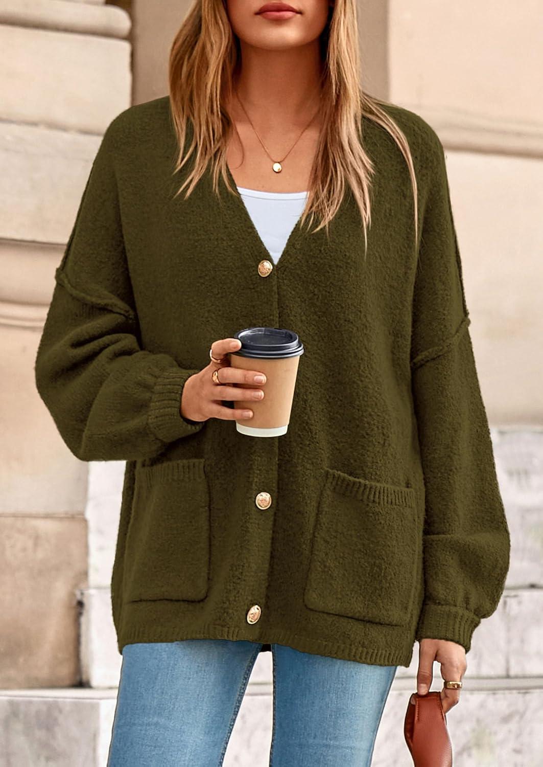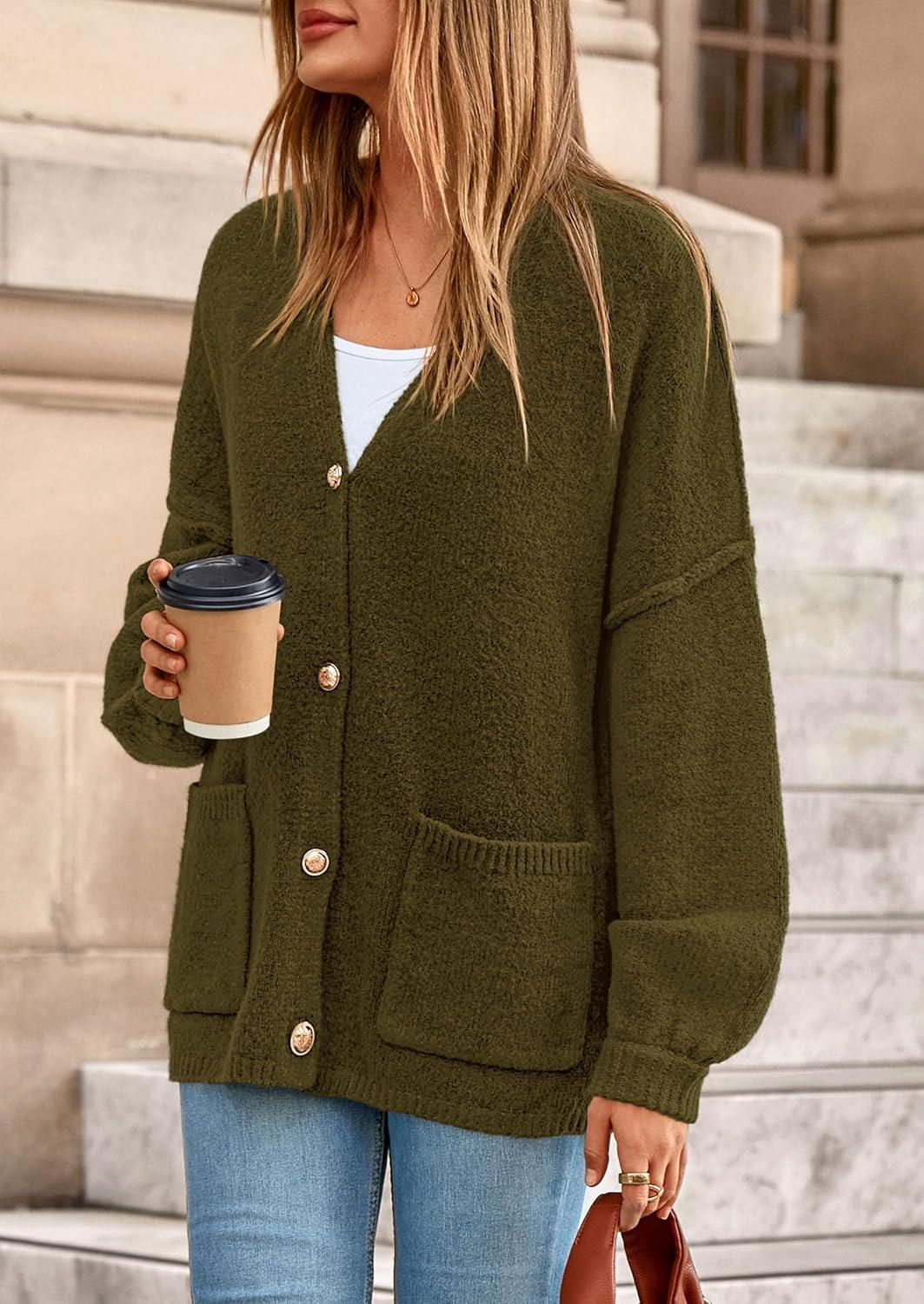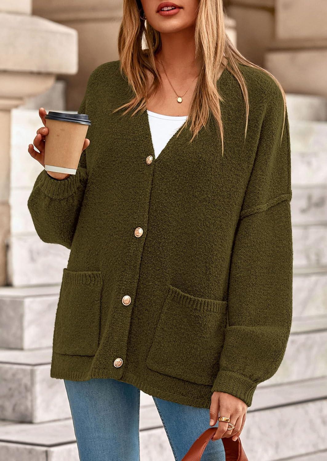 PRETTYGARDEN Fall Chunky Cardigan Sweaters for Women 2025 Button Long Lantern Sleeve Knit Oversized Coats with Pockets(Army Green)