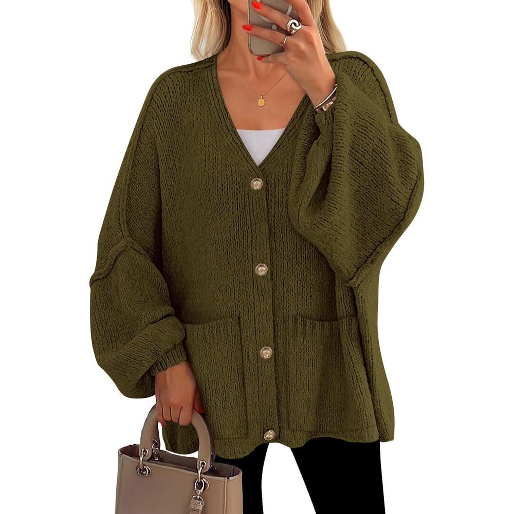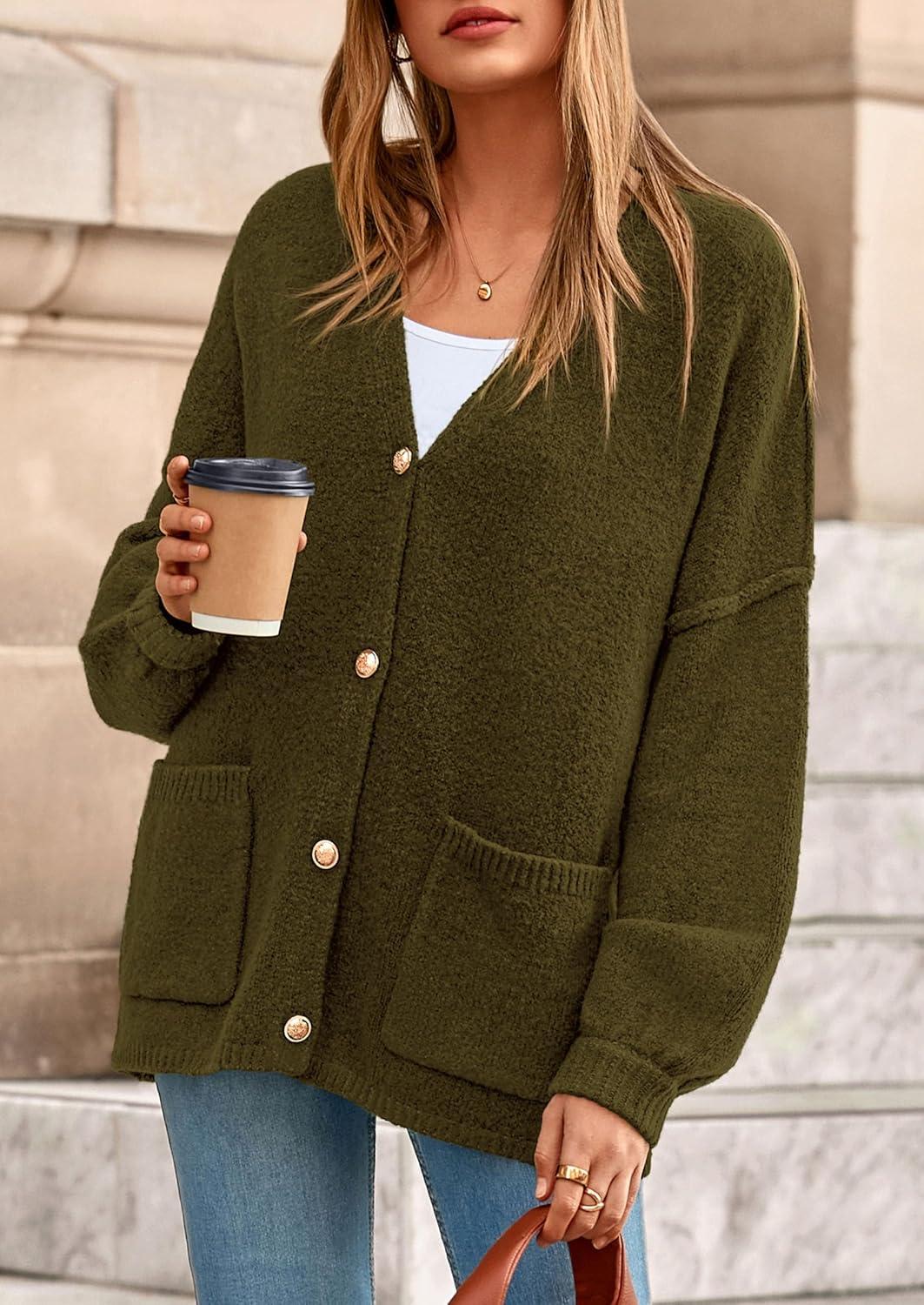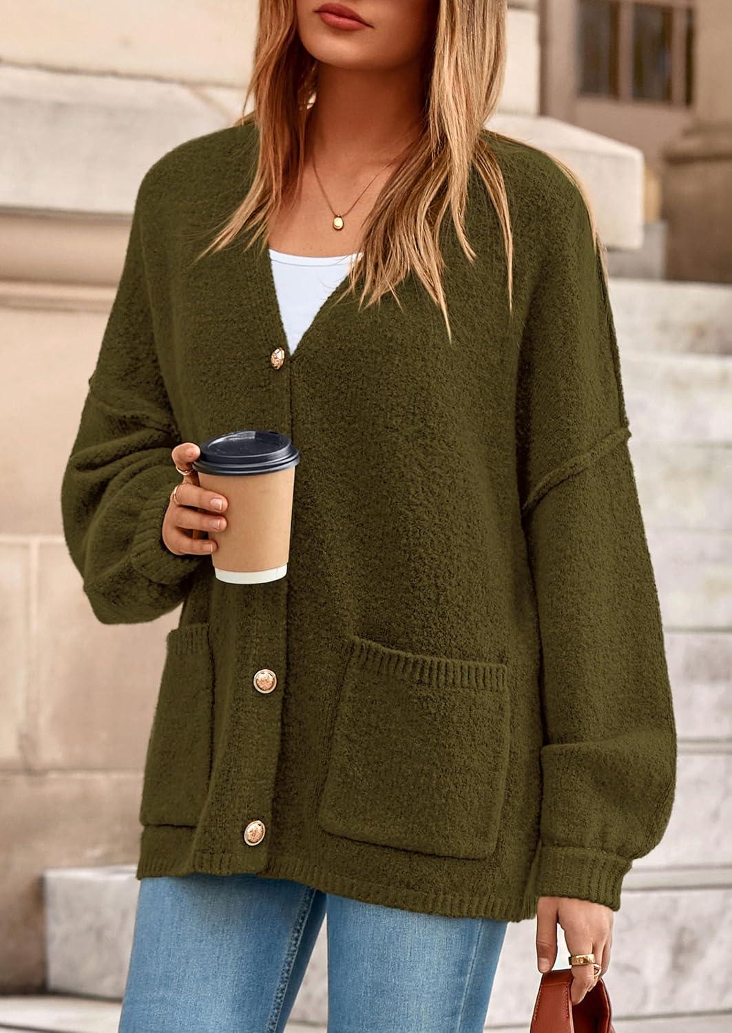 PRETTYGARDEN Fall Chunky Cardigan Sweaters for Women 2025 Button Long Lantern Sleeve Knit Oversized Coats with Pockets(Army Green)