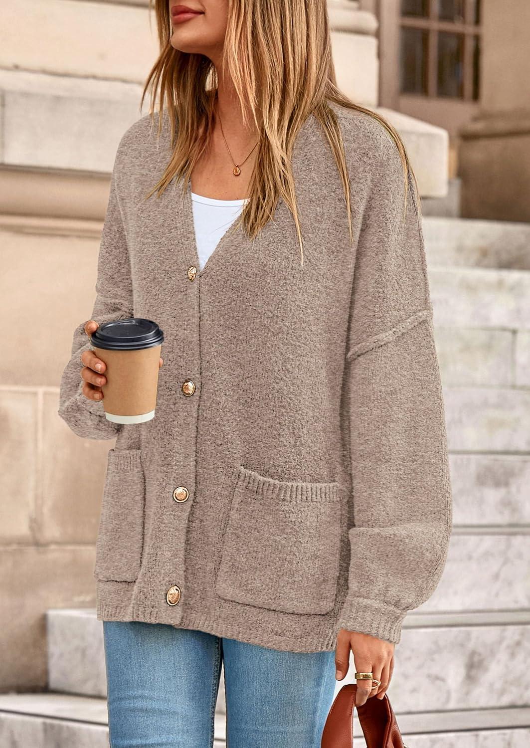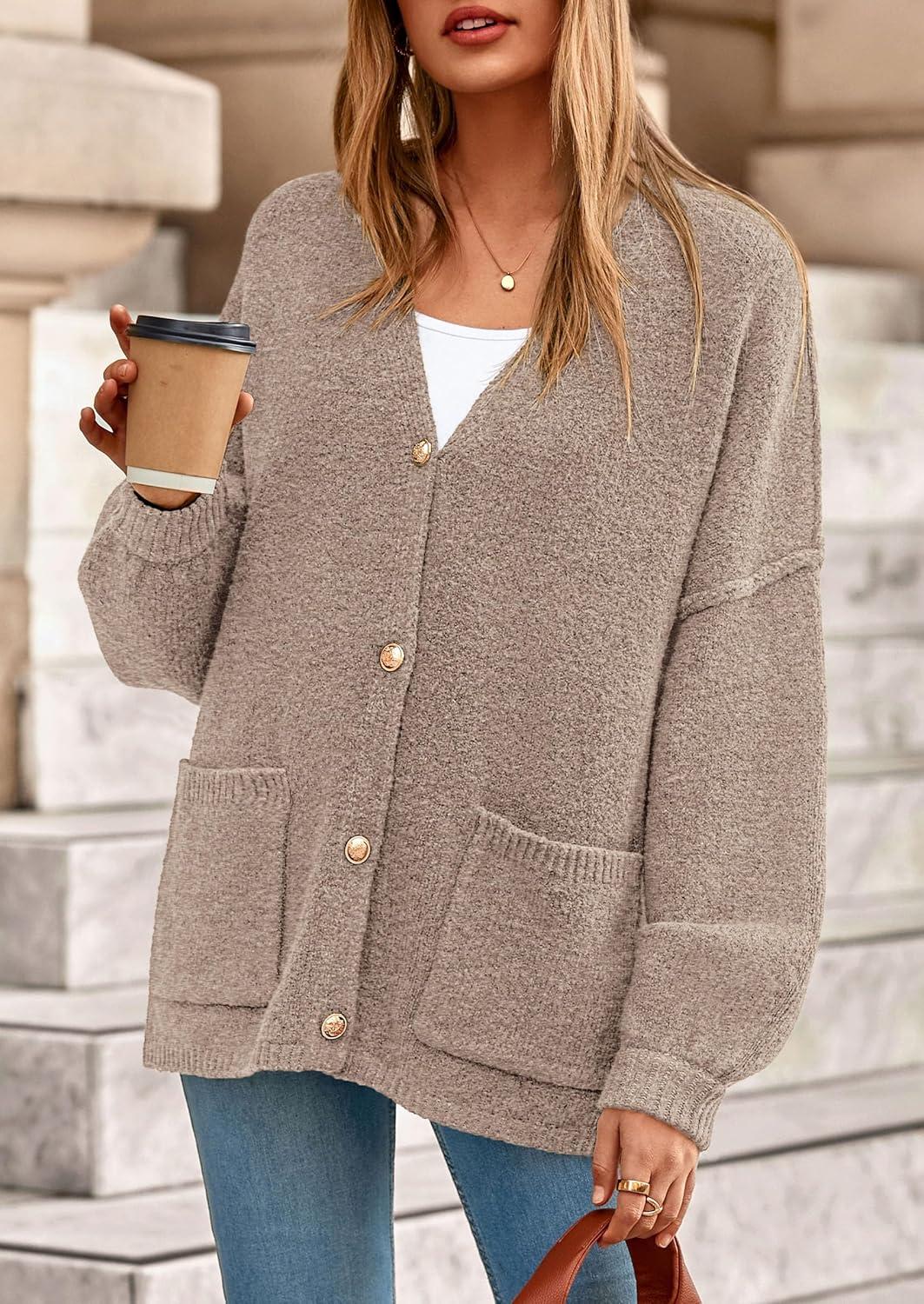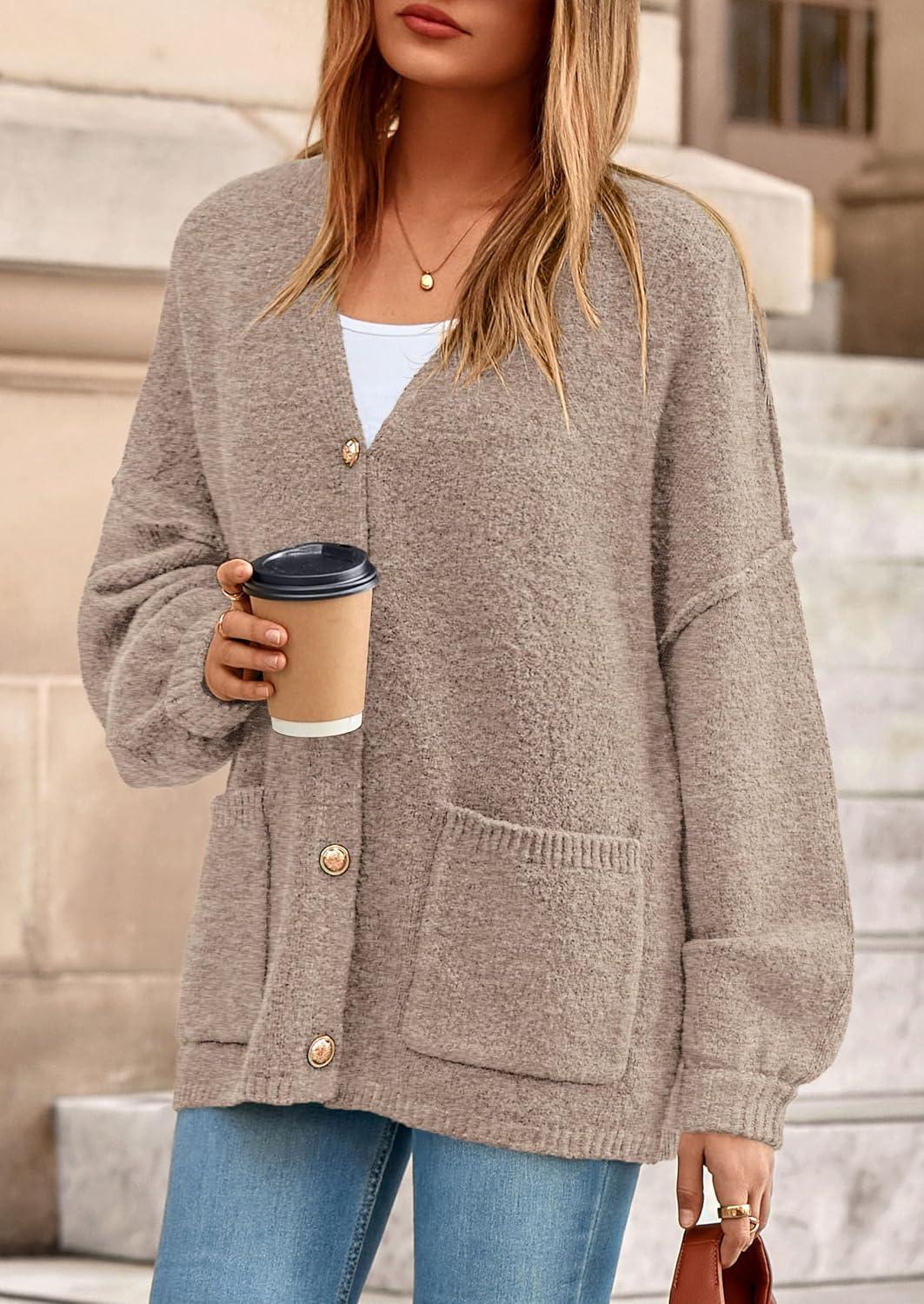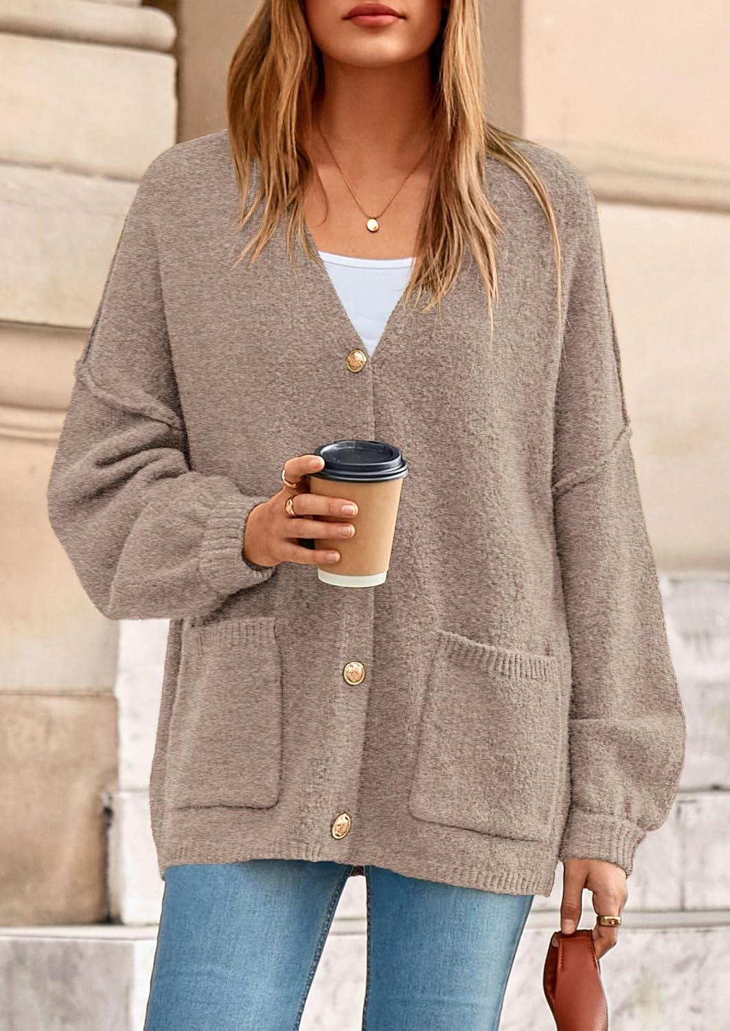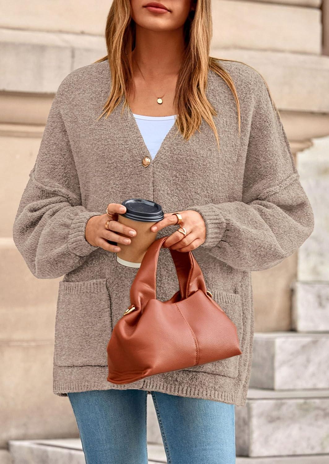 PRETTYGARDEN Fall Chunky Cardigan Sweaters for Women 2025 Button Long Lantern Sleeve Knit Oversized Coats with Pockets(Dark Khaki)