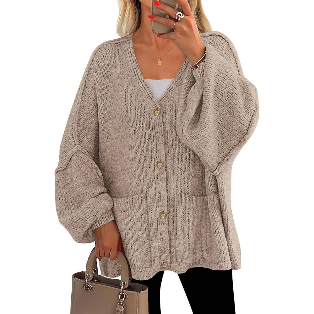 PRETTYGARDEN Fall Chunky Cardigan Sweaters for Women 2025 Button Long Lantern Sleeve Knit Oversized Coats with Pockets(Light Khaki)