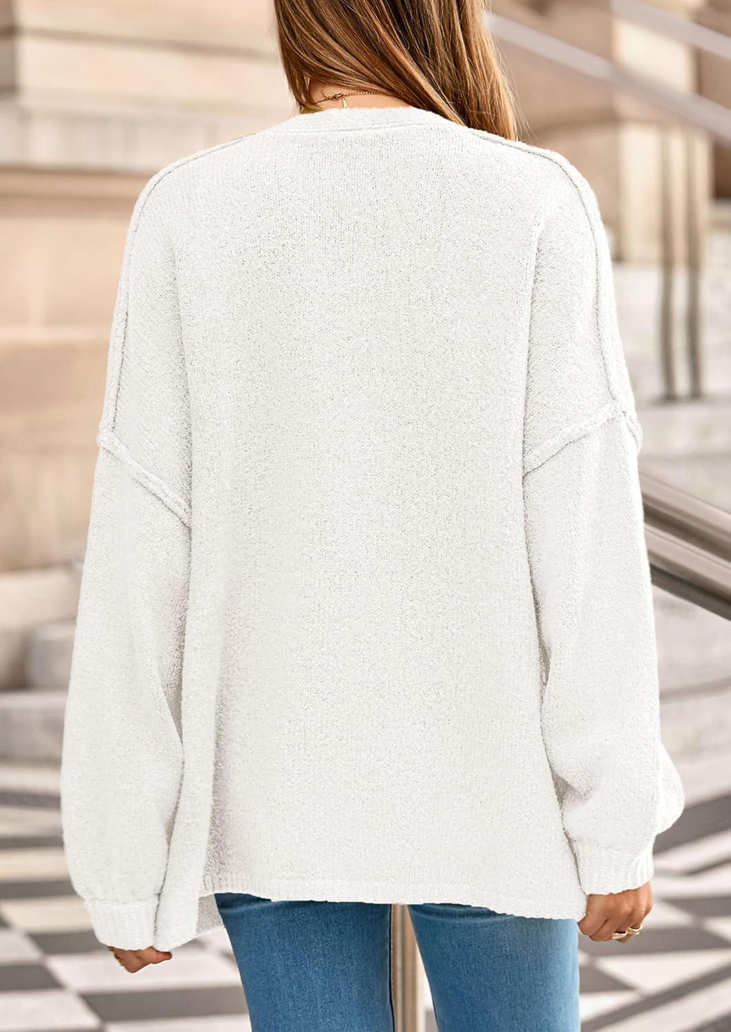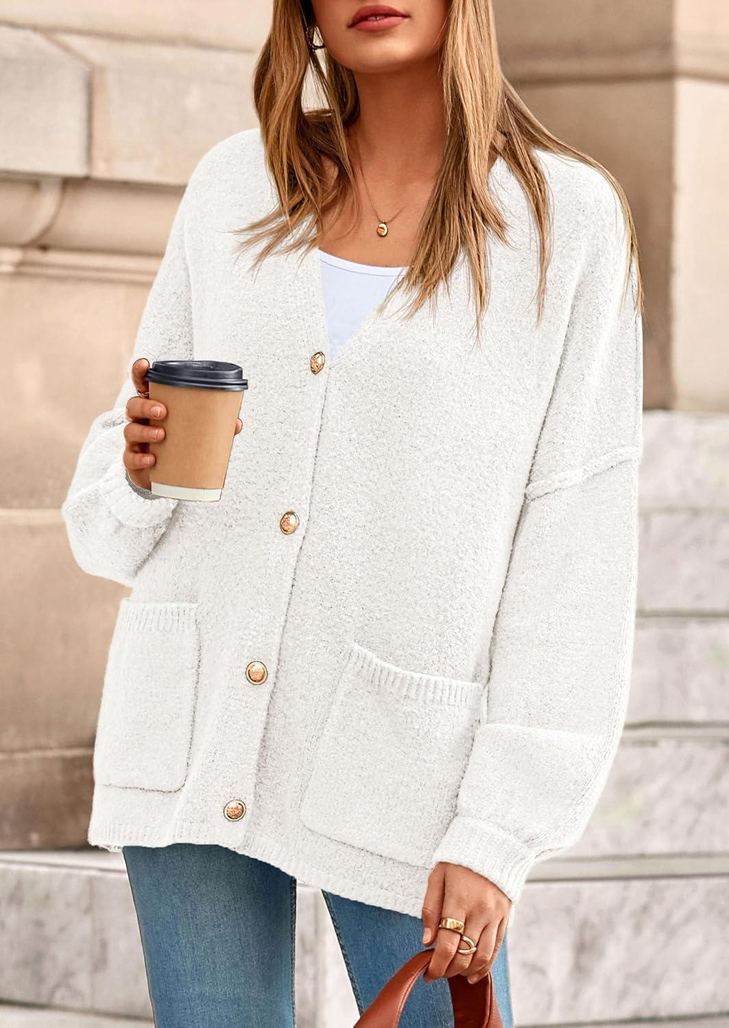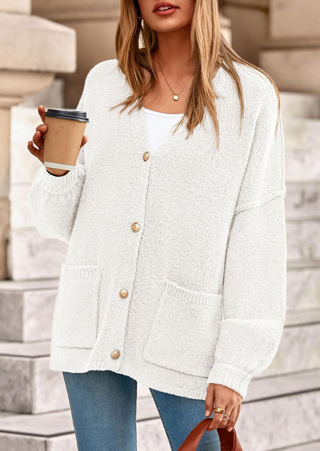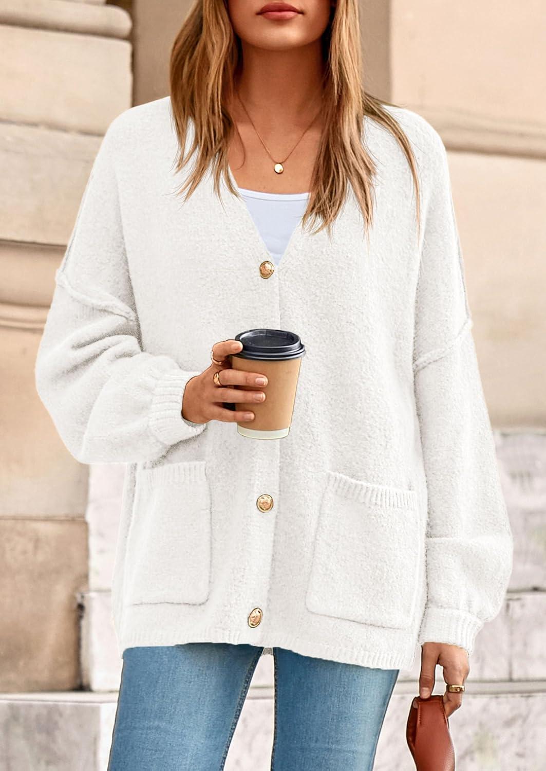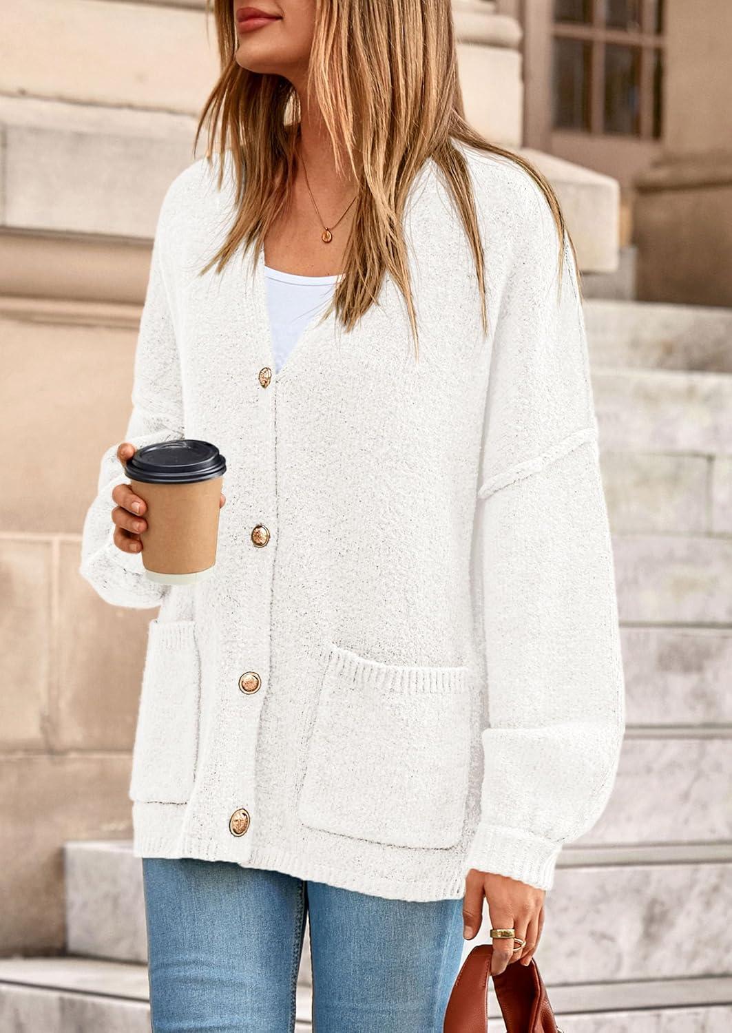 PRETTYGARDEN Fall Chunky Cardigan Sweaters for Women 2025 Button Long Lantern Sleeve Knit Oversized Coats with Pockets(White)