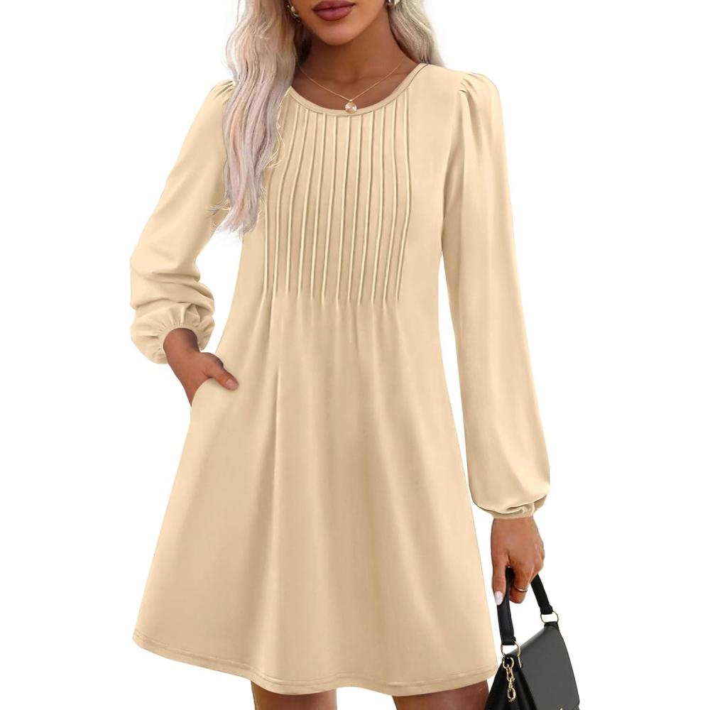 PRETTYGARDEN Fall Dresses for Women 2025 Long Sleeve Mini Short Flowy A Line Casual Holiday Party Tunic Dress Fashion Clothes(Beige)