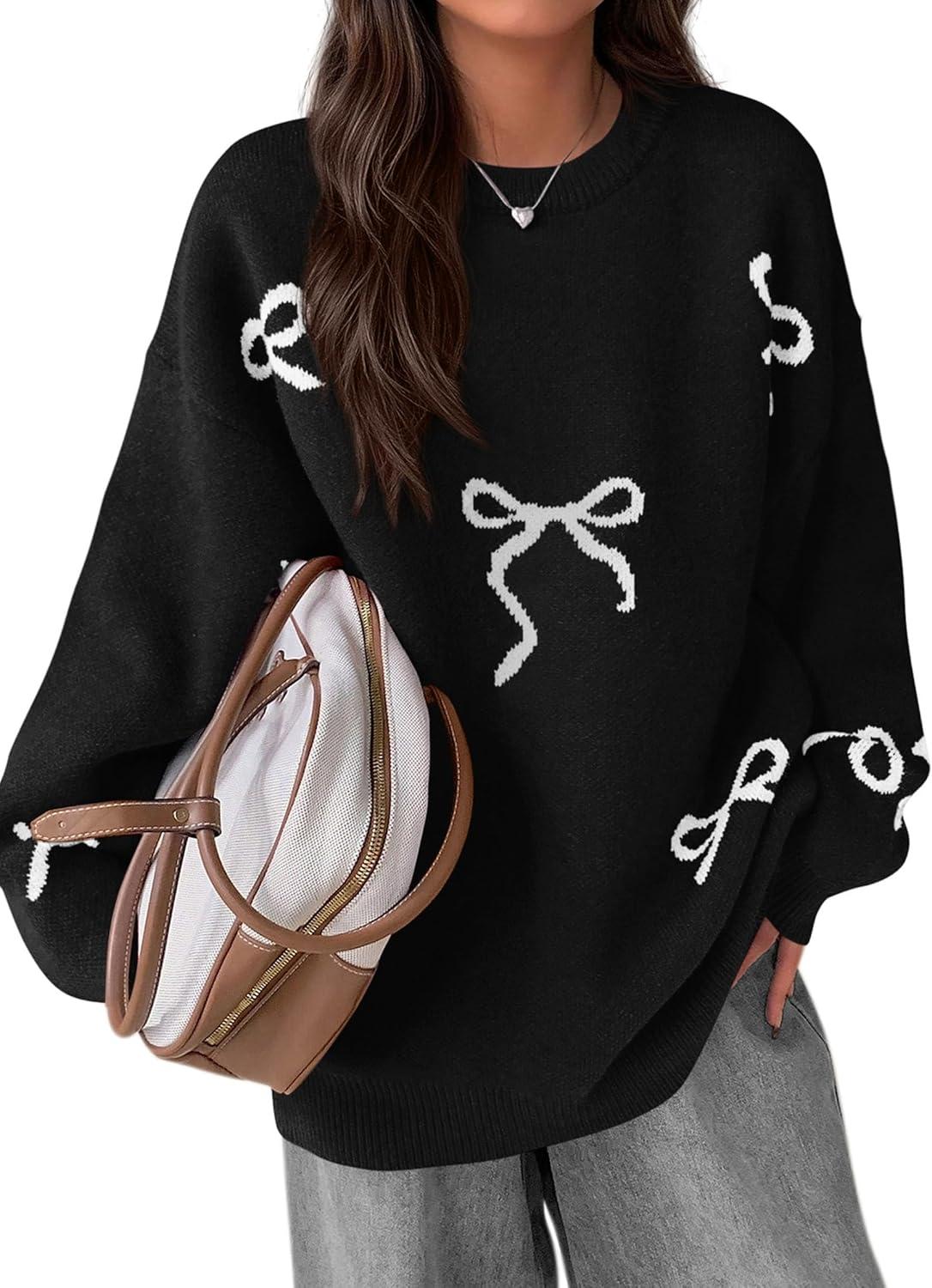 PRETTYGARDEN Fall Long Sleeve Pullover Sweaters for Women 2025 Trendy Crewneck Casual Cute Bow Chunky Knit Oversized Sweater(Black)