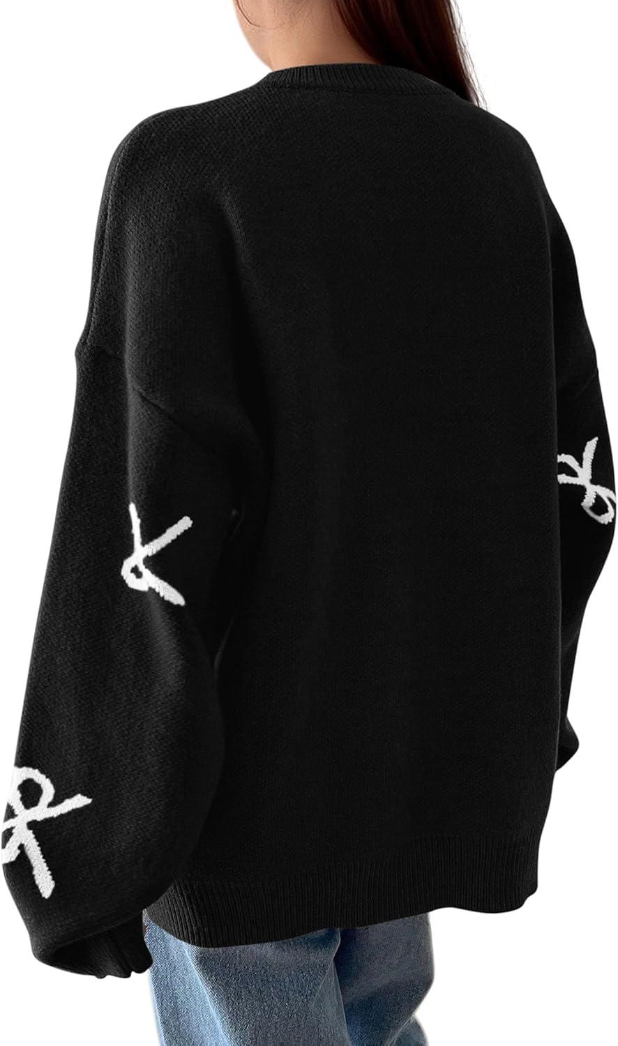imagePRETTYGARDEN Fall Long Sleeve Pullover Sweaters for Women 2025 Trendy Crewneck Casual Cute Bow Chunky Knit Oversized SweaterBlack