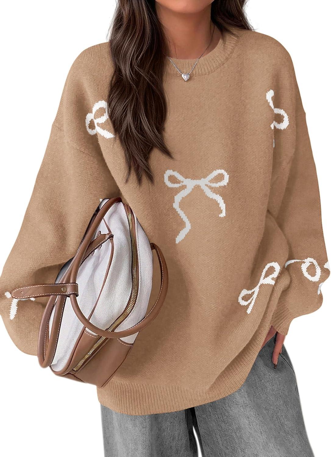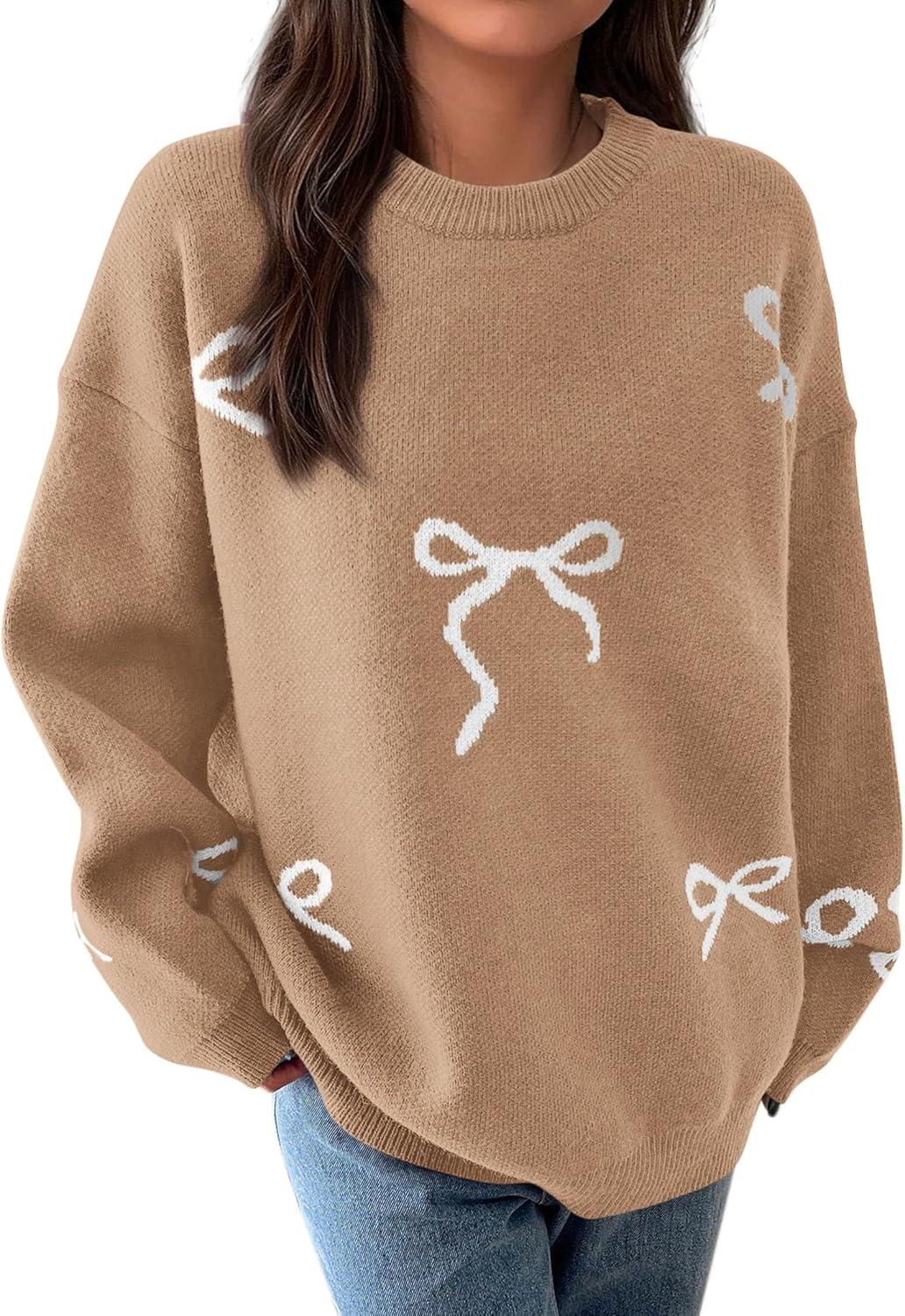 PRETTYGARDEN Fall Long Sleeve Pullover Sweaters for Women 2025 Trendy Crewneck Casual Cute Bow Chunky Knit Oversized Sweater(Camel)