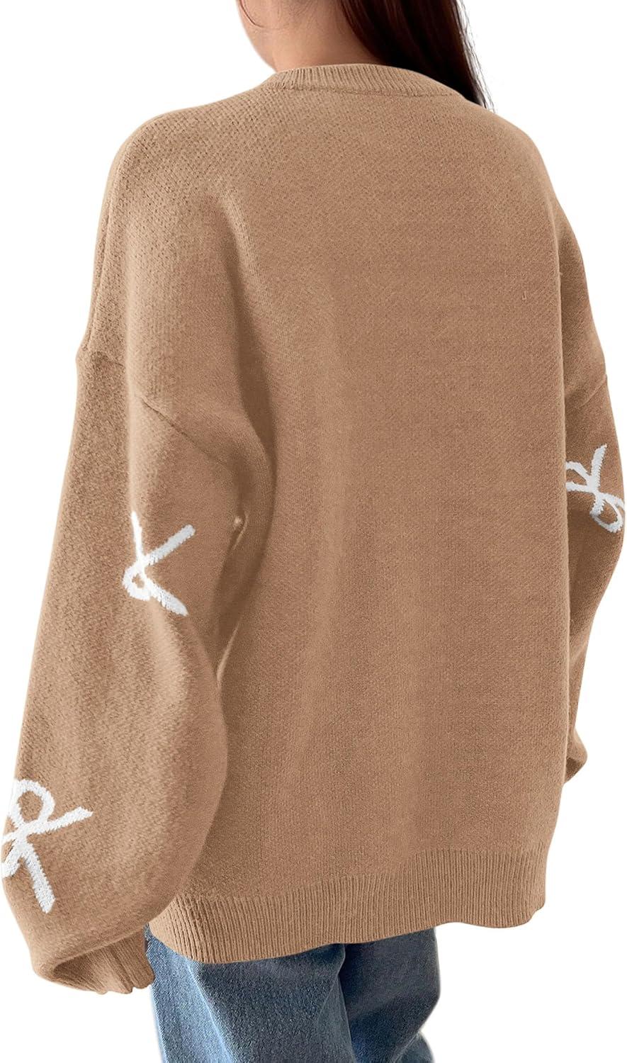 imagePRETTYGARDEN Fall Long Sleeve Pullover Sweaters for Women 2025 Trendy Crewneck Casual Cute Bow Chunky Knit Oversized SweaterBrown