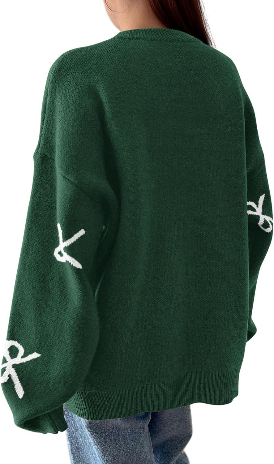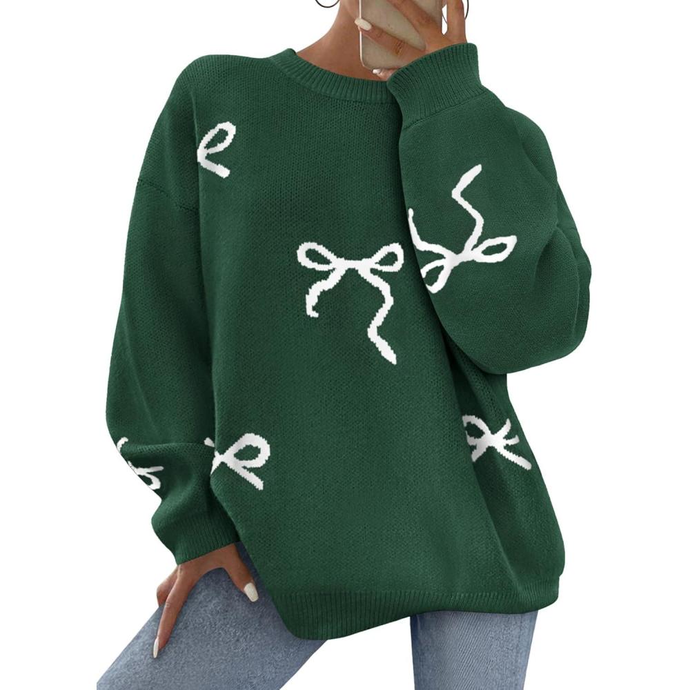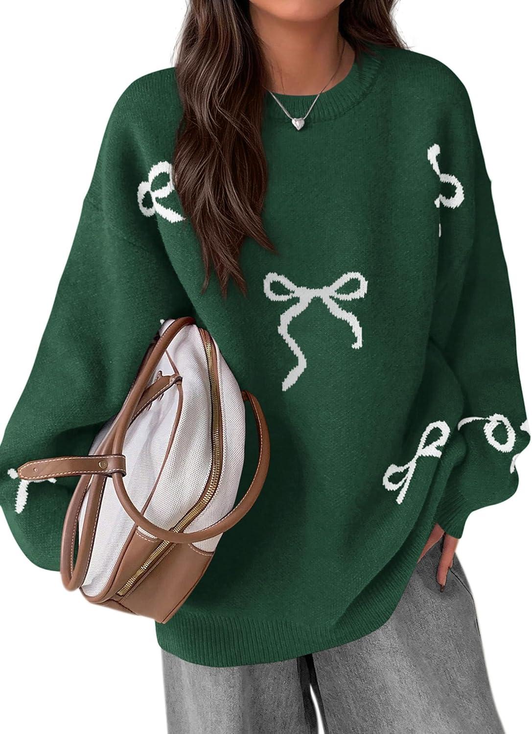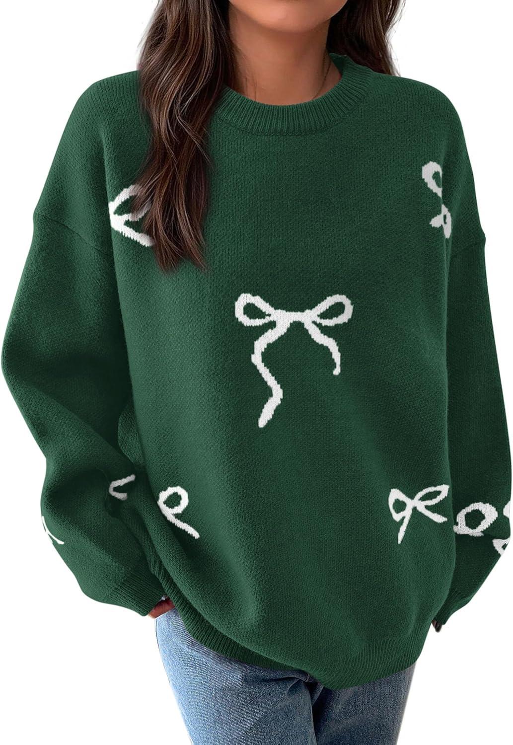 PRETTYGARDEN Fall Long Sleeve Pullover Sweaters for Women 2025 Trendy Crewneck Casual Cute Bow Chunky Knit Oversized Sweater(Dark Green)