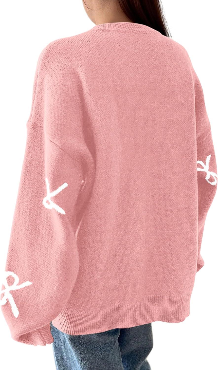 imagePRETTYGARDEN Fall Long Sleeve Pullover Sweaters for Women 2025 Trendy Crewneck Casual Cute Bow Chunky Knit Oversized SweaterLight Pink
