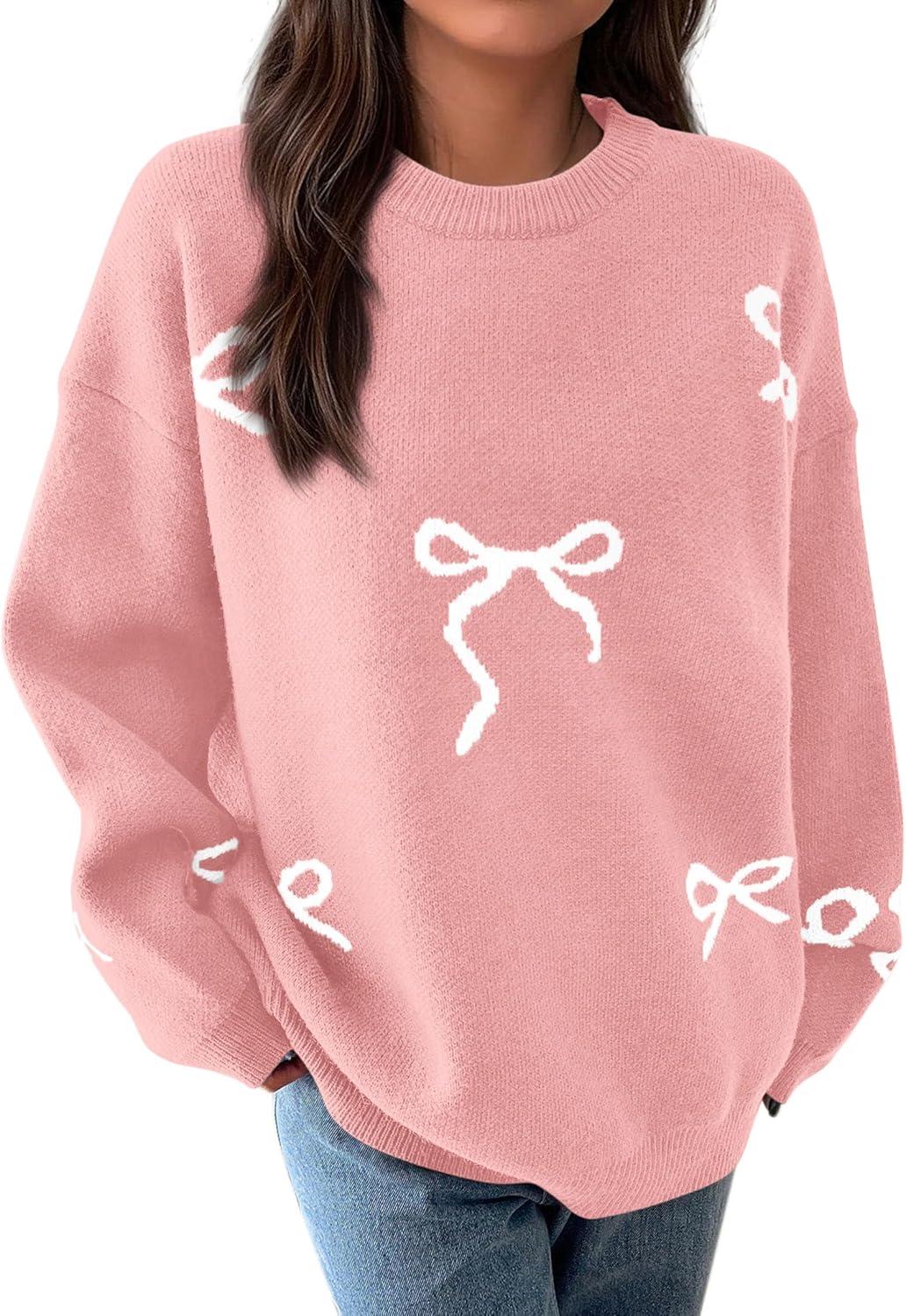 PRETTYGARDEN Fall Long Sleeve Pullover Sweaters for Women 2025 Trendy Crewneck Casual Cute Bow Chunky Knit Oversized Sweater(Light Pink)