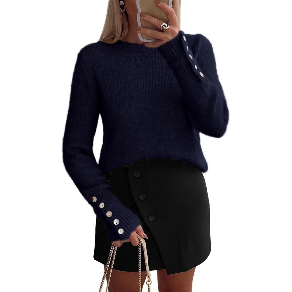 imagePRETTYGARDEN Fall Sweaters for Women 2025 Cozy Casual Crewneck Pullover Button Long Sleeve Knit Tops Winter Fashion ClothingNavy Blue