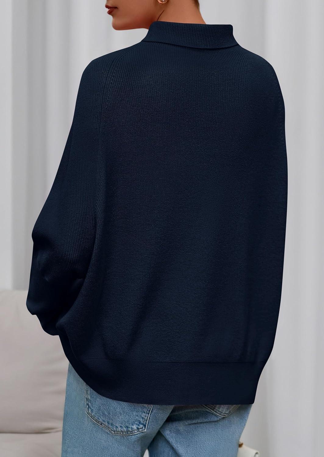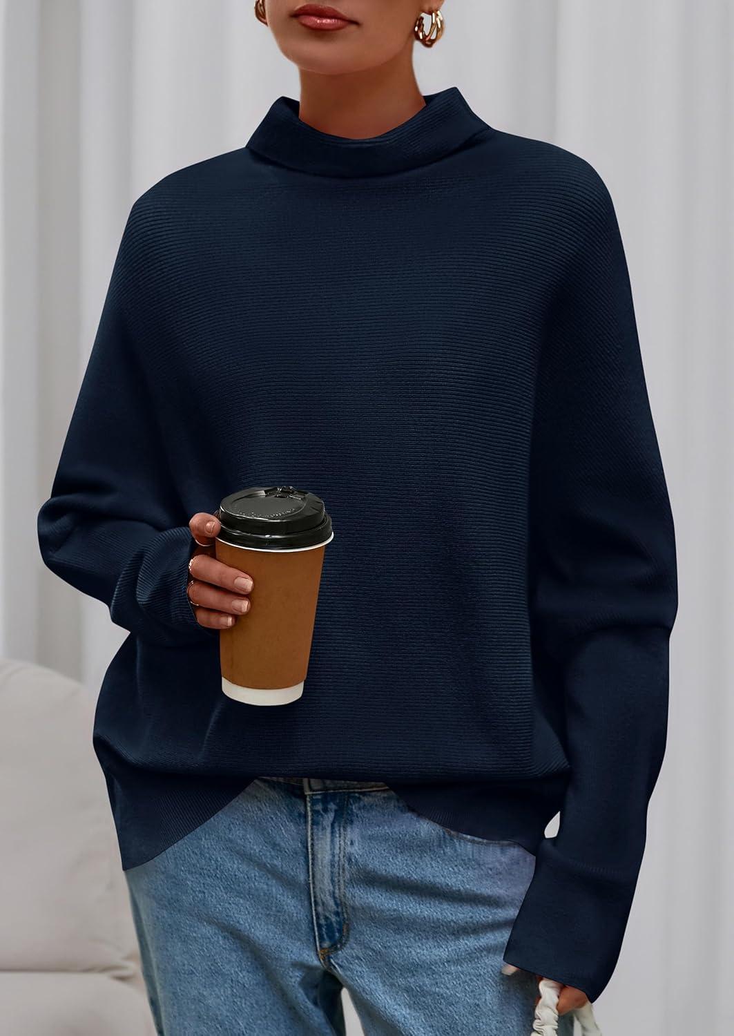 PRETTYGARDEN Fall Sweaters for Women 2025 Winter Clothing Batwing Long Sleeve Casual Tops Loose Knit Turtleneck Sweater(Navy)