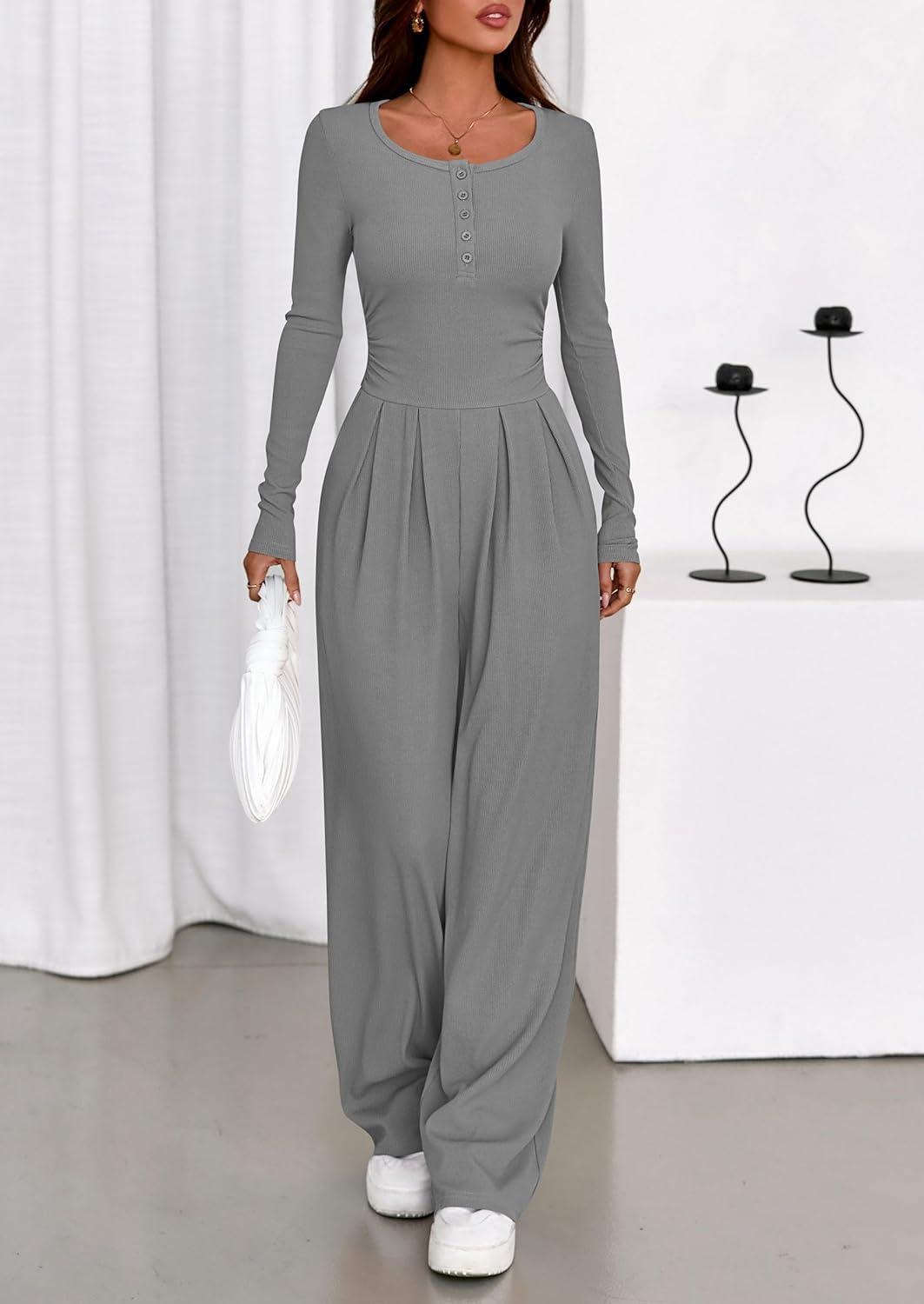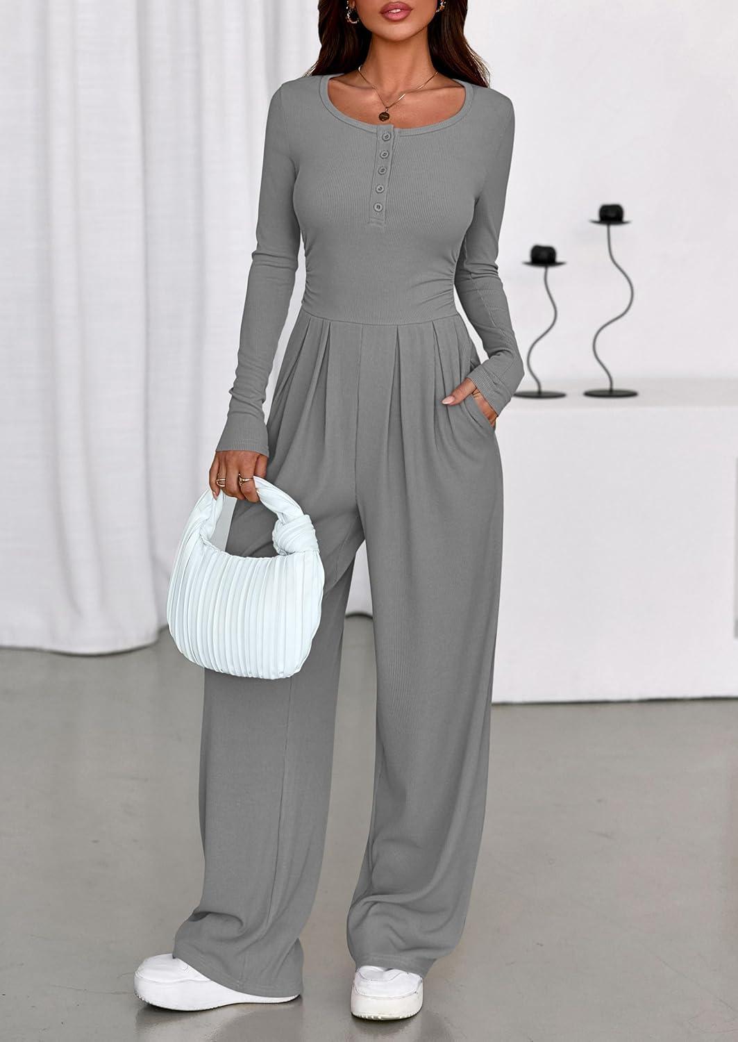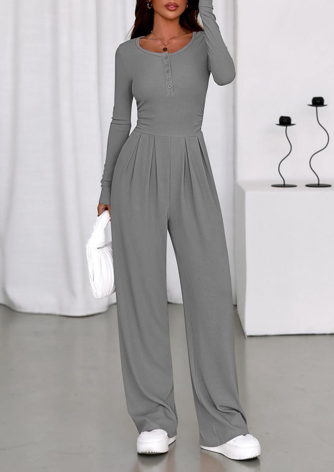 PRETTYGARDEN Jumpsuits for Women Dressy Casual 2025 Fall One Piece Outfits Long Sleeve Wide Leg Pants Romper Fashion Clothing(Grey)