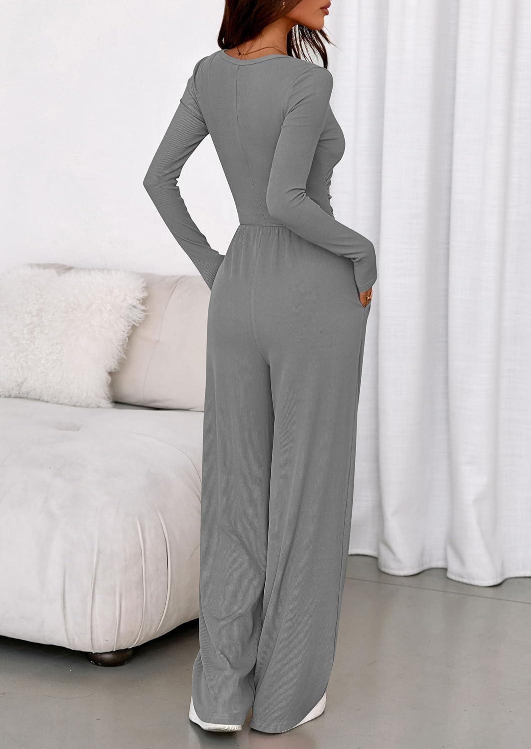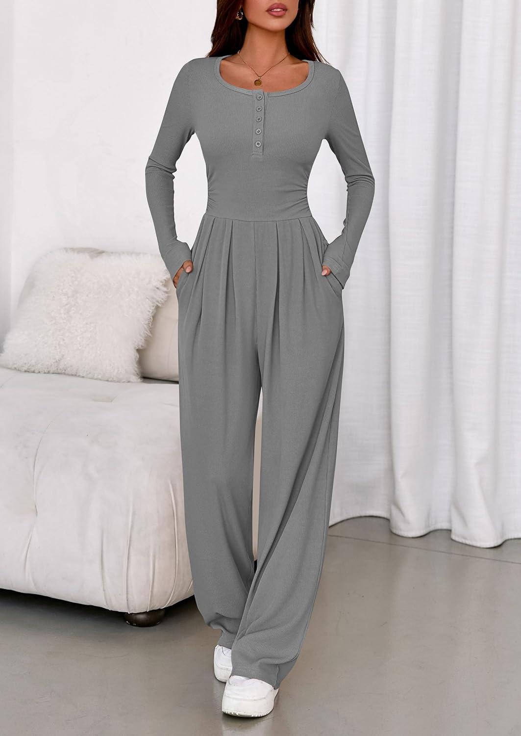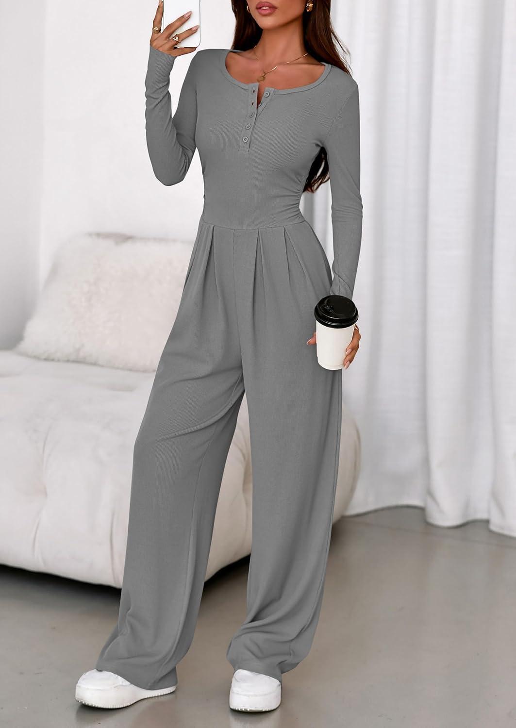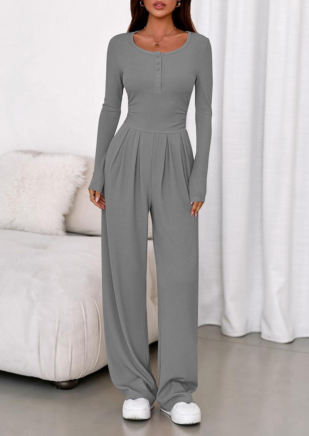 PRETTYGARDEN Jumpsuits for Women Dressy Casual 2025 Fall One Piece Outfits Long Sleeve Wide Leg Pants Romper Fashion Clothing(Grey)