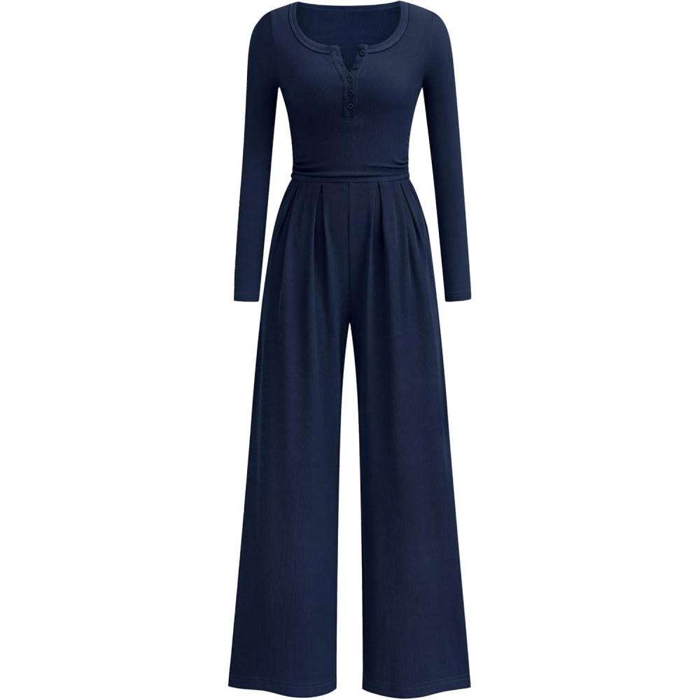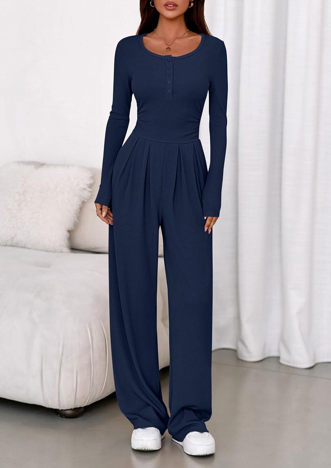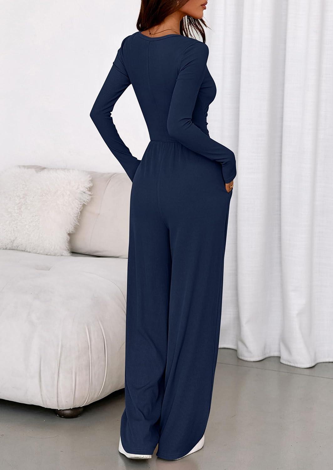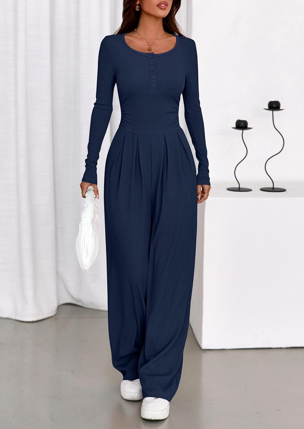 PRETTYGARDEN Jumpsuits for Women Dressy Casual 2025 Fall One Piece Outfits Long Sleeve Wide Leg Pants Romper Fashion Clothing(Navy Blue)
