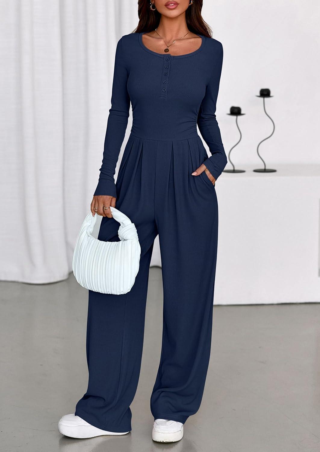 imagePRETTYGARDEN Jumpsuits for Women Dressy Casual 2025 Fall One Piece Outfits Long Sleeve Wide Leg Pants Romper Fashion ClothingNavy Blue