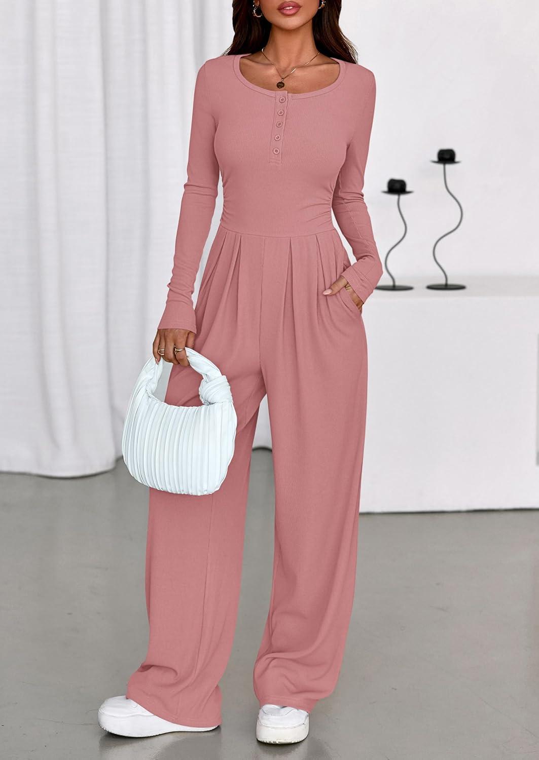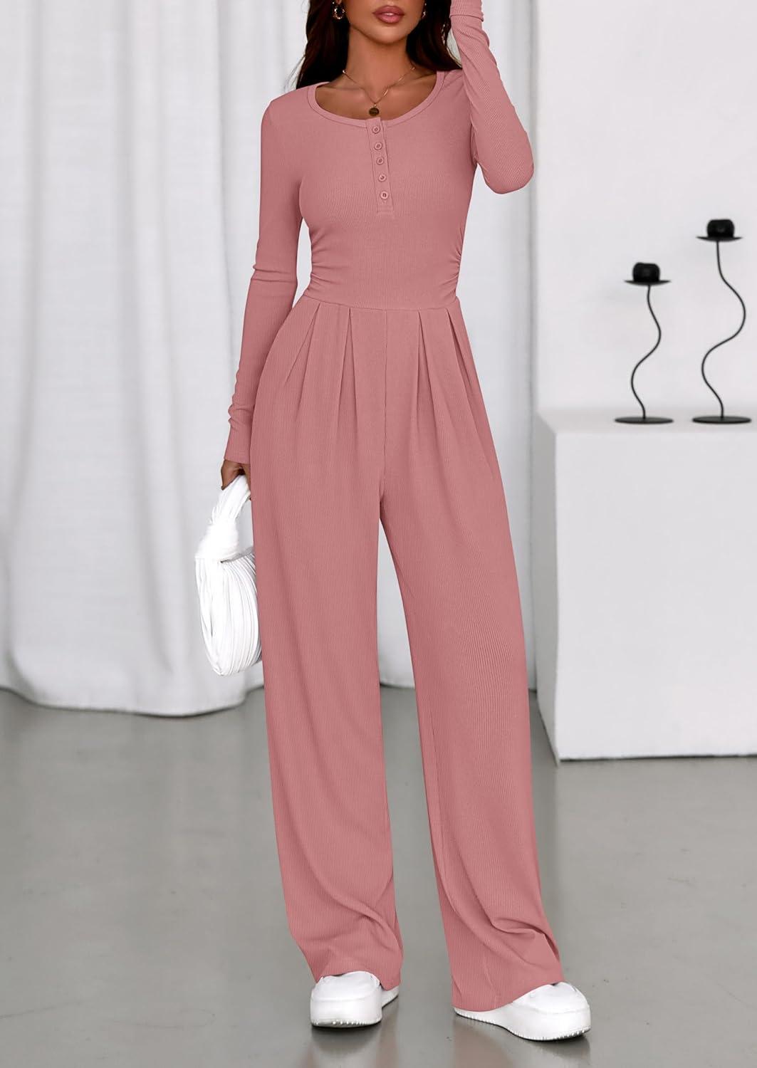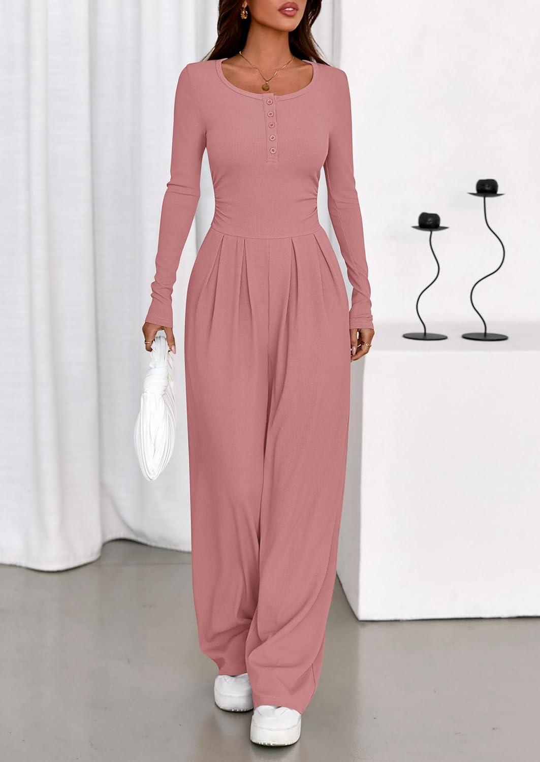 PRETTYGARDEN Jumpsuits for Women Dressy Casual 2025 Fall One Piece Outfits Long Sleeve Wide Leg Pants Romper Fashion Clothing(Pink)