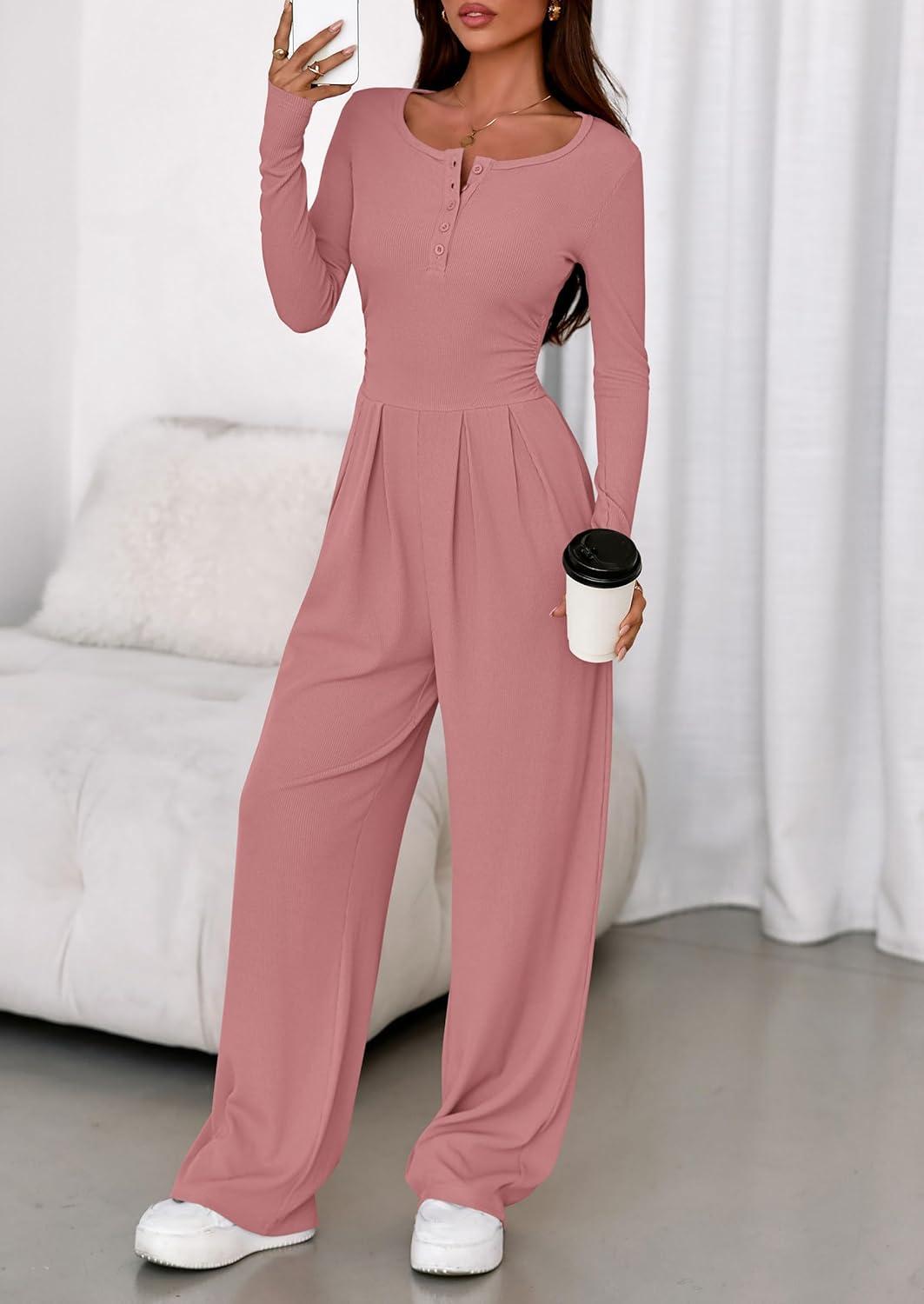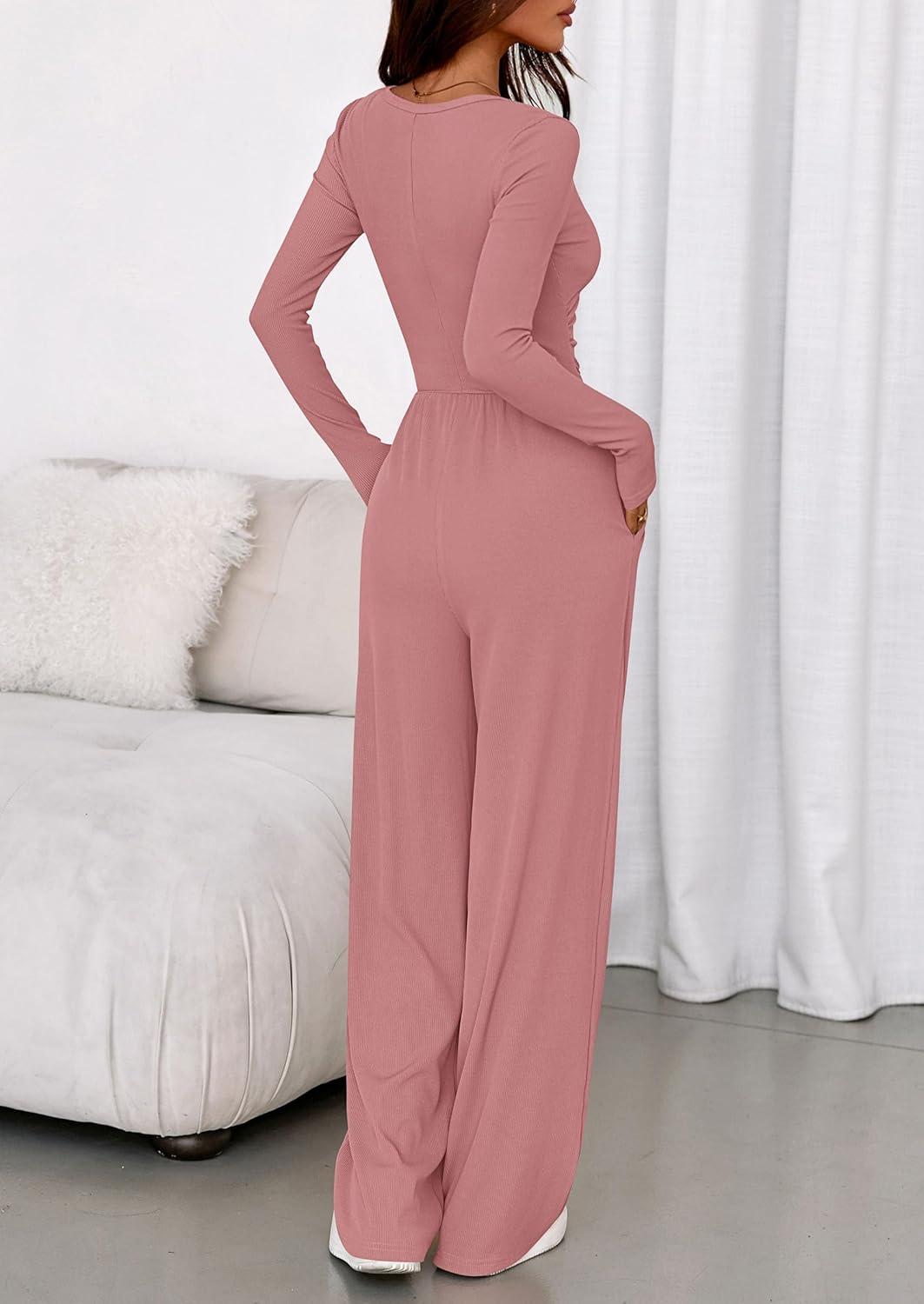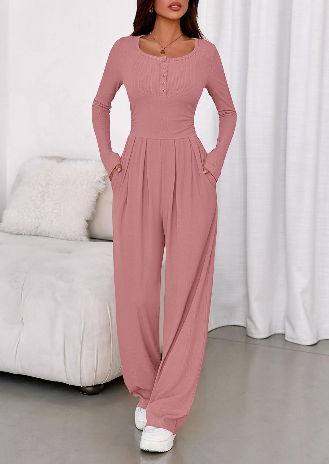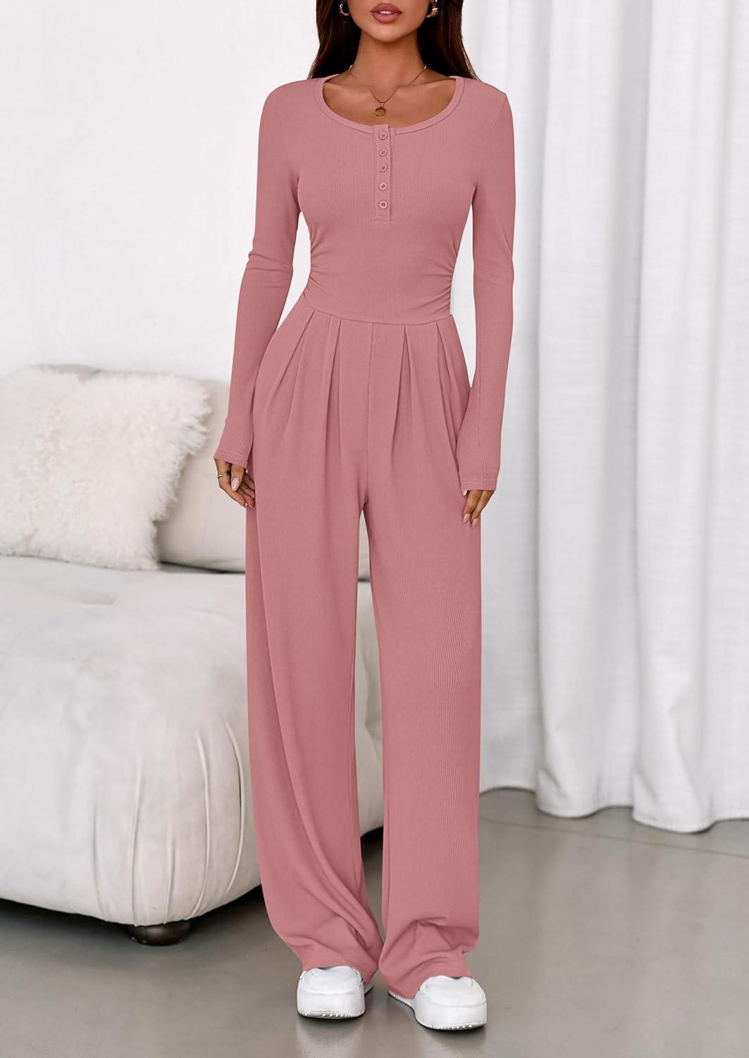 PRETTYGARDEN Jumpsuits for Women Dressy Casual 2025 Fall One Piece Outfits Long Sleeve Wide Leg Pants Romper Fashion Clothing(Pink)