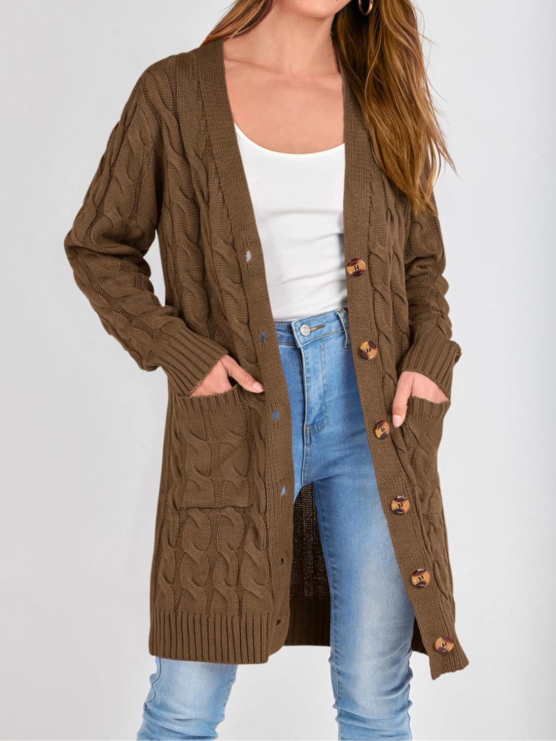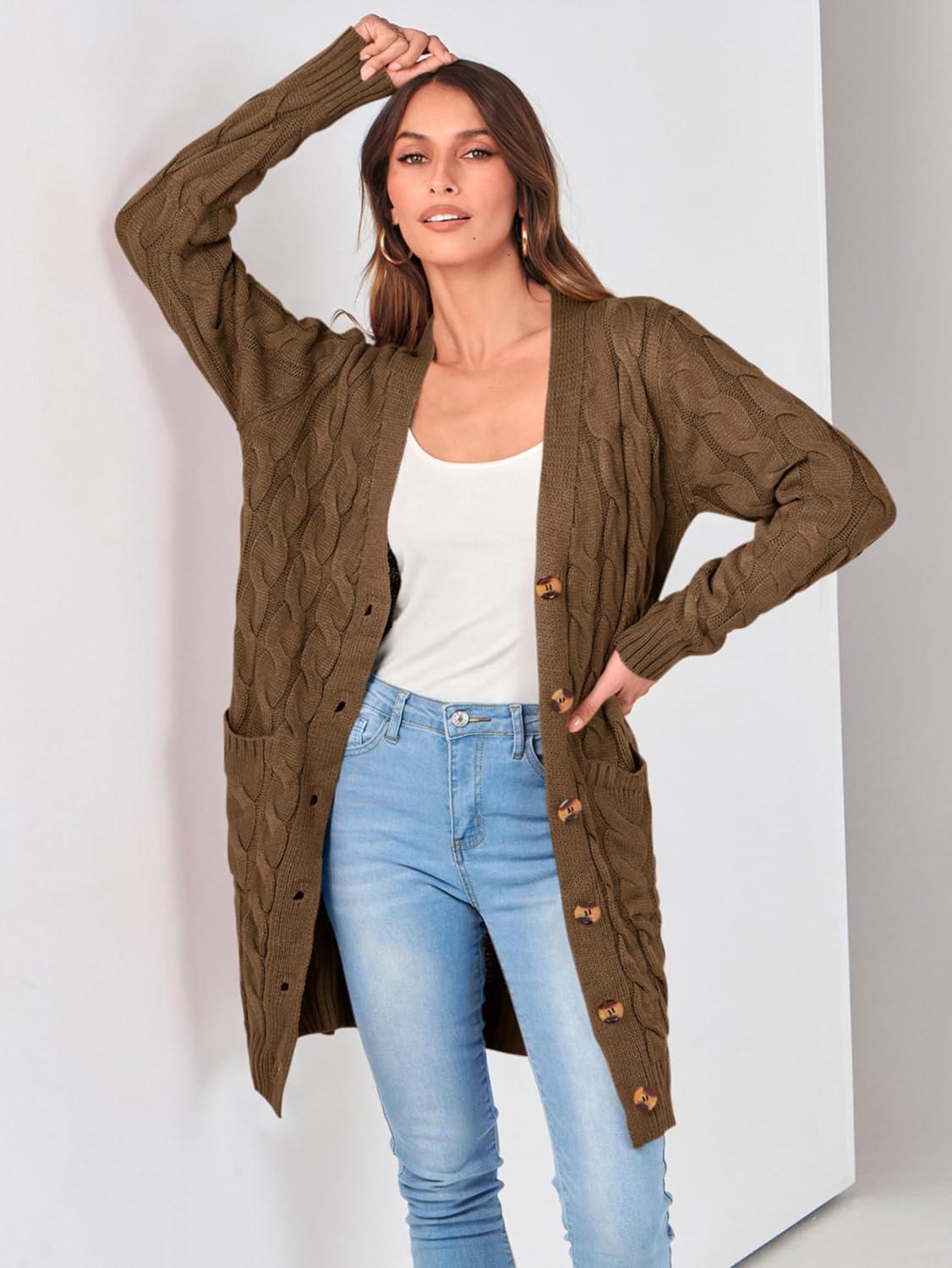 PRETTYGARDEN Long Sleeve Cable Knit Long Cardigan for Women 2025 Fall Winter Chunky Open Front Button Sweaters with Pockets(Coffee)