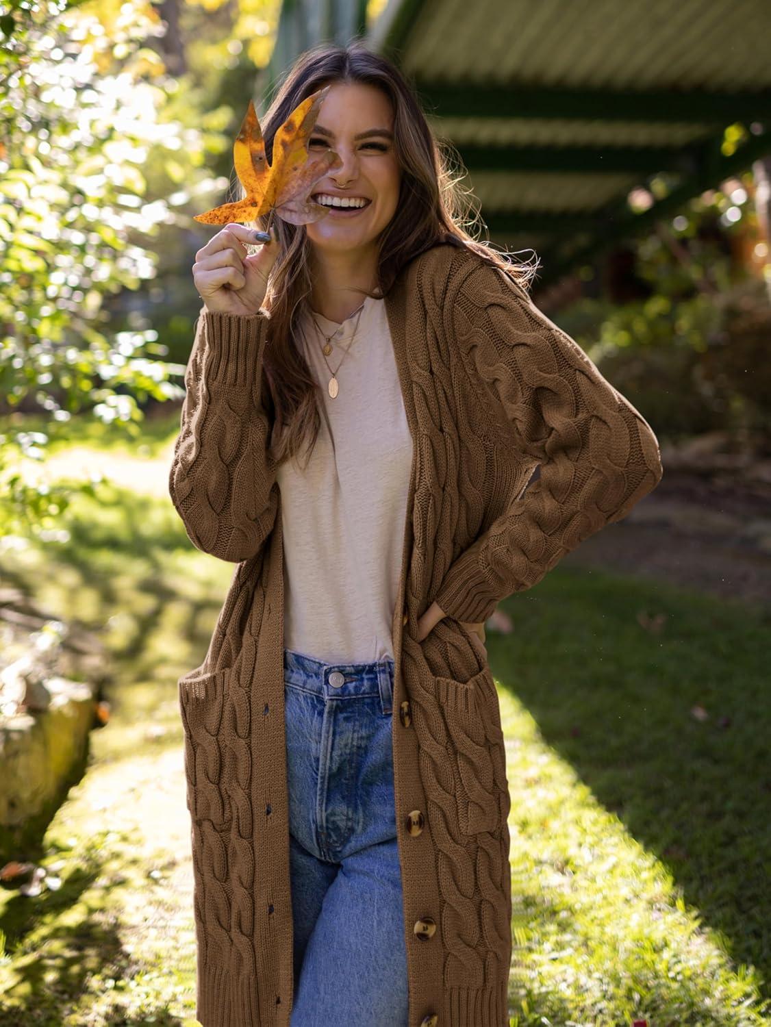 PRETTYGARDEN Long Sleeve Cable Knit Long Cardigan for Women 2025 Fall Winter Chunky Open Front Button Sweaters with Pockets(Caramel)