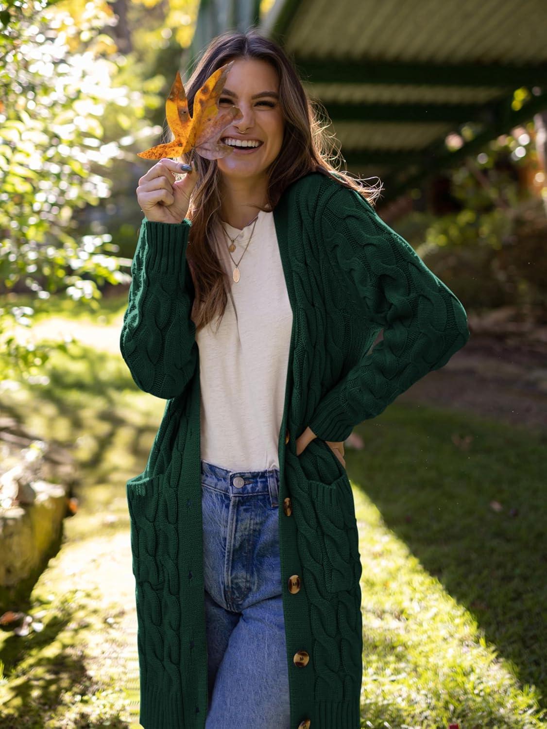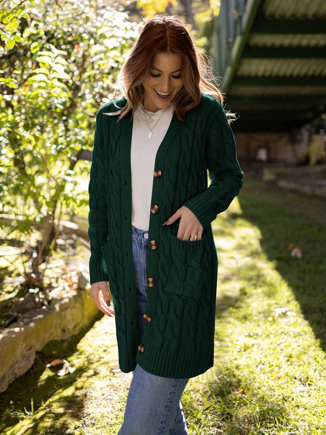 PRETTYGARDEN Long Sleeve Cable Knit Long Cardigan for Women 2025 Fall Winter Chunky Open Front Button Sweaters with Pockets(Dark Green)