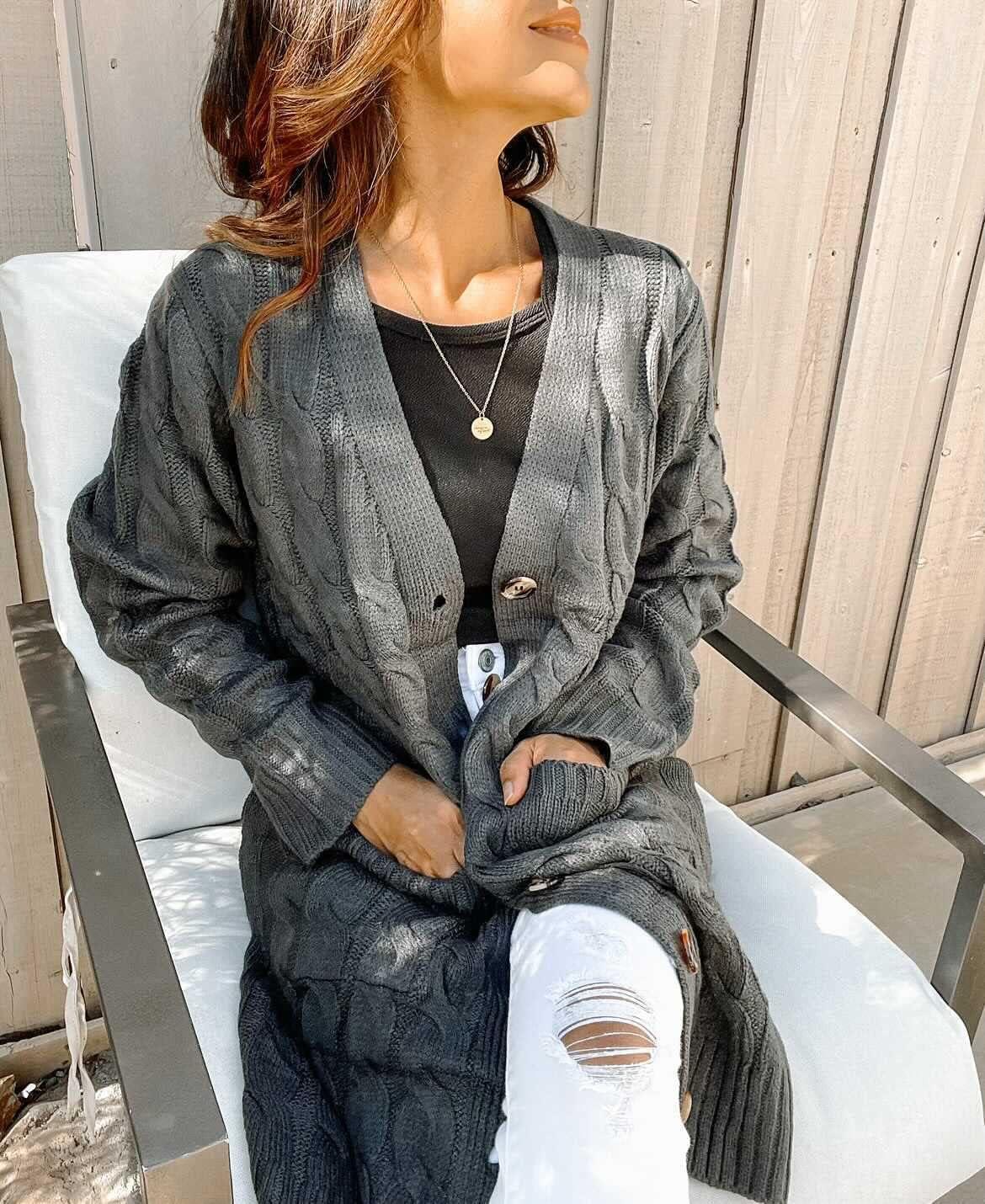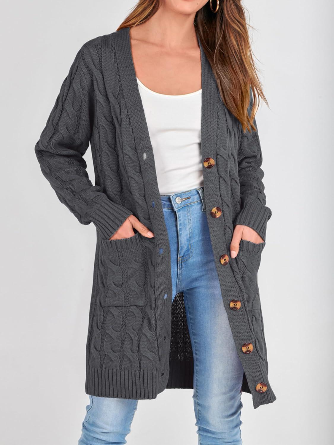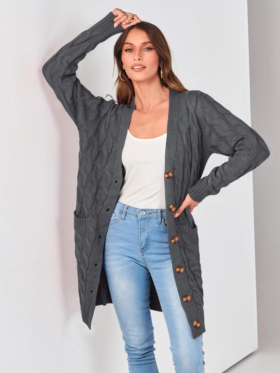 PRETTYGARDEN Long Sleeve Cable Knit Long Cardigan for Women 2025 Fall Winter Chunky Open Front Button Sweaters with Pockets(Dark Grey)