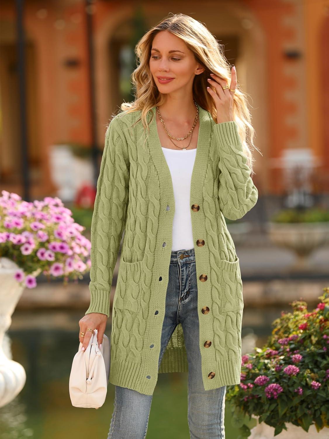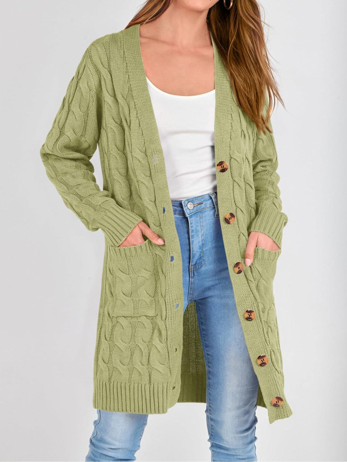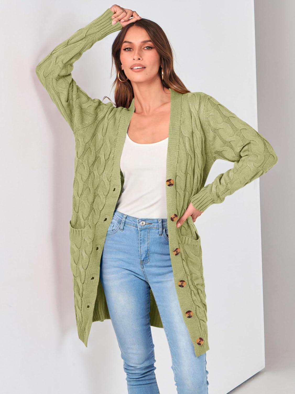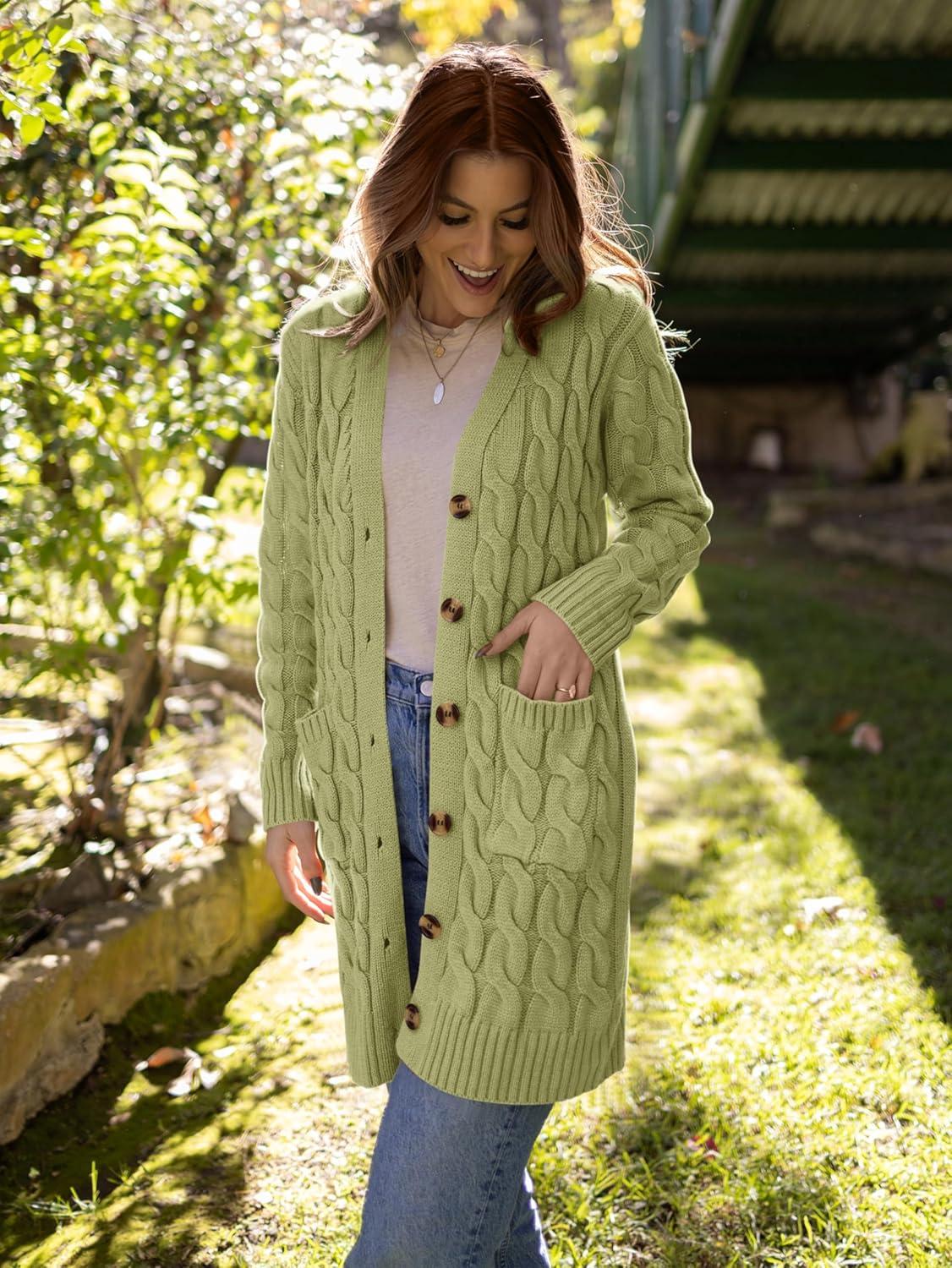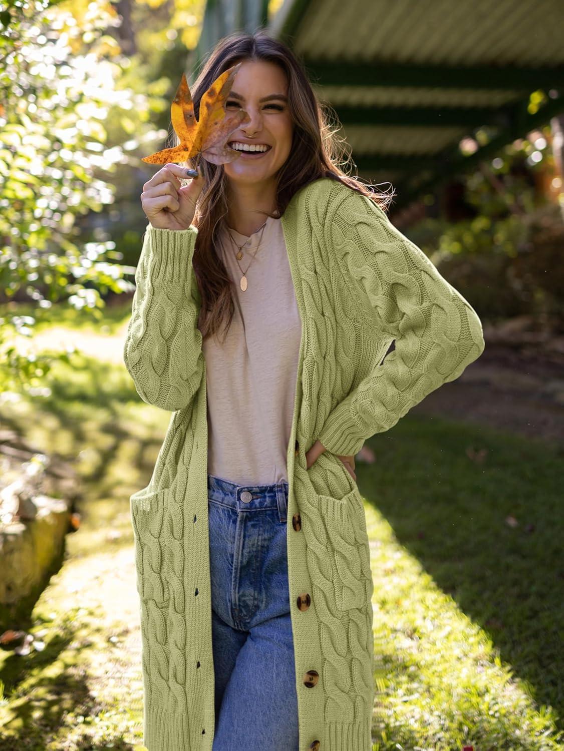 PRETTYGARDEN Long Sleeve Cable Knit Long Cardigan for Women 2025 Fall Winter Chunky Open Front Button Sweaters with Pockets(Olive Green)