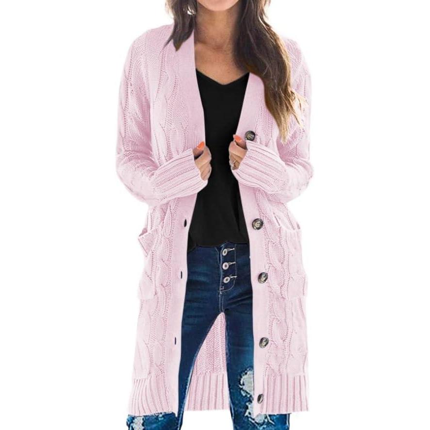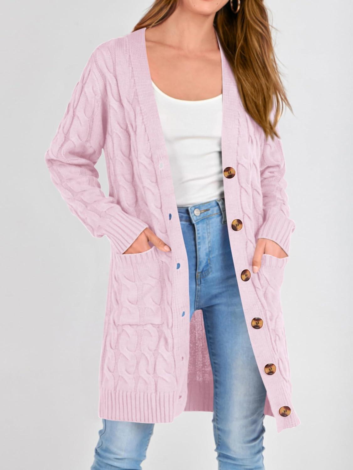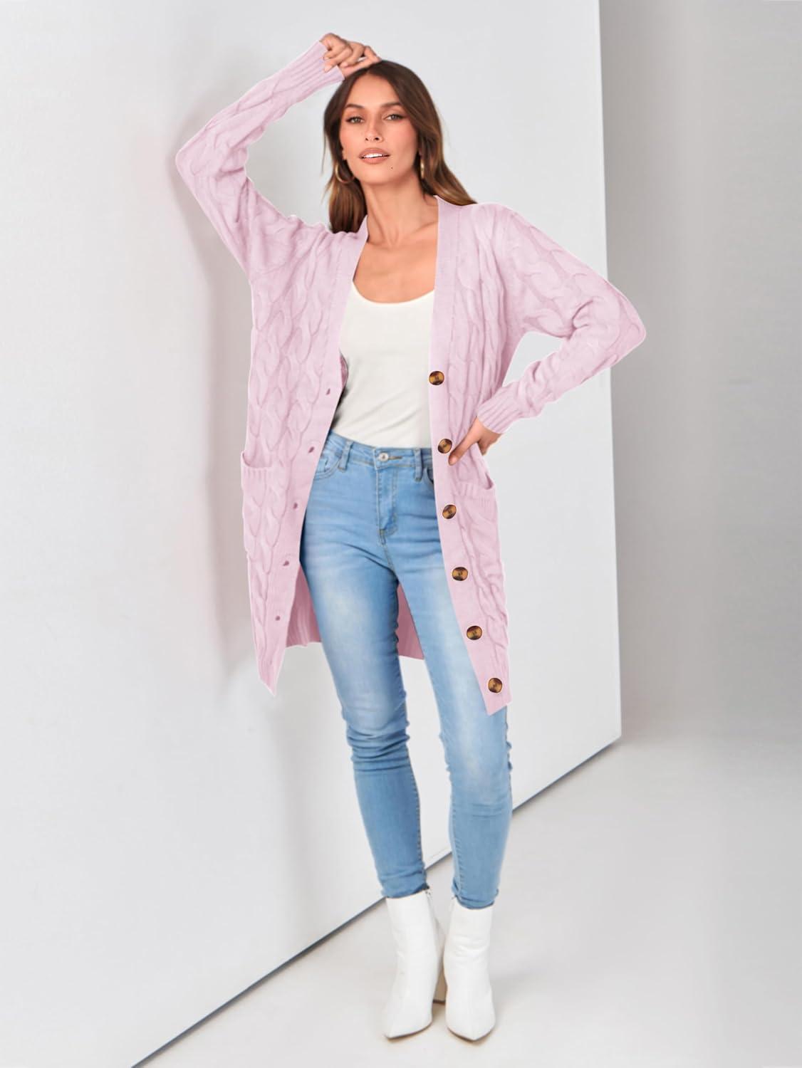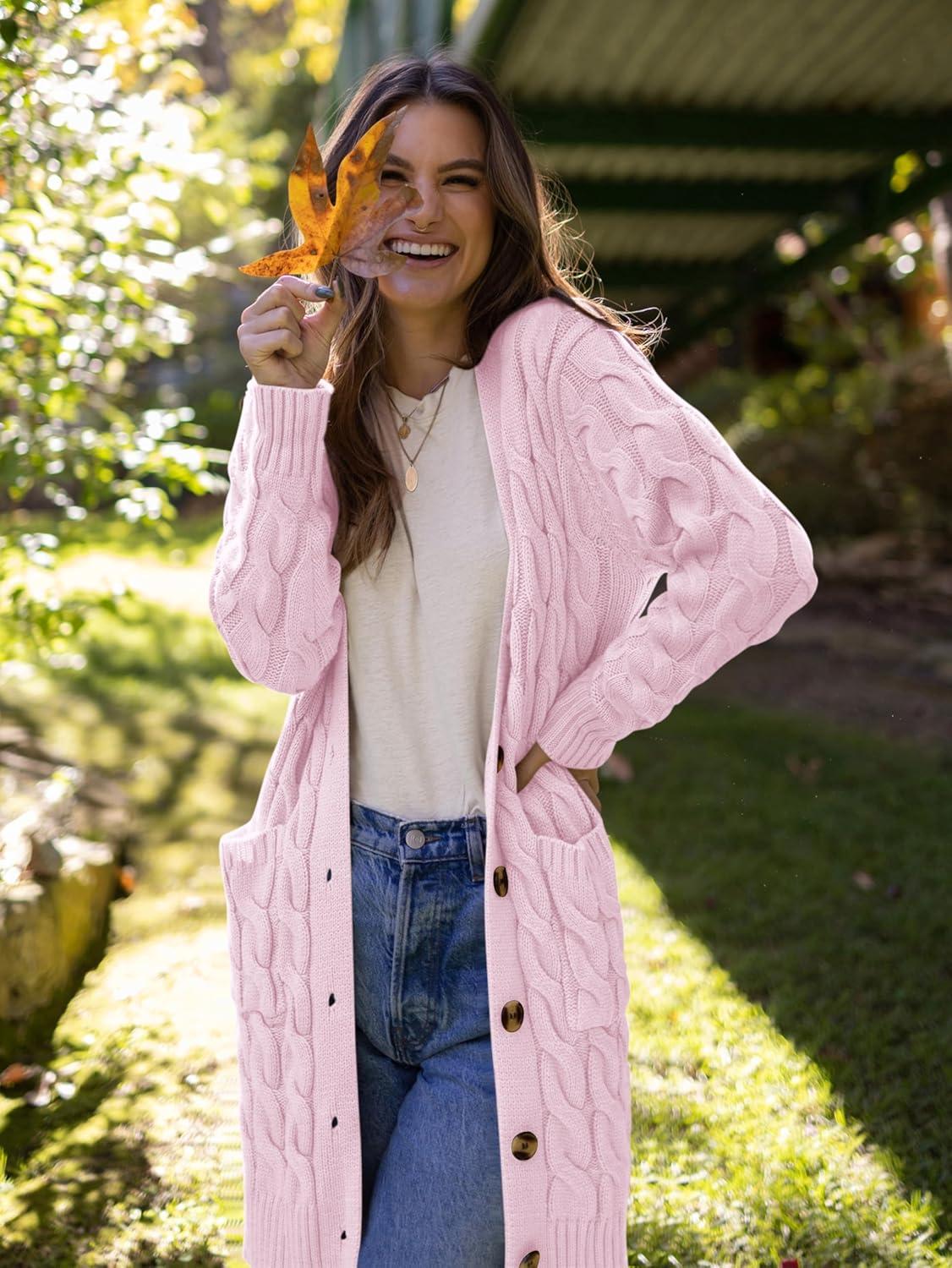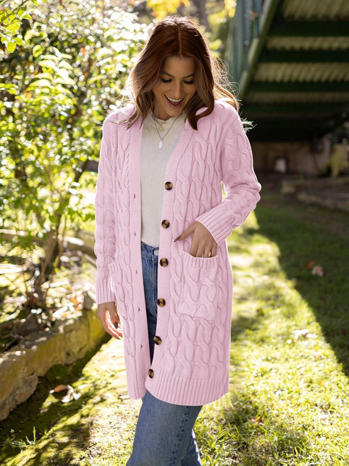 PRETTYGARDEN Long Sleeve Cable Knit Long Cardigan for Women 2025 Fall Winter Chunky Open Front Button Sweaters with Pockets(Pink)