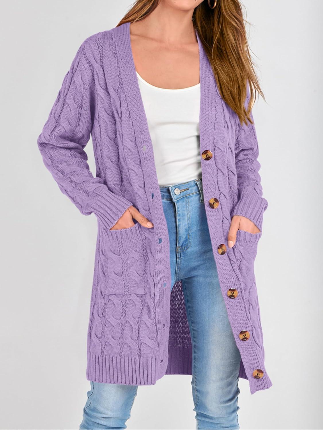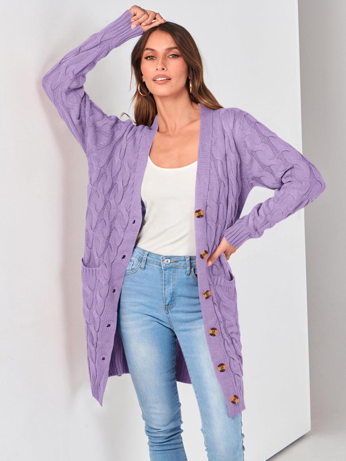 PRETTYGARDEN Long Sleeve Cable Knit Long Cardigan for Women 2025 Fall Winter Chunky Open Front Button Sweaters with Pockets(Purple)