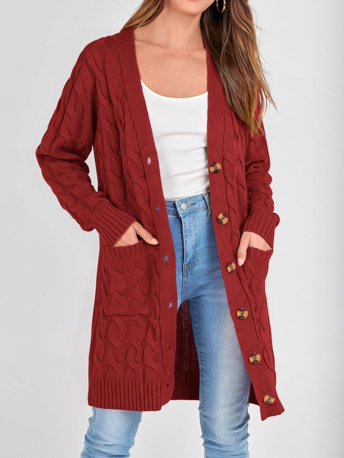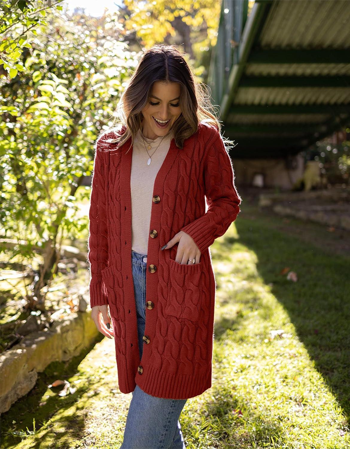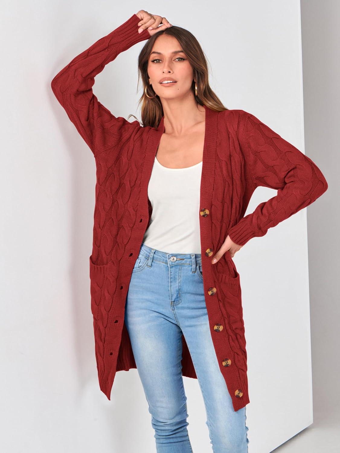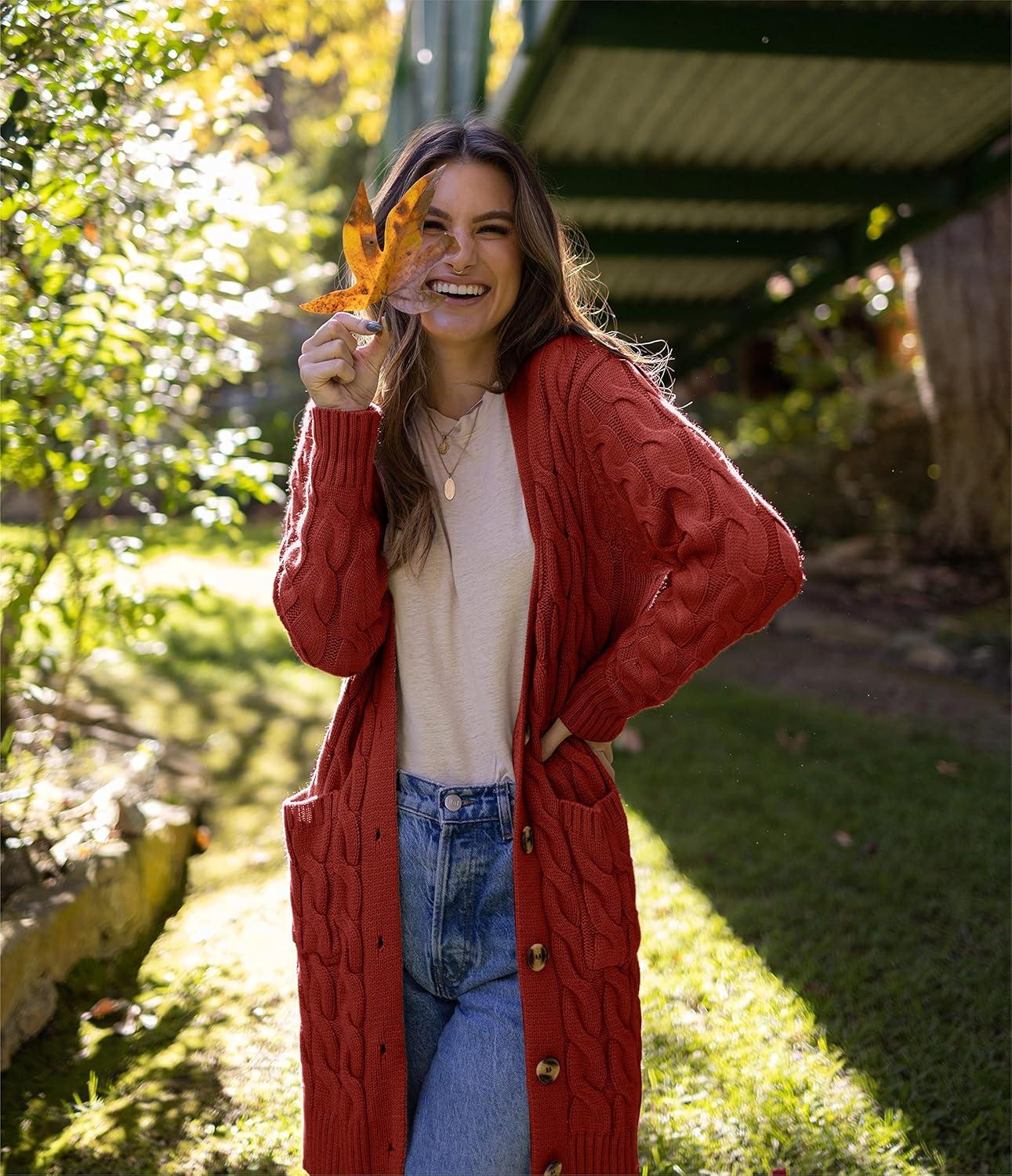 PRETTYGARDEN Long Sleeve Cable Knit Long Cardigan for Women 2025 Fall Winter Chunky Open Front Button Sweaters with Pockets(Rust Red)