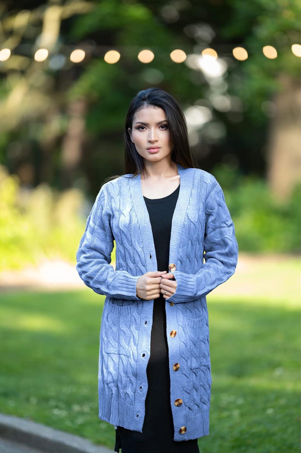 PRETTYGARDEN Long Sleeve Cable Knit Long Cardigan for Women 2025 Fall Winter Chunky Open Front Button Sweaters with Pockets(Sky Blue)